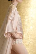 A must-have of the house. Julia lace is inlaid on the neckline and at the bottom of this silk caraco that will enhance any outfit.