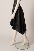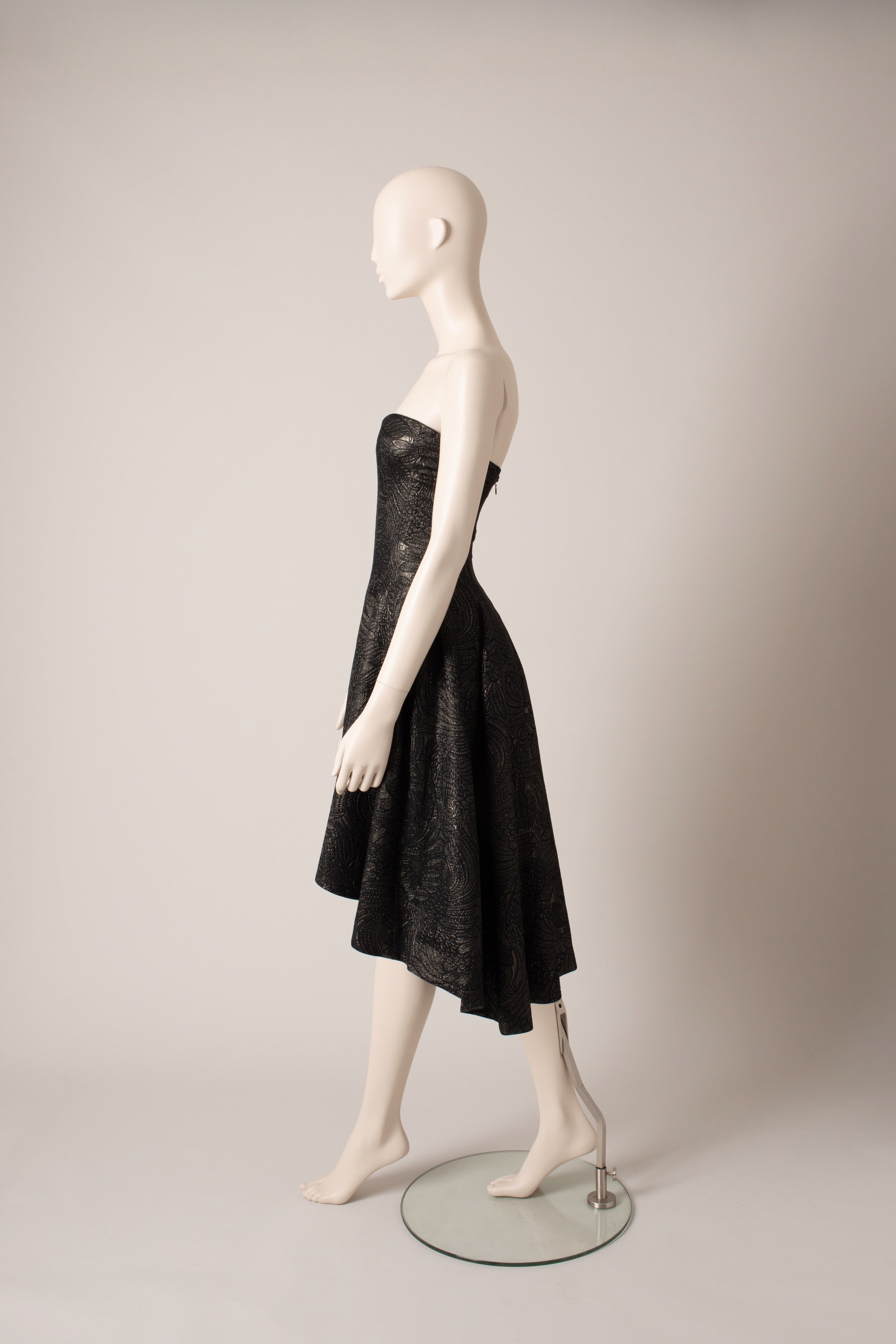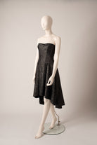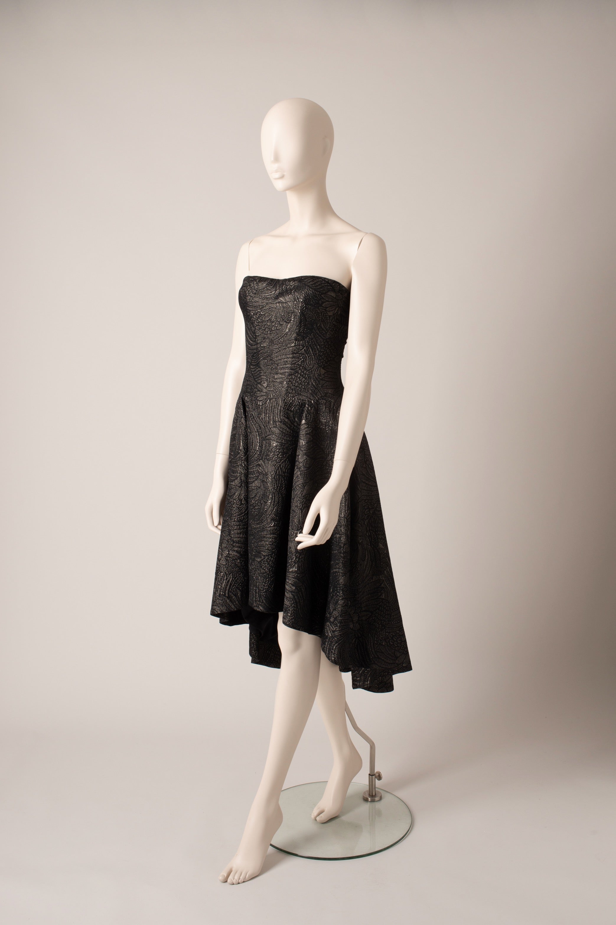 Strapless dress with asymmetrical flared skirt. Knee length.