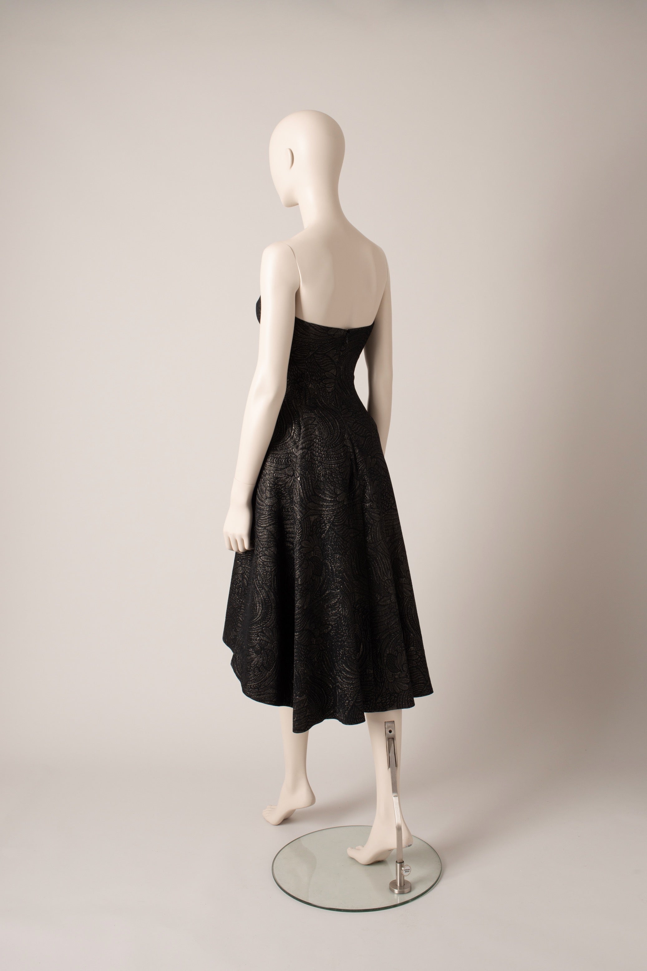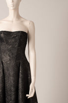 The Passerin jacquard, with its patterns of large foliage with silver highlights, illuminates this bustier dress. Wired bustier and godets dress. Lined with lycra silk. Zipper on the back.