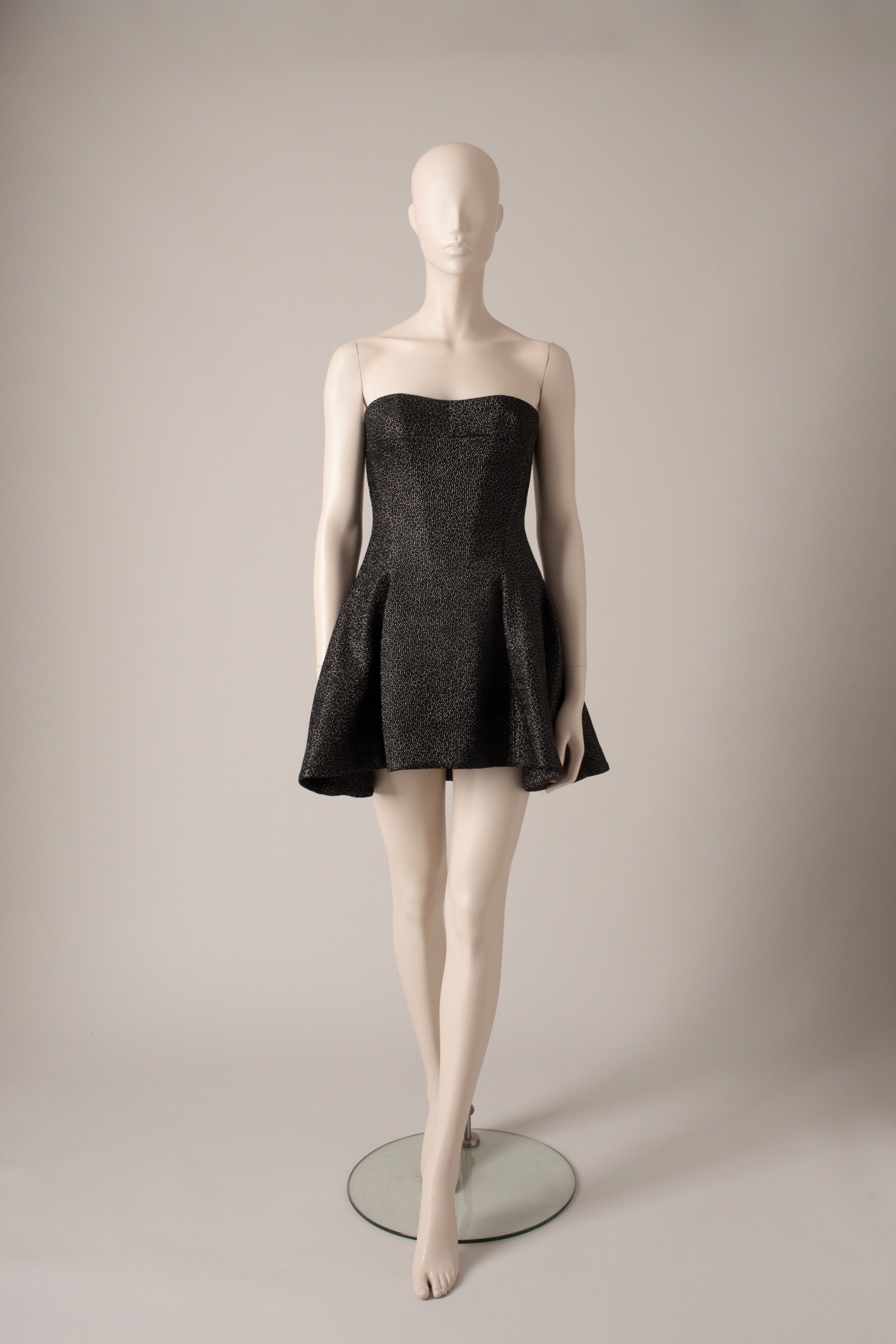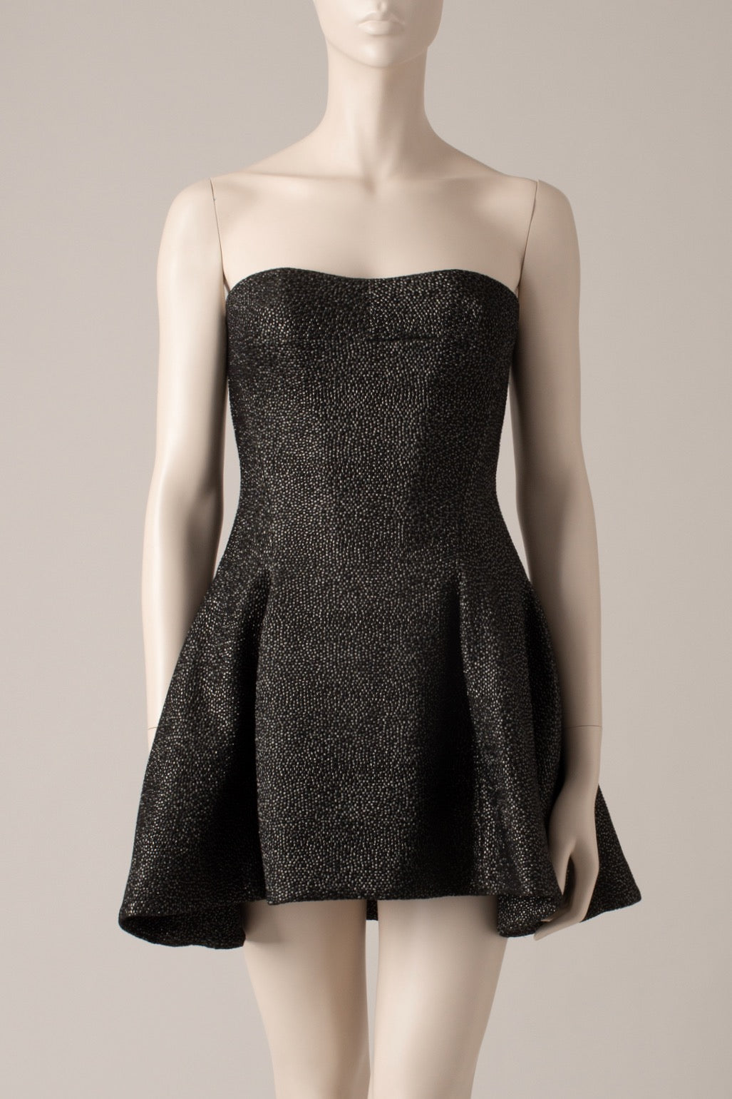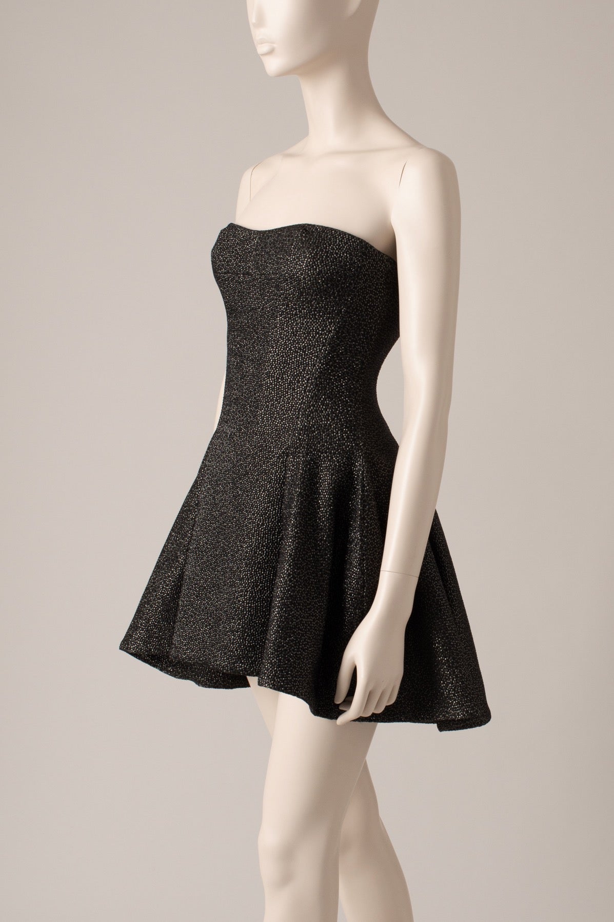 Strapless dress with asymmetrical flared skirt. Mini length.