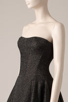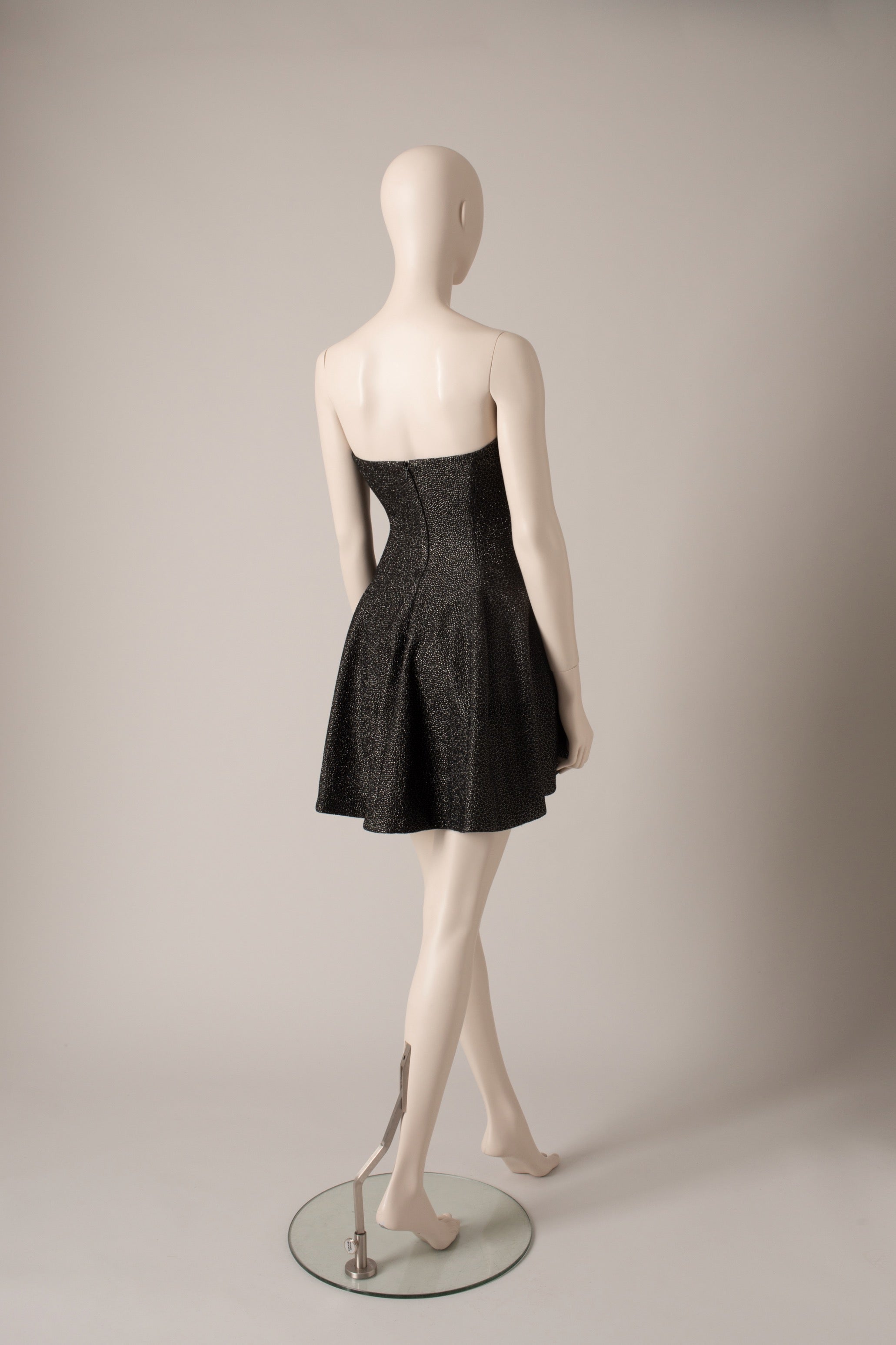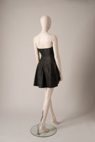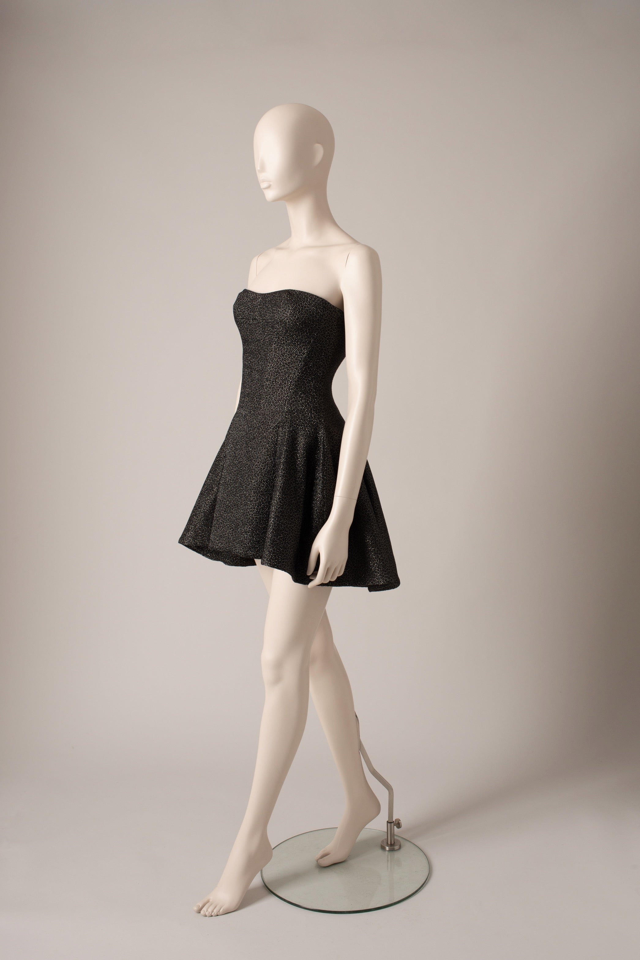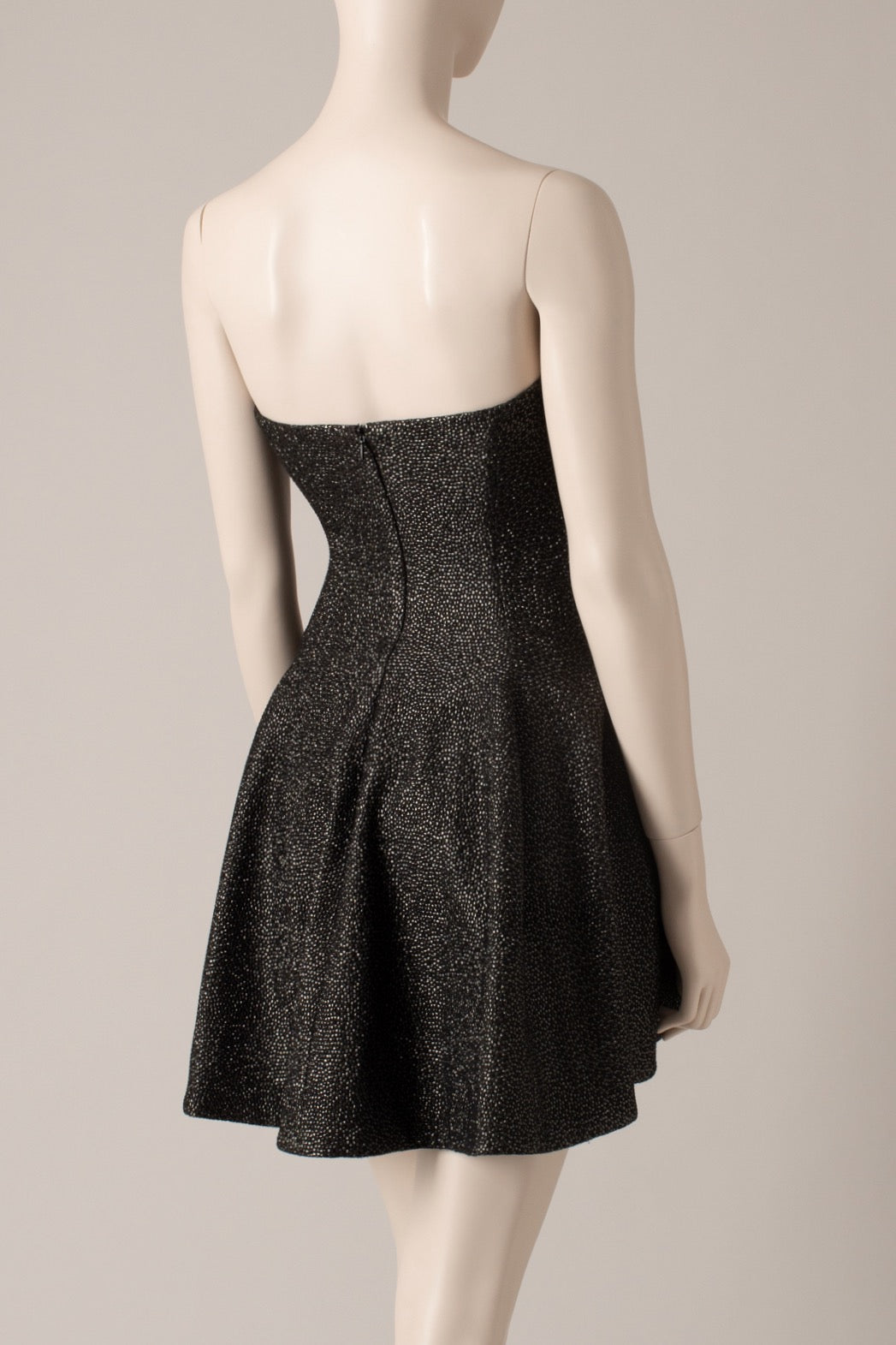 Strapless dress with asymmetrical flared skirt. Mini length.