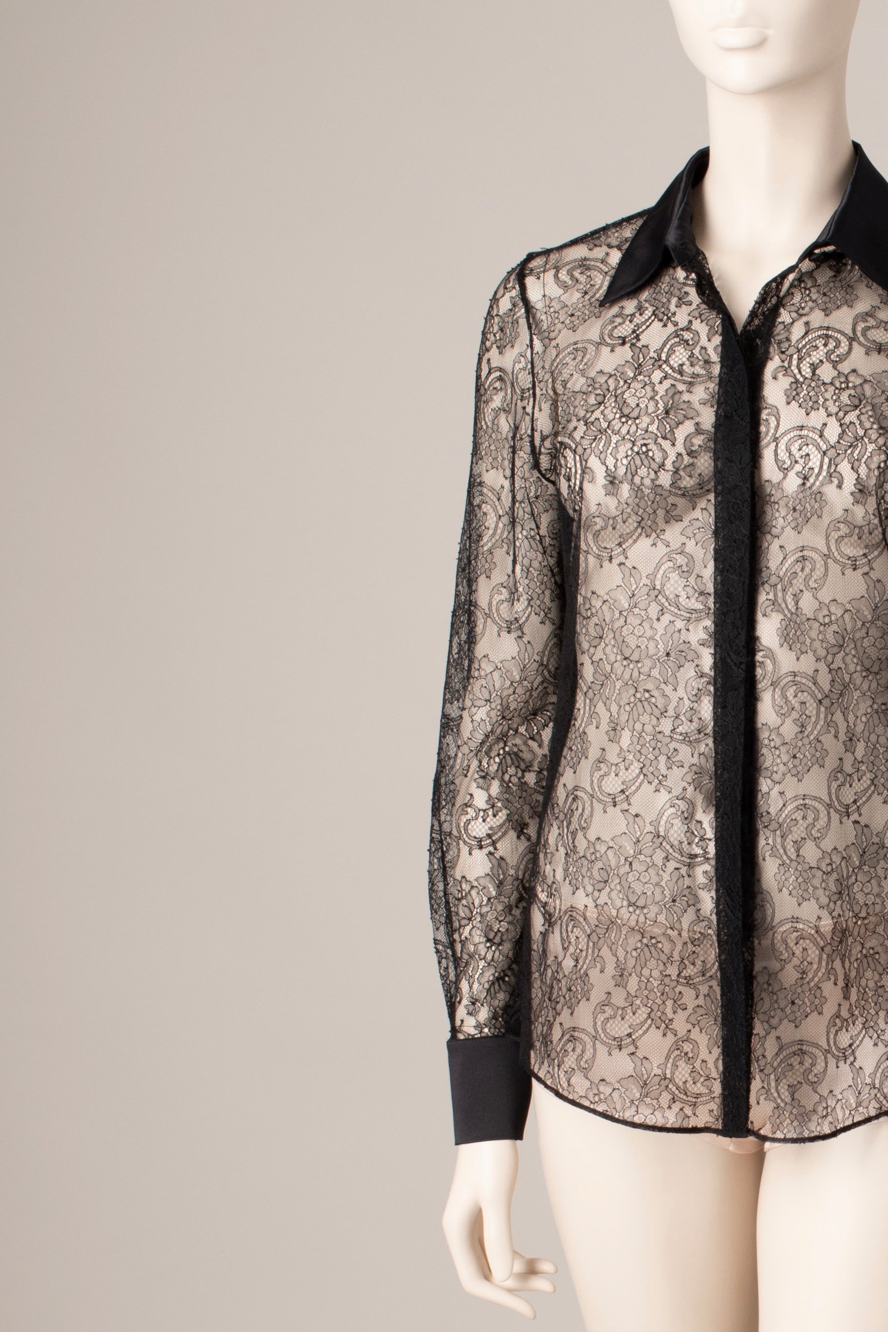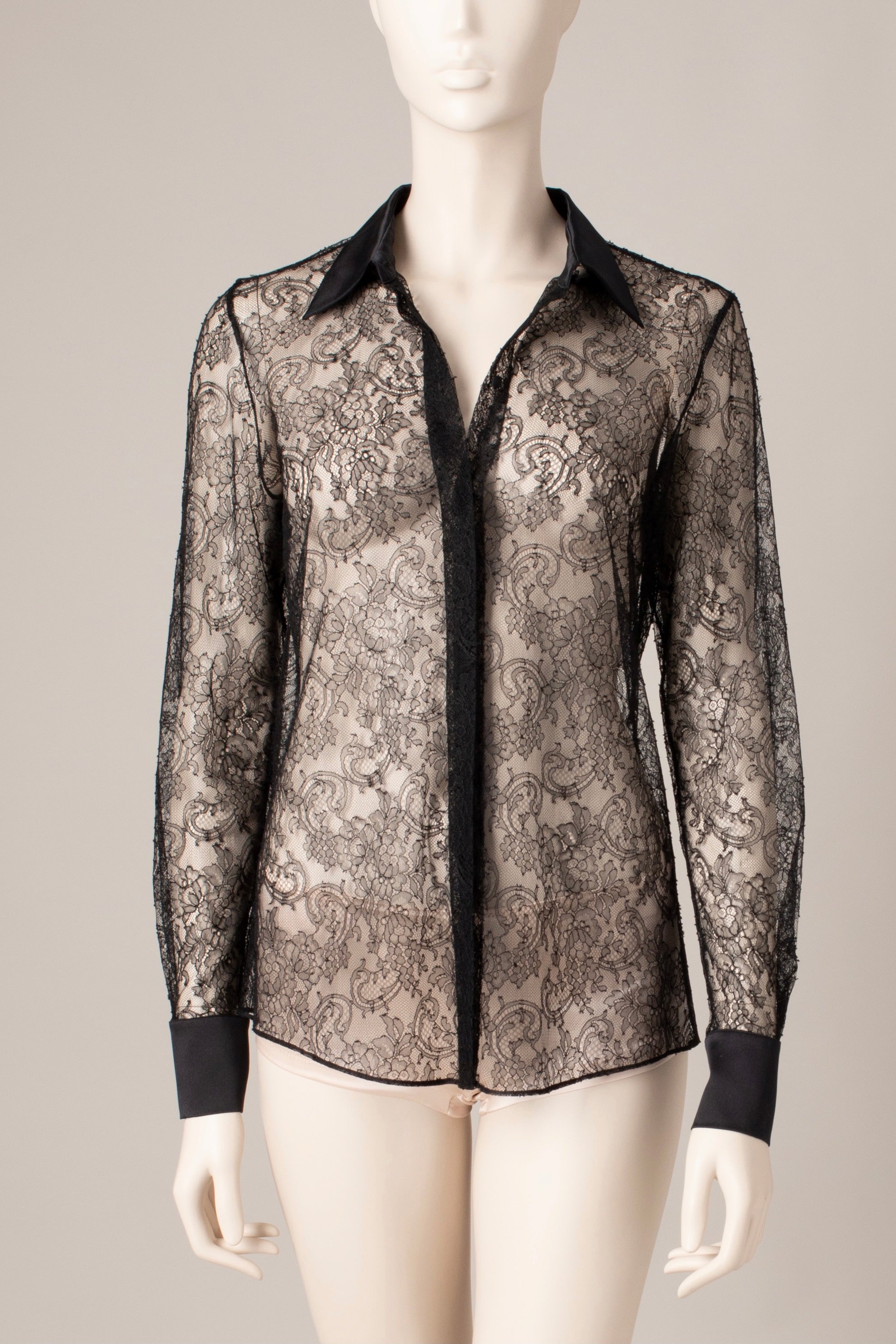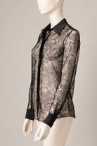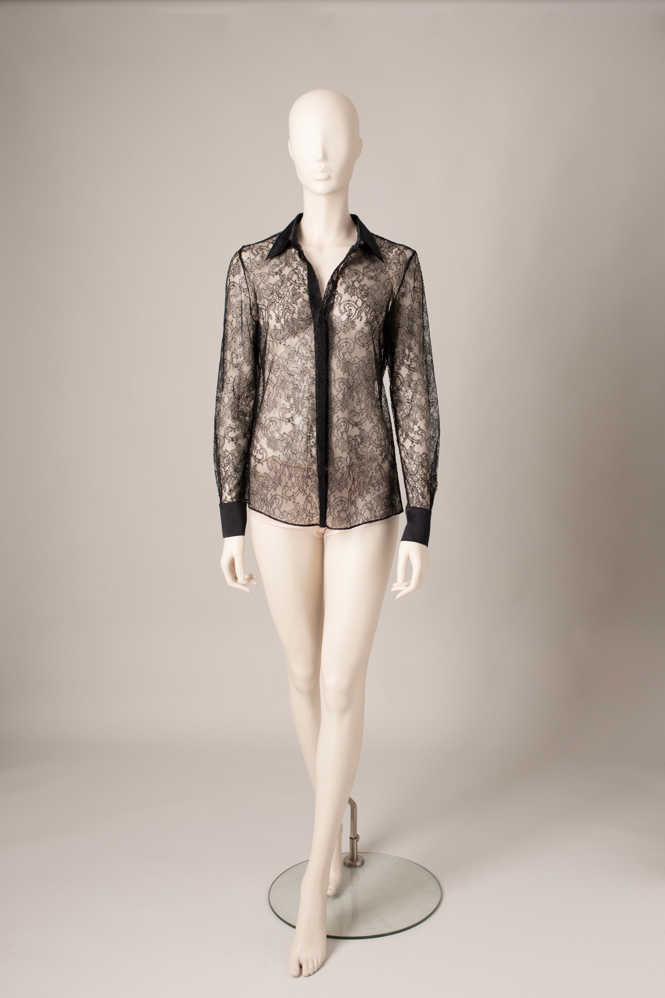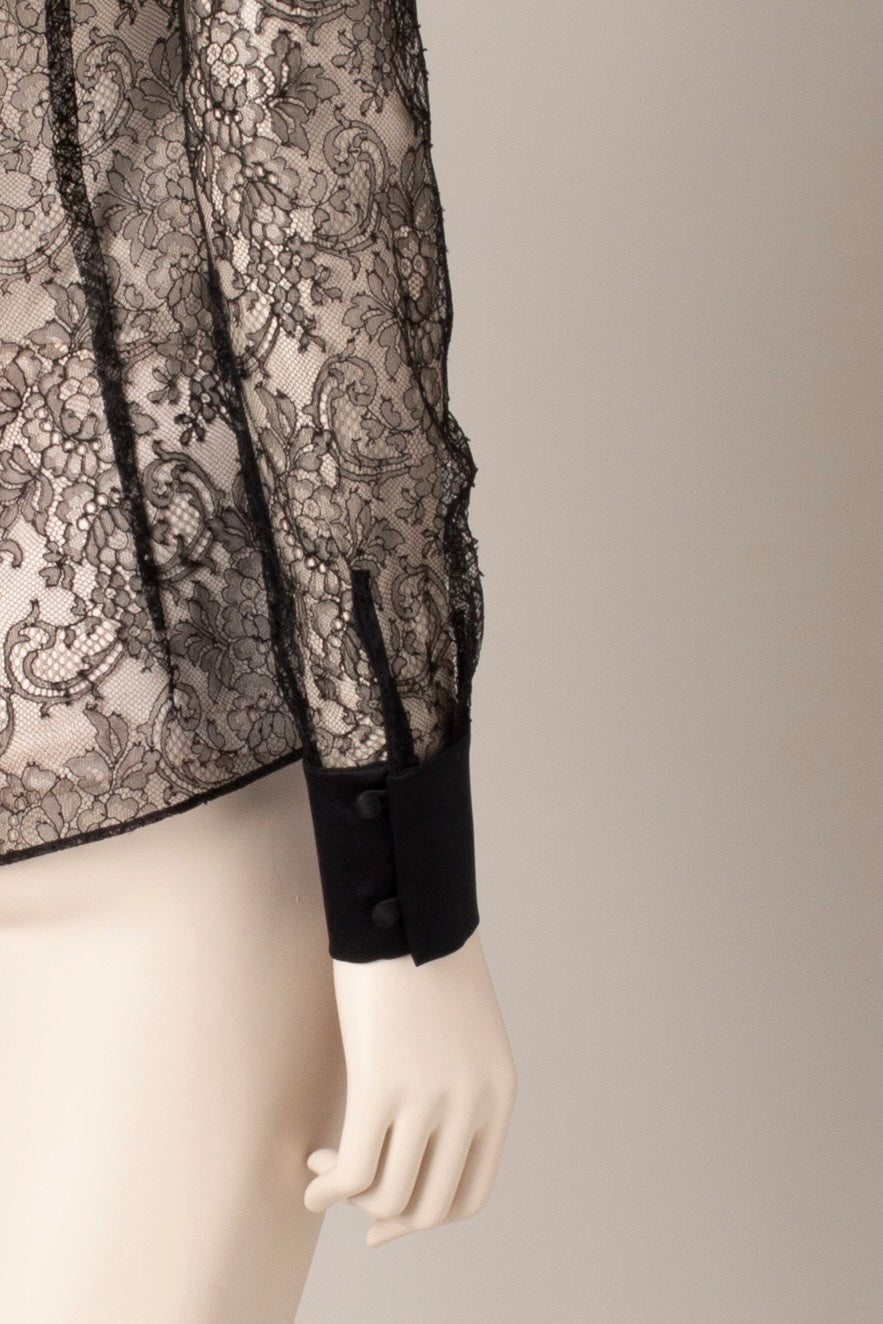 A lace shirt with its black lightweight silk finishes. A perfect piece to be worn with daywear or evening wear.