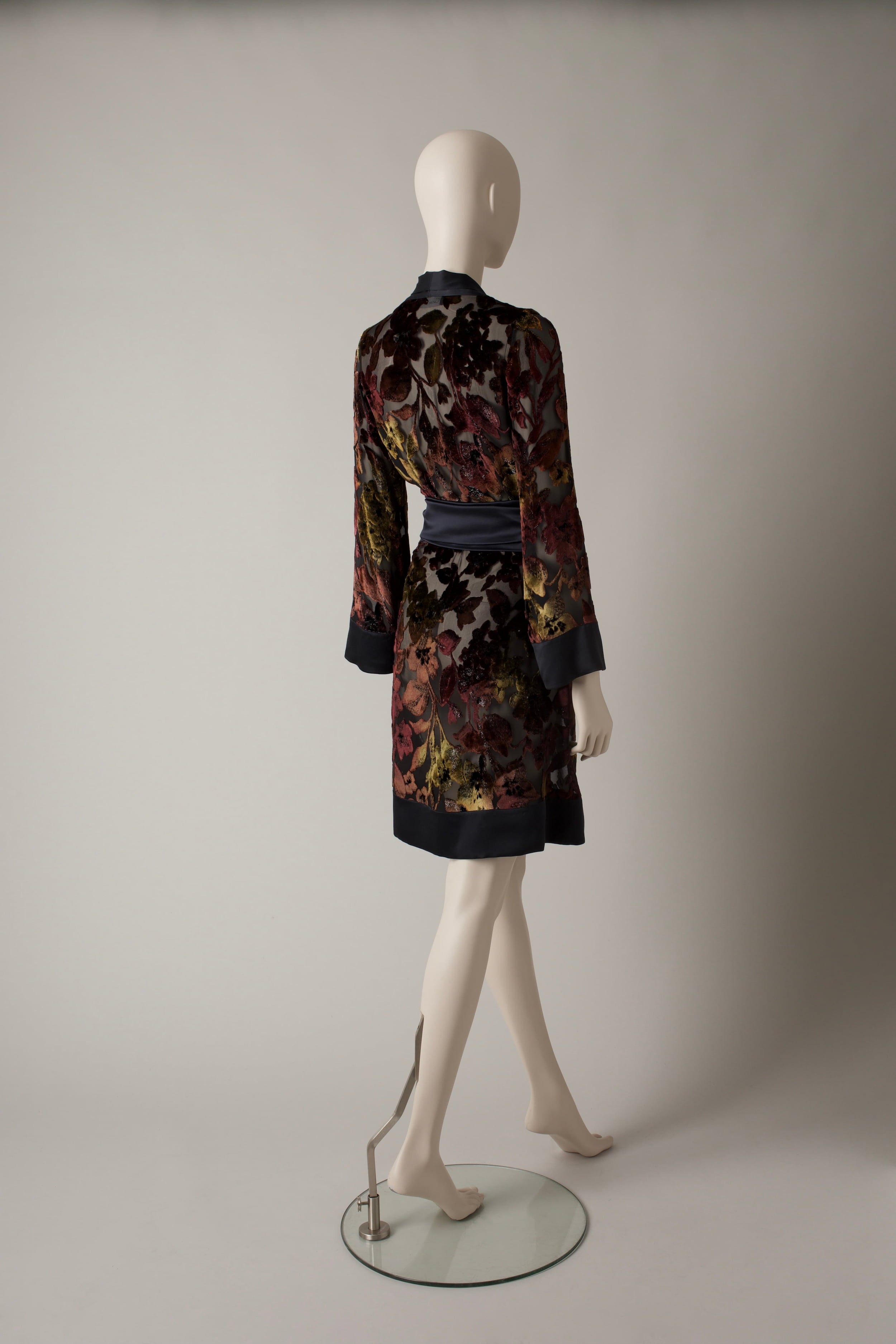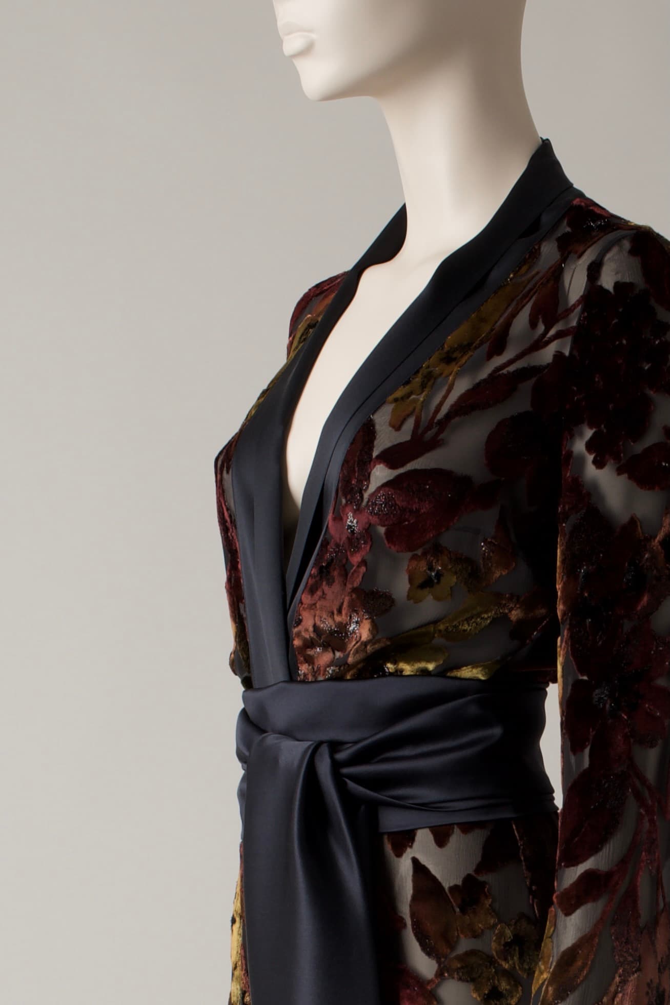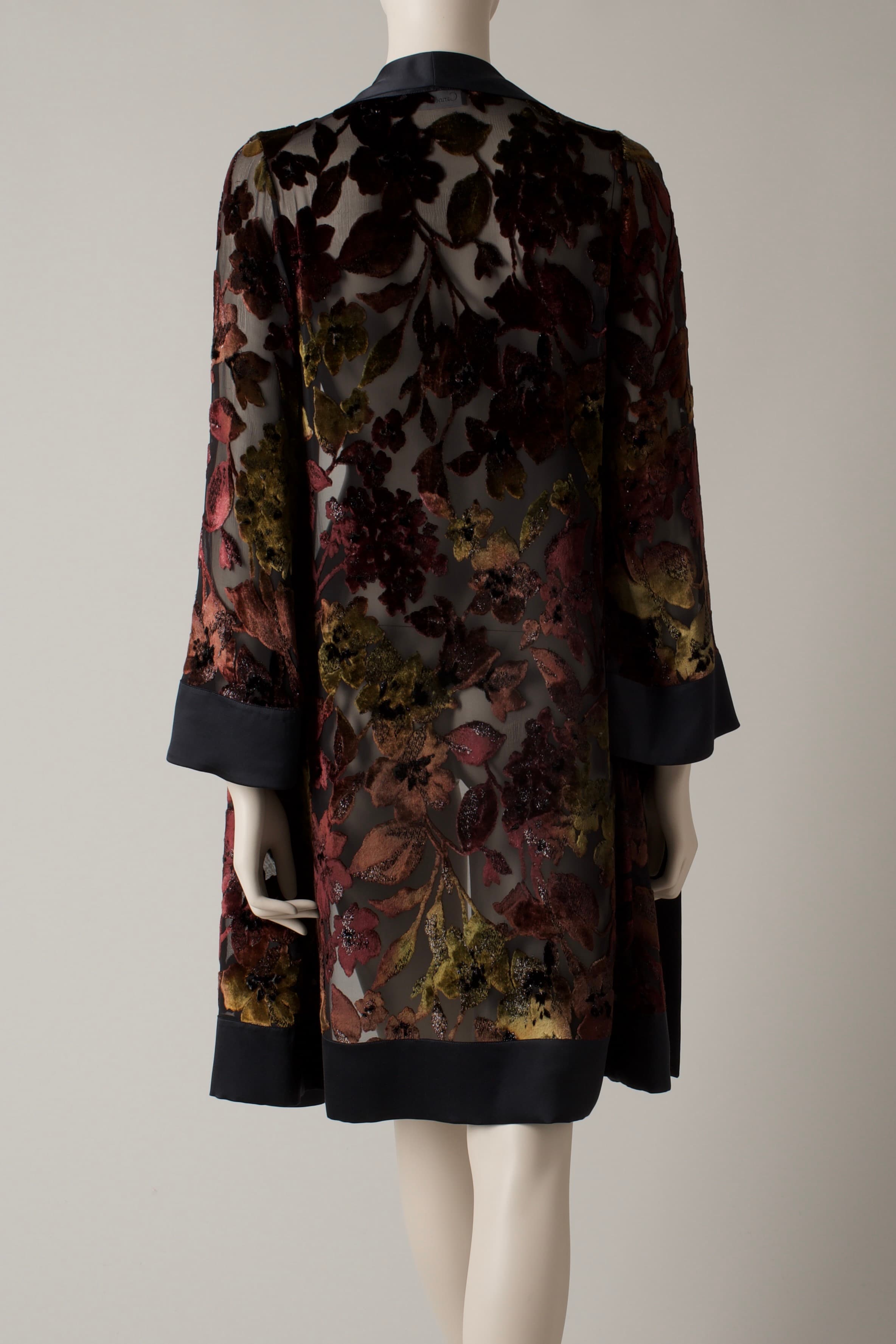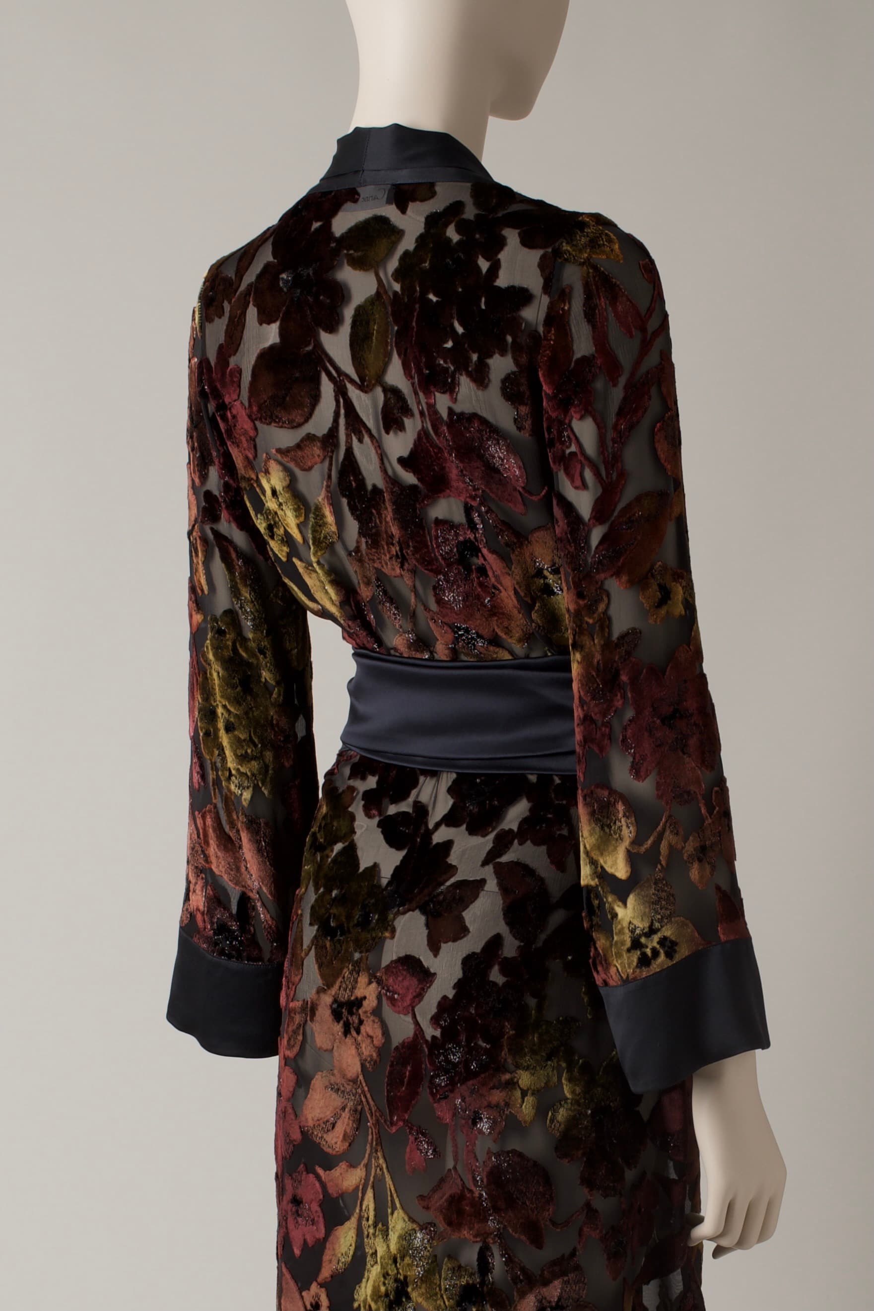 Long smoking jacket in devoured silk velvet. Hand-colored flowers and leaves are sprinkled with shiny thread, illuminating the delicate motif. Length 94cm approx.