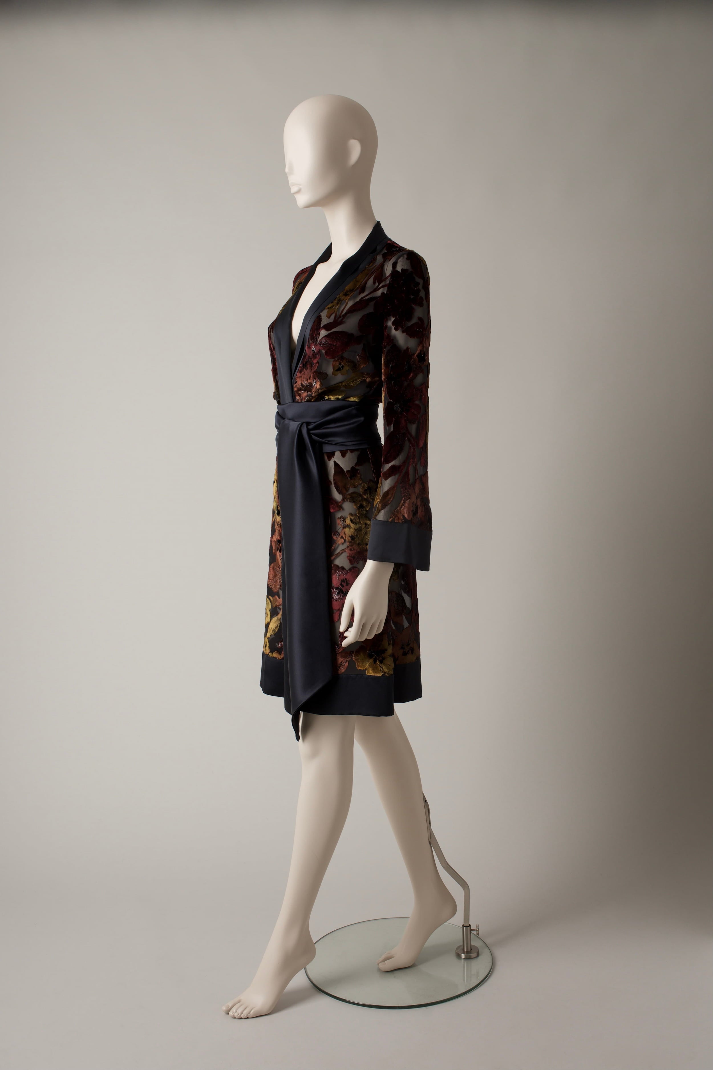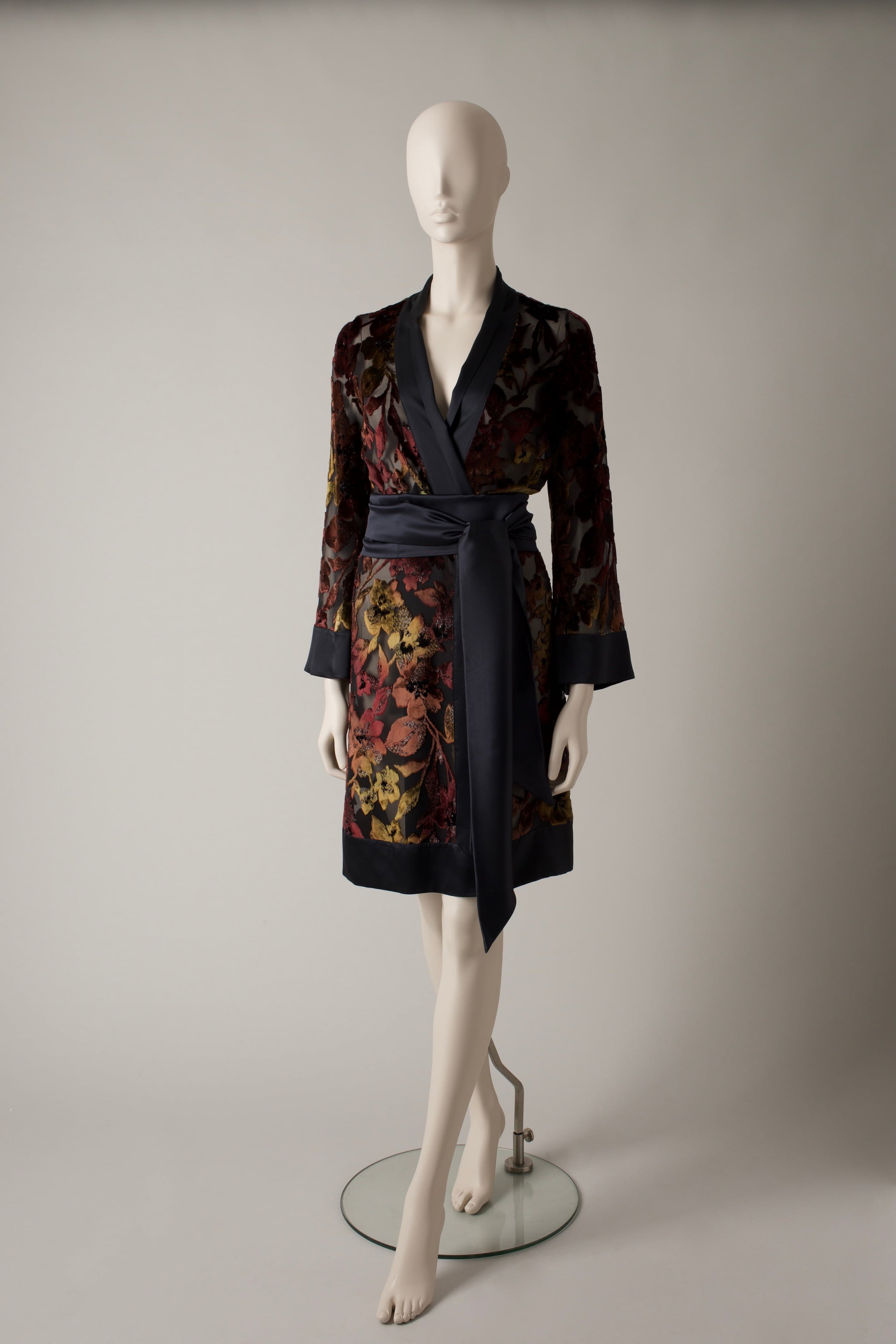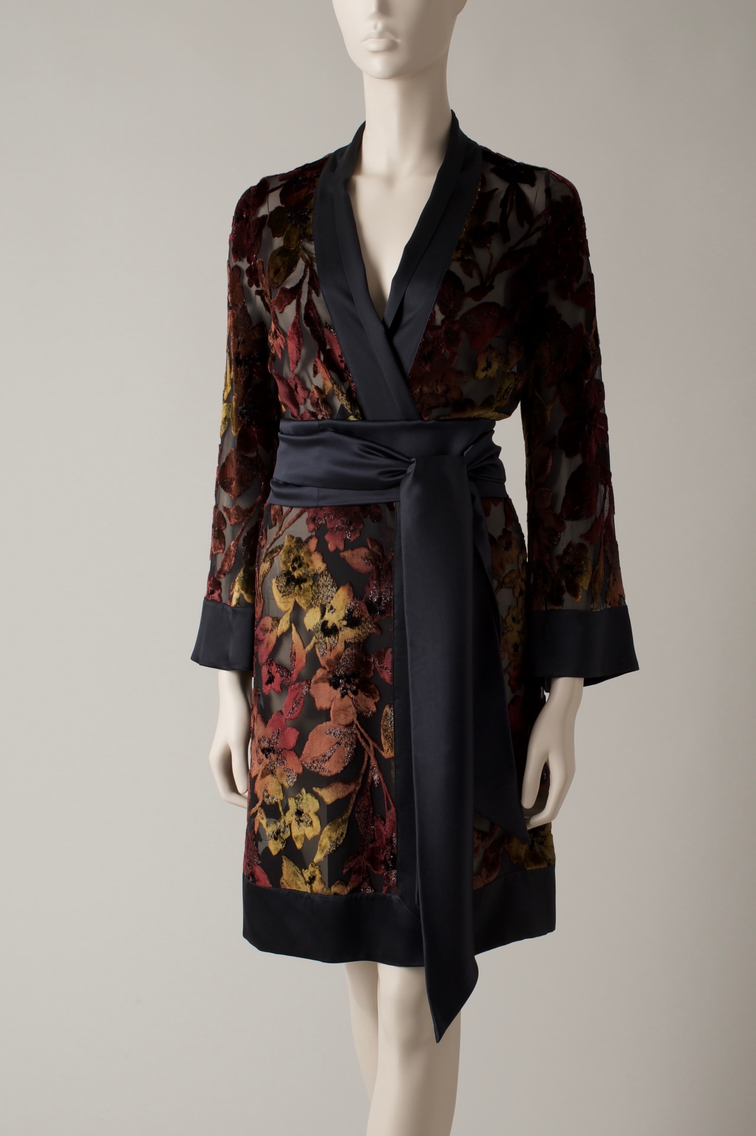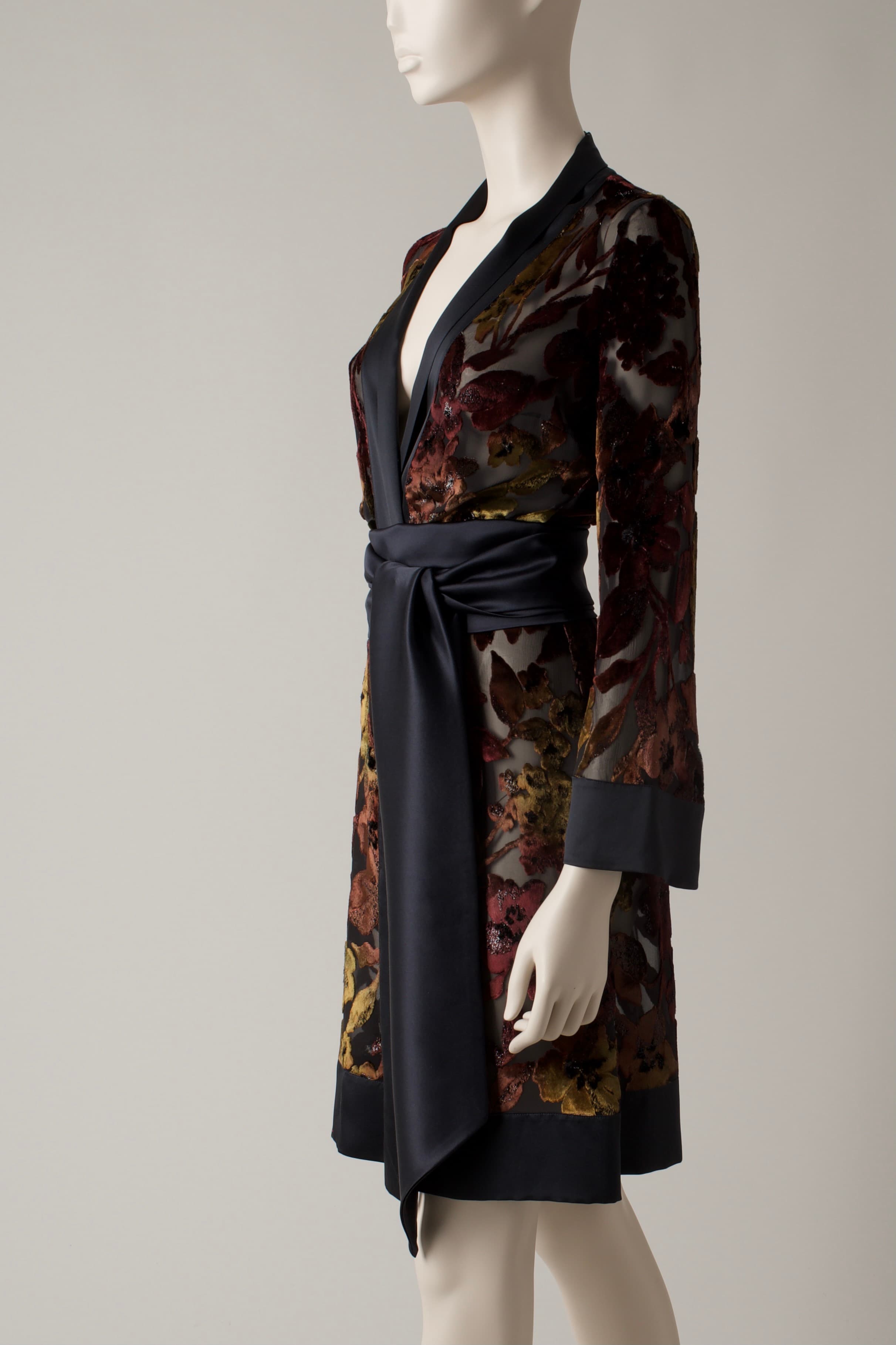 Long smoking jacket in devoured silk velvet. Hand-colored flowers and leaves are sprinkled with shiny thread, illuminating the delicate motif. Length 94cm approx.