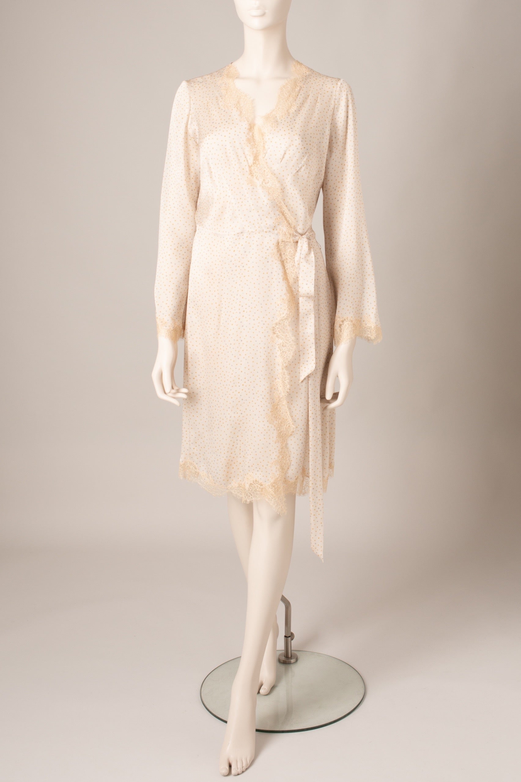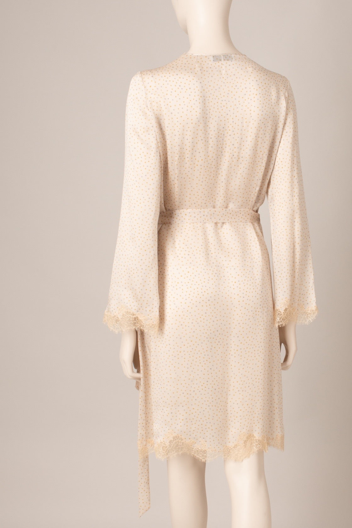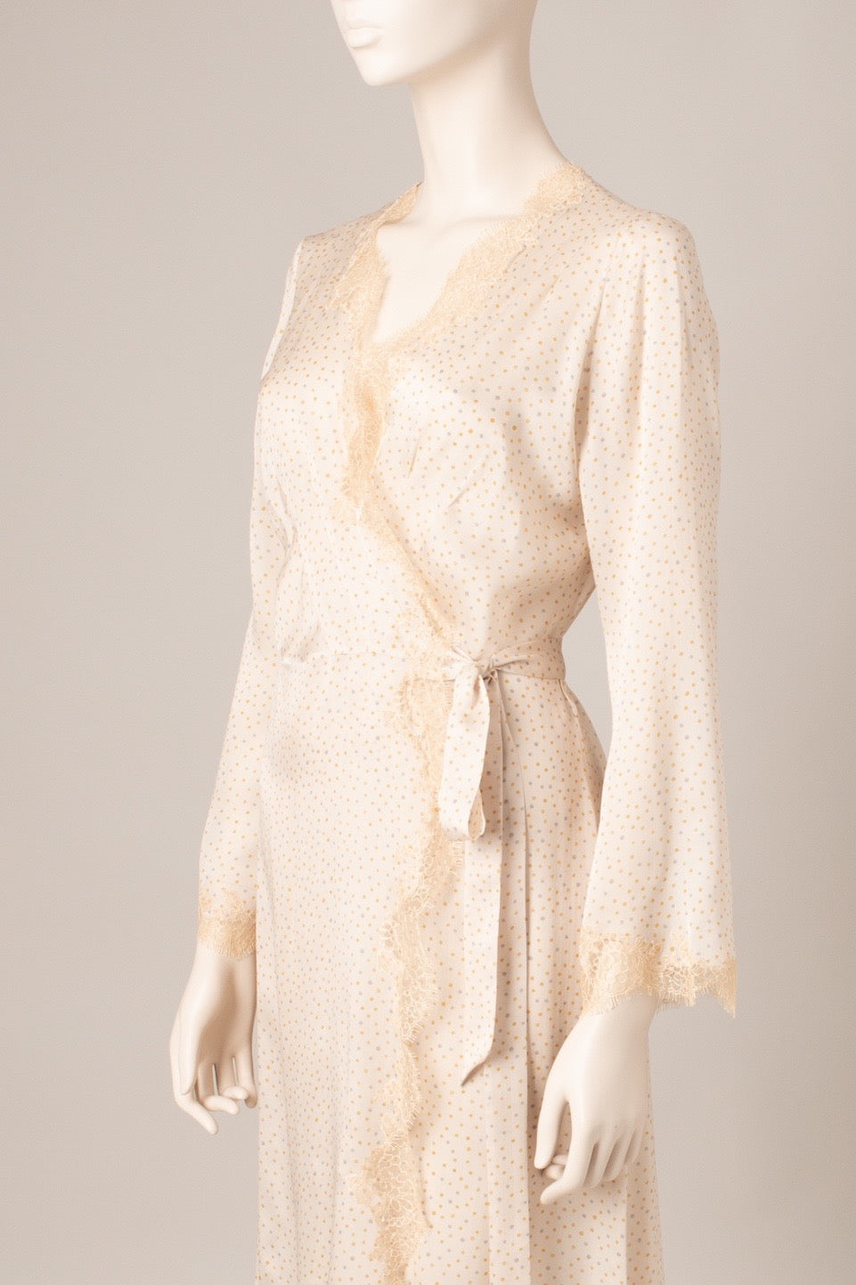 Egerie lace adorns the neckline and bottom of this wrap-around dress inspired by Skyfall deshabille, an iconic piece of the house. The light silk and its dotted print give it a more casual look.