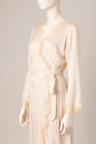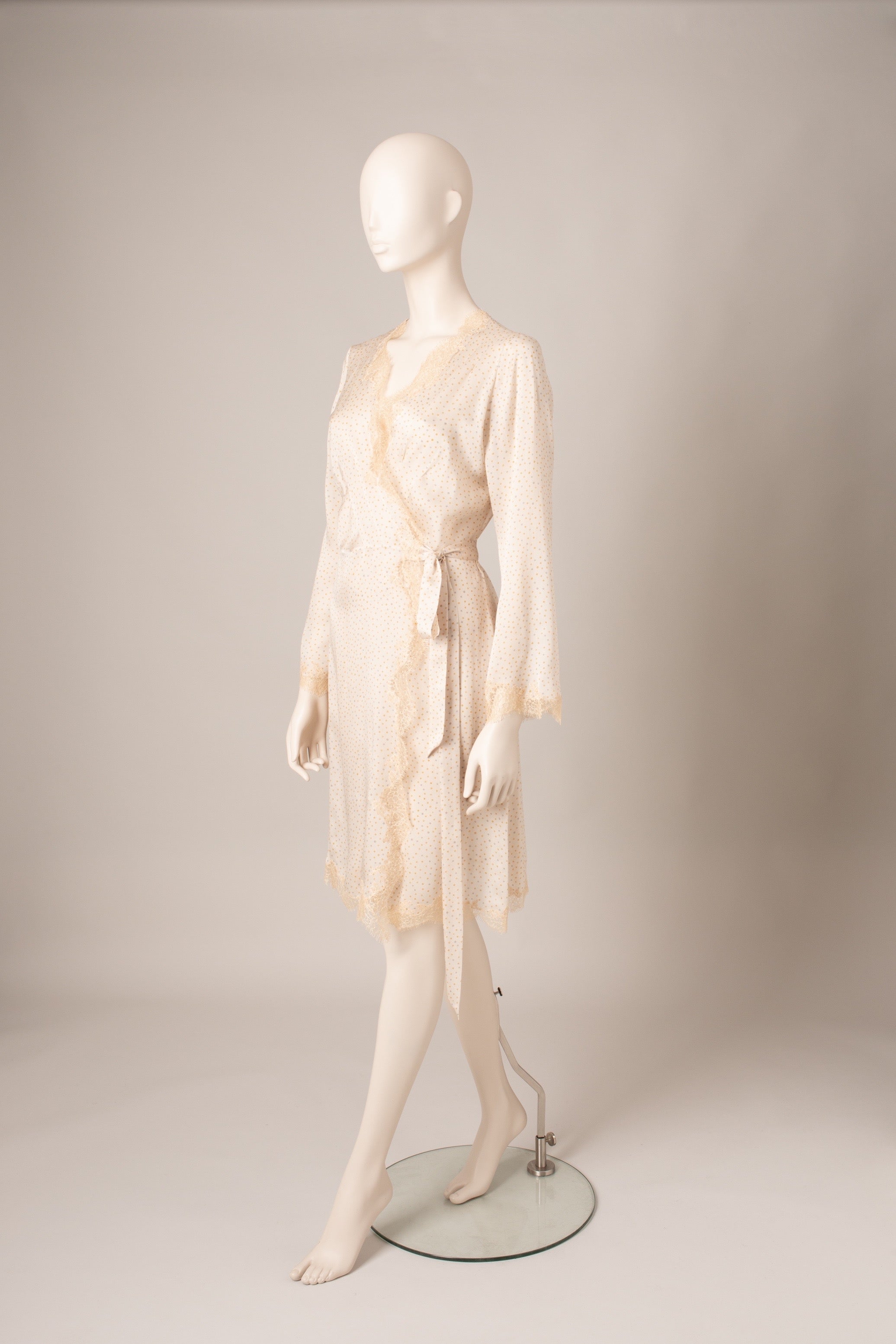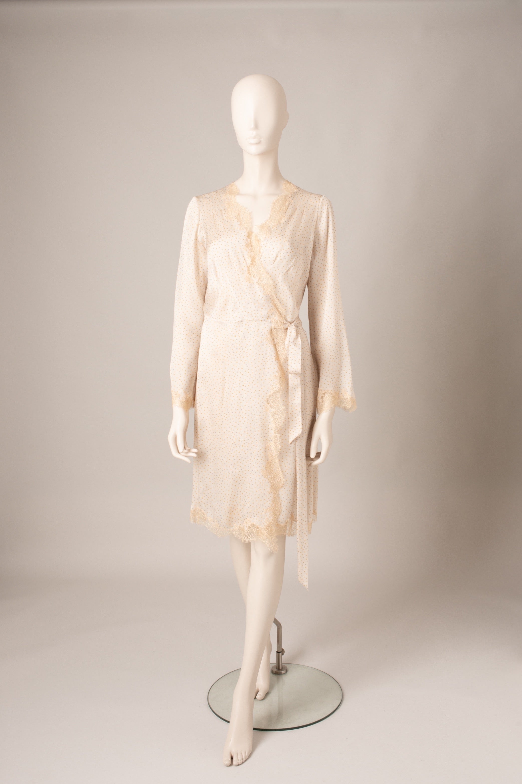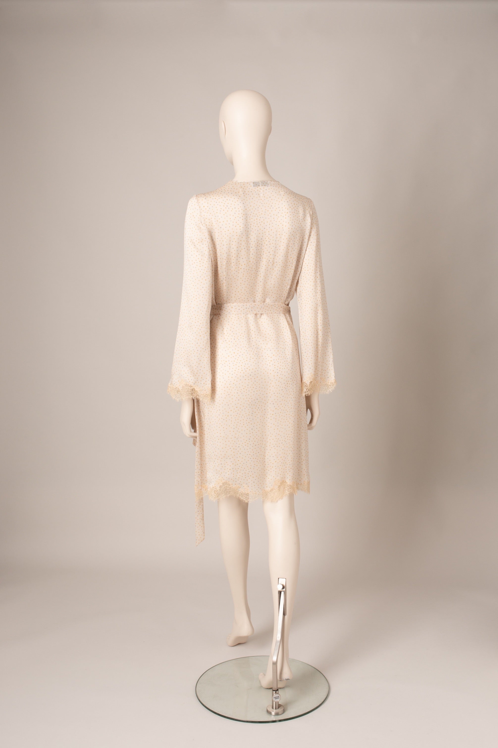 Egerie lace adorns the neckline and bottom of this wrap-around dress inspired by Skyfall deshabille, an iconic piece of the house. The light silk and its dotted print give it a more casual look.