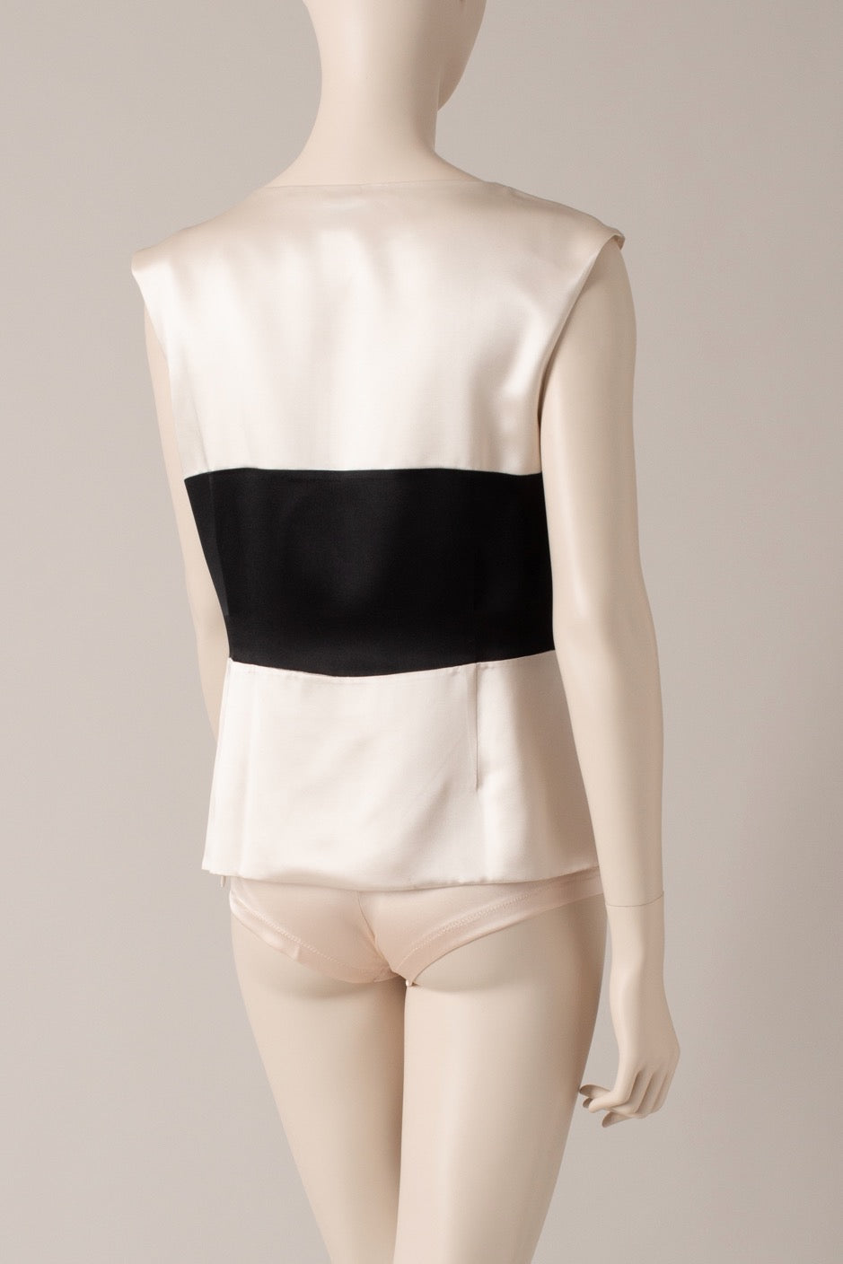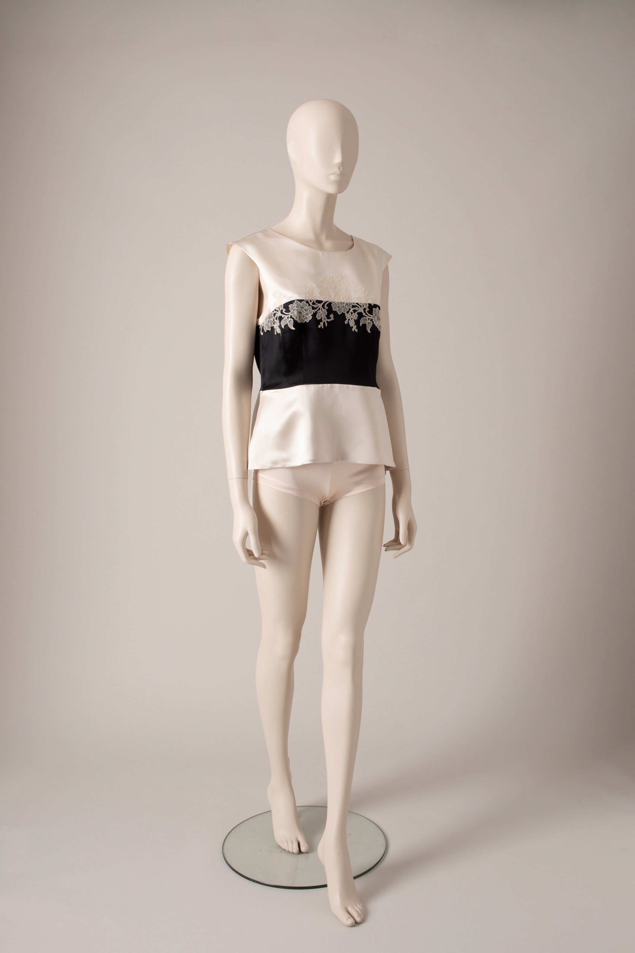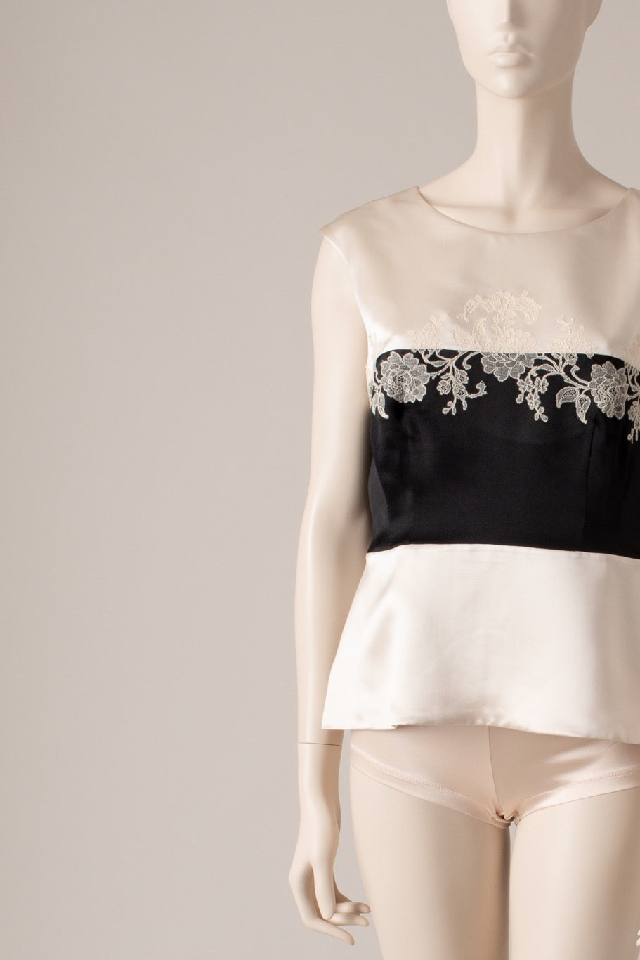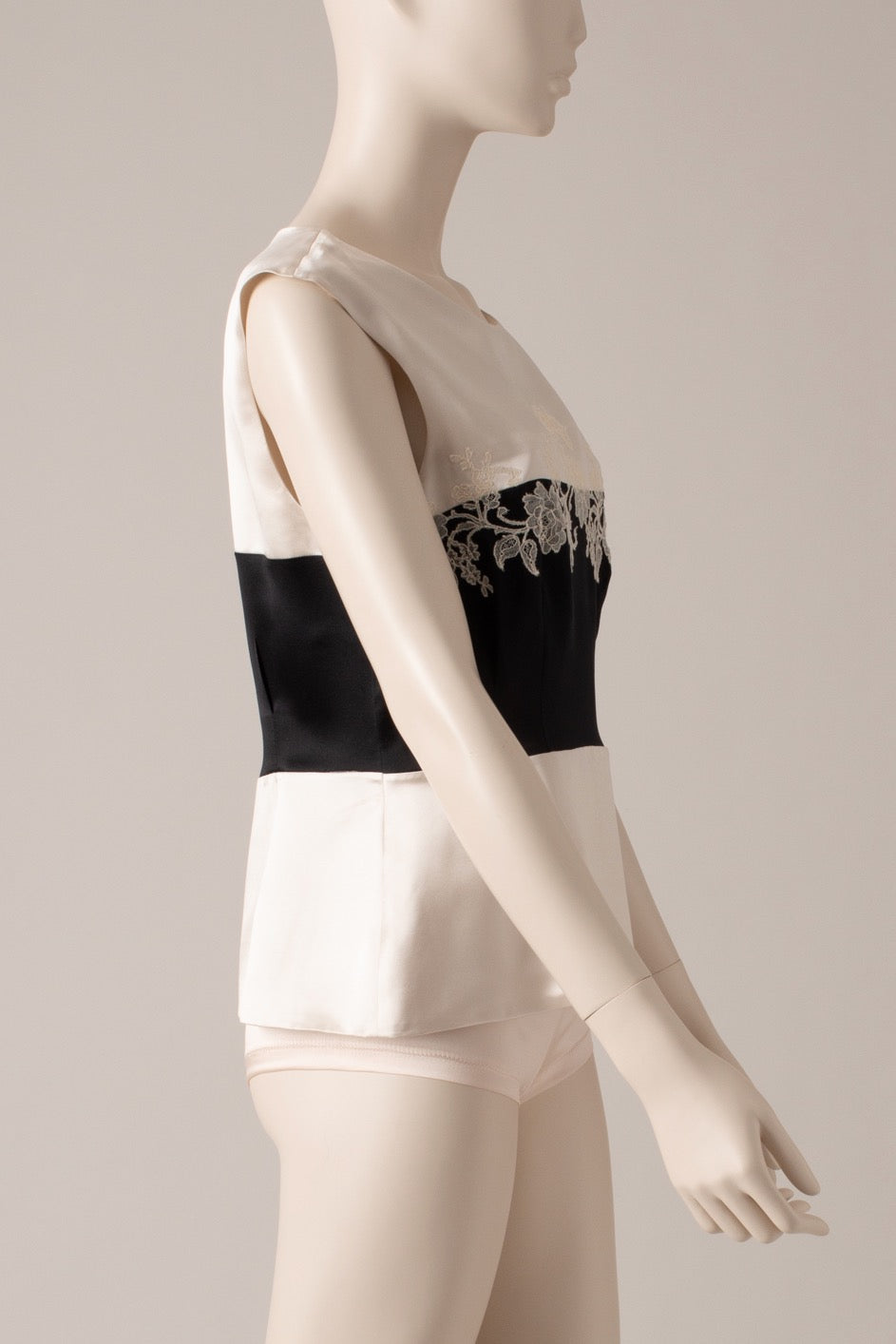 Sleeveless top with contratsed details. Inlaid with Sonia lace. Silk lined. Length : 58cm approx.