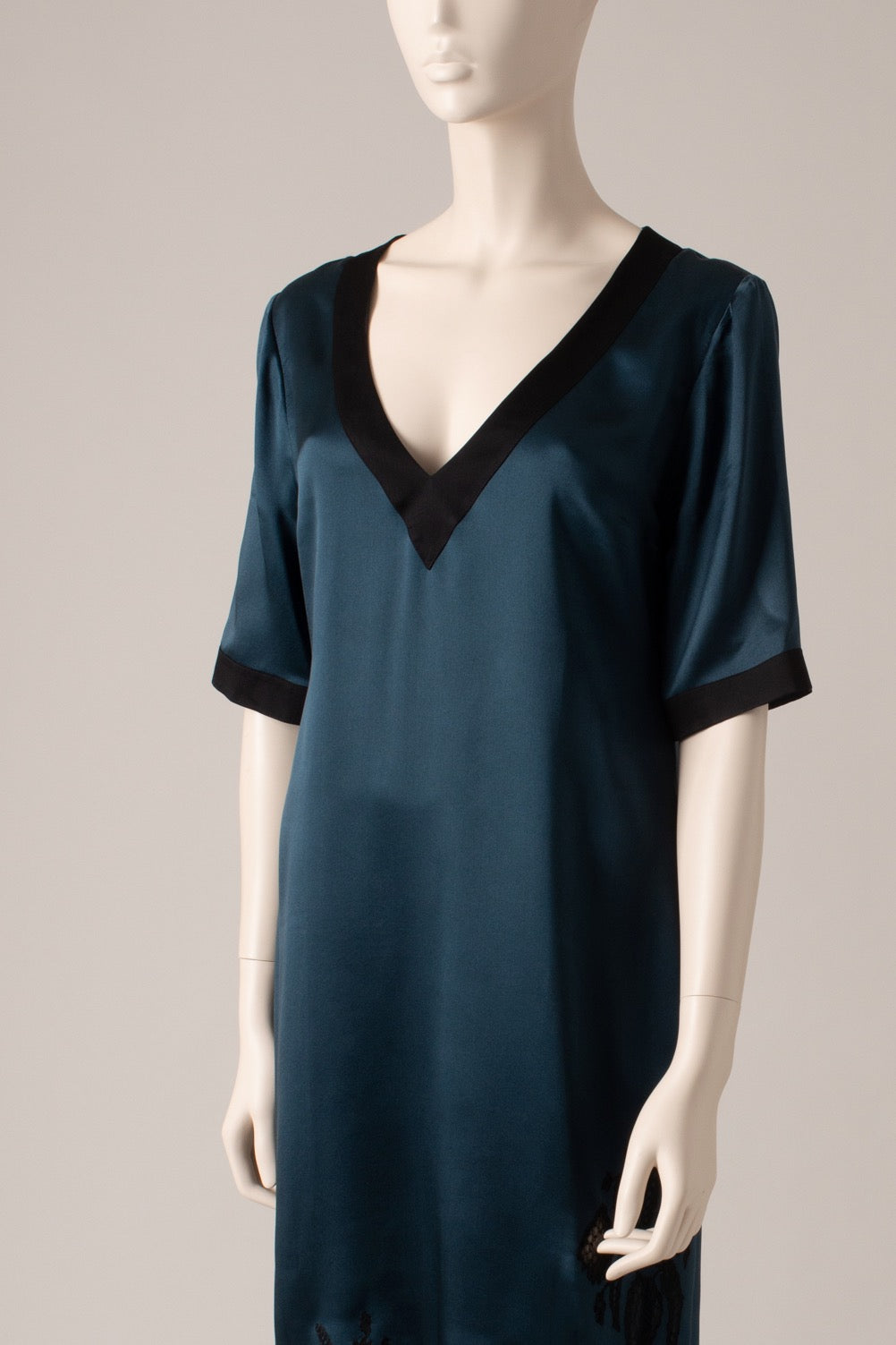 Straight dress with short sleeves and a generous V-neckline. Contrasting details.