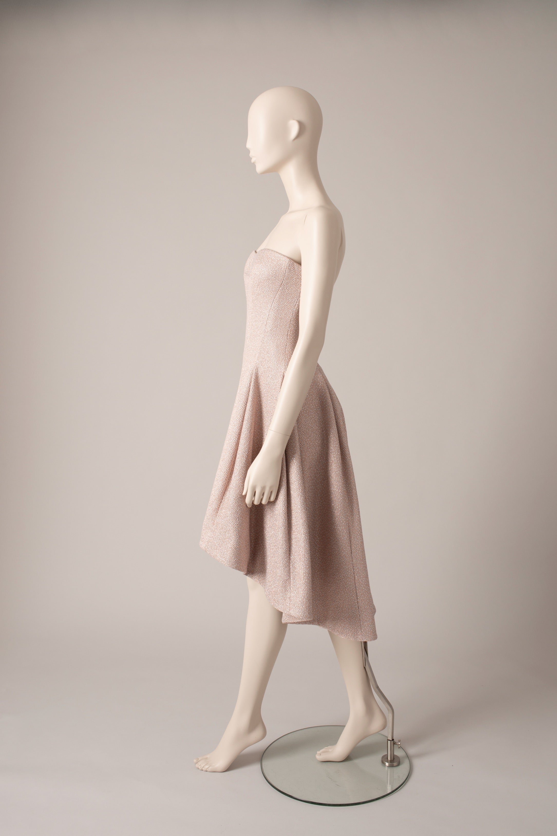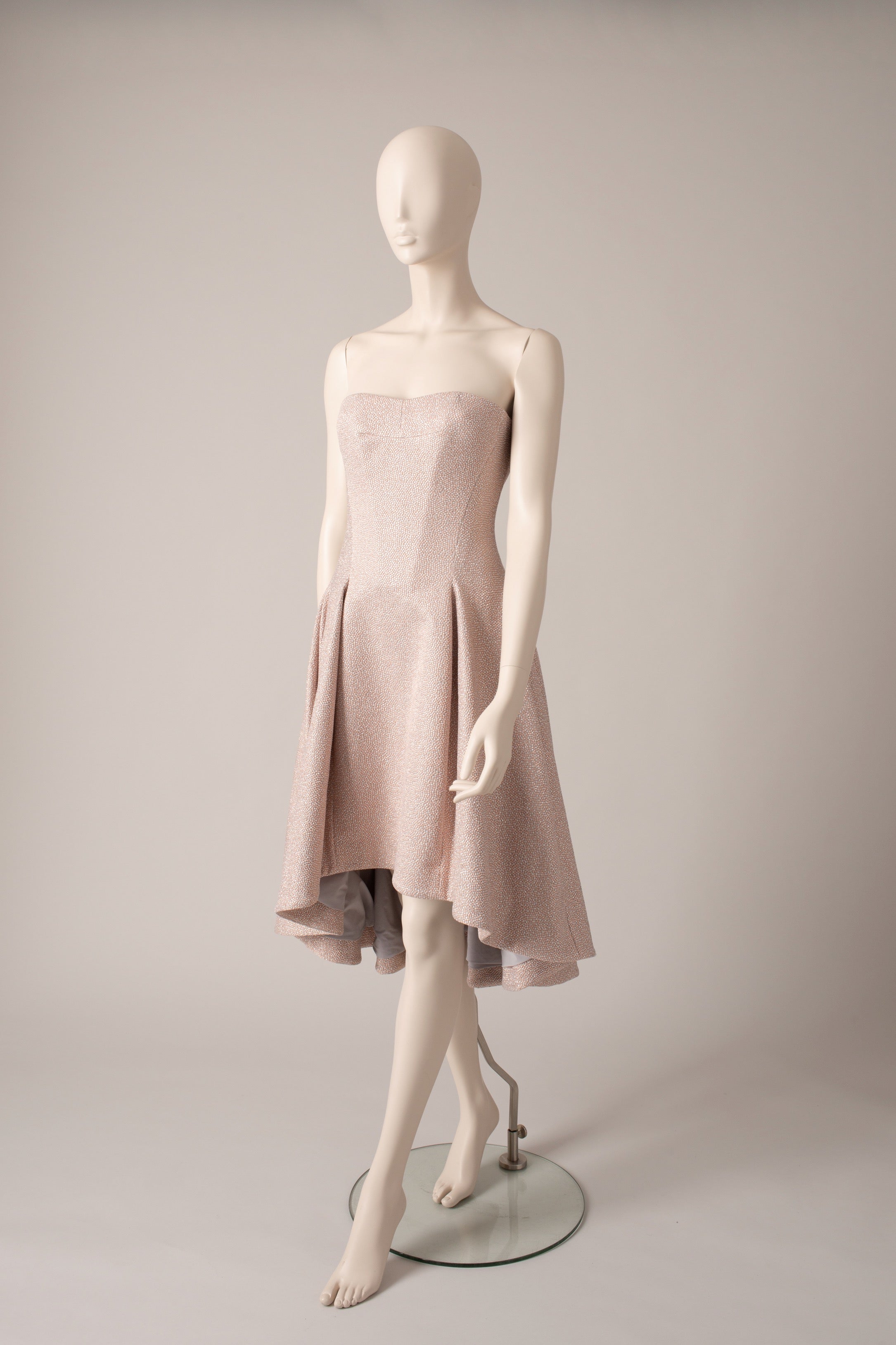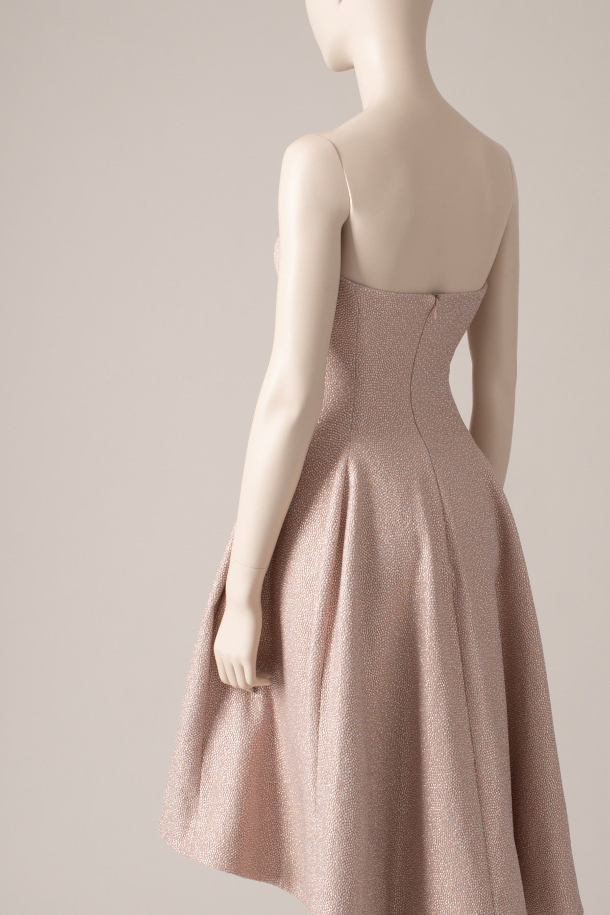 Strapless dress with asymmetrical flared skirt. Knee length.