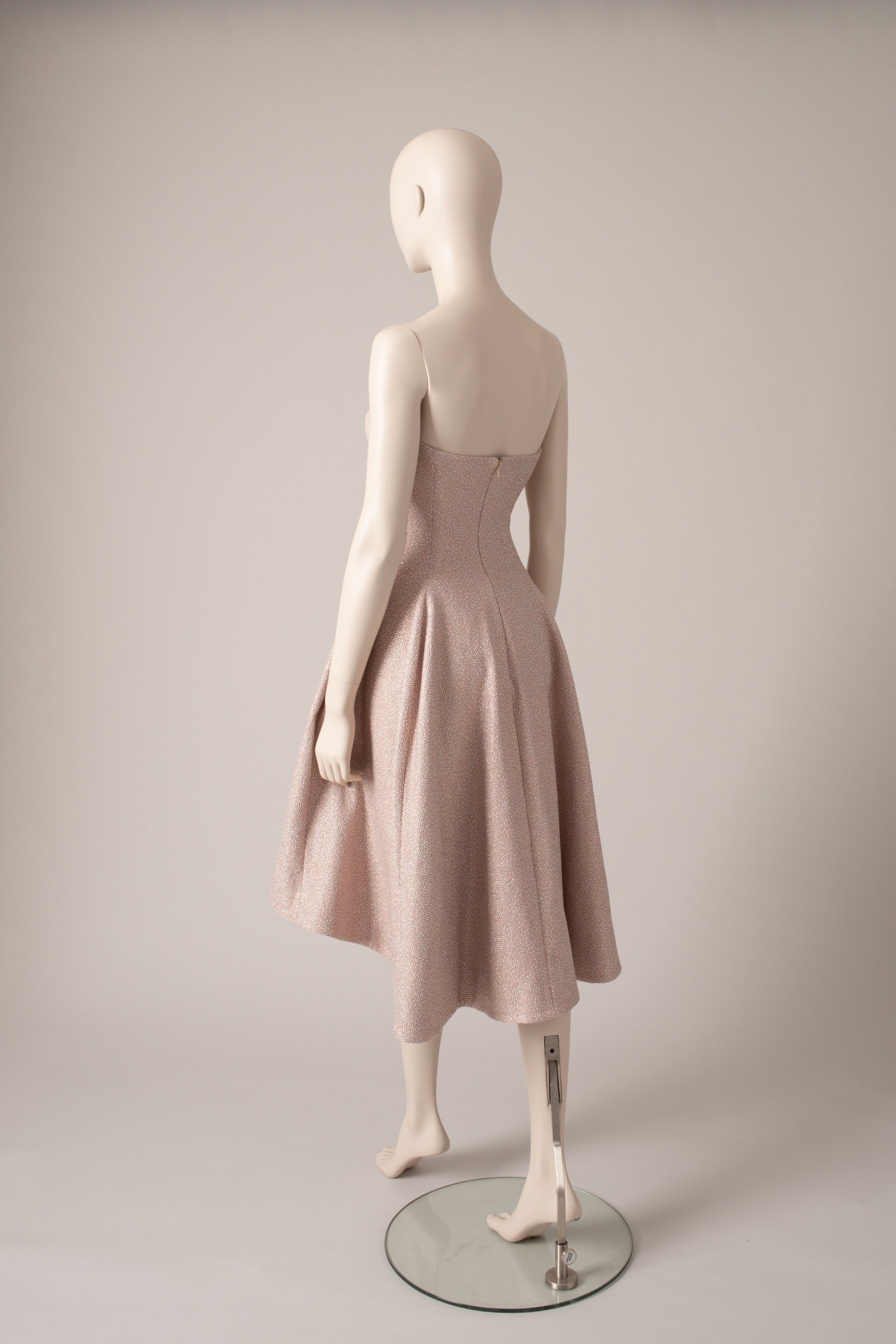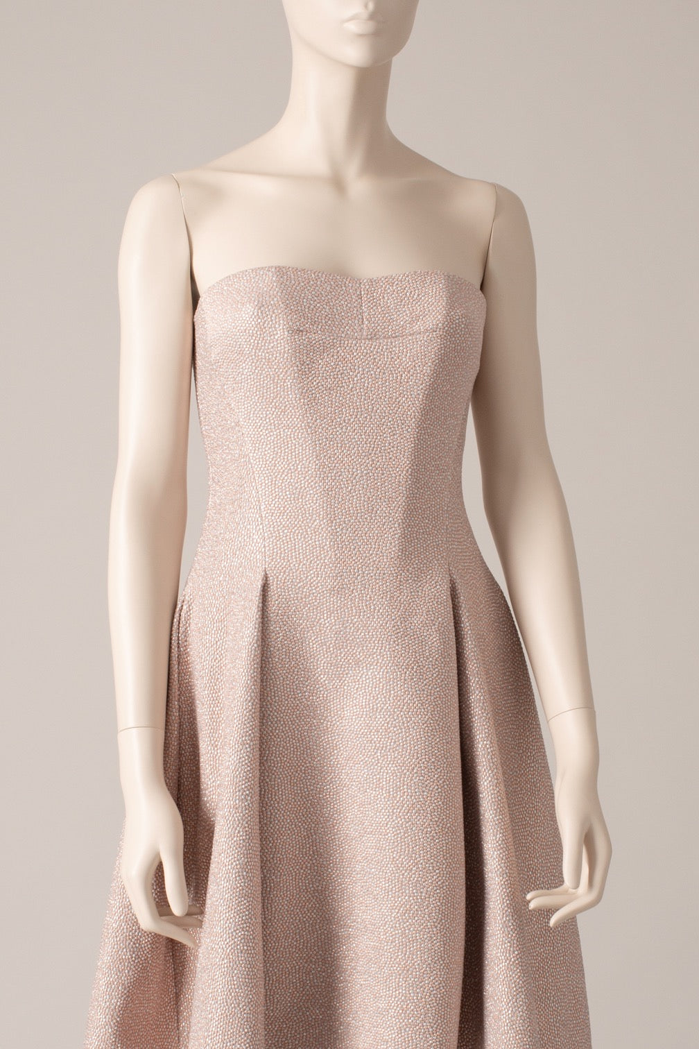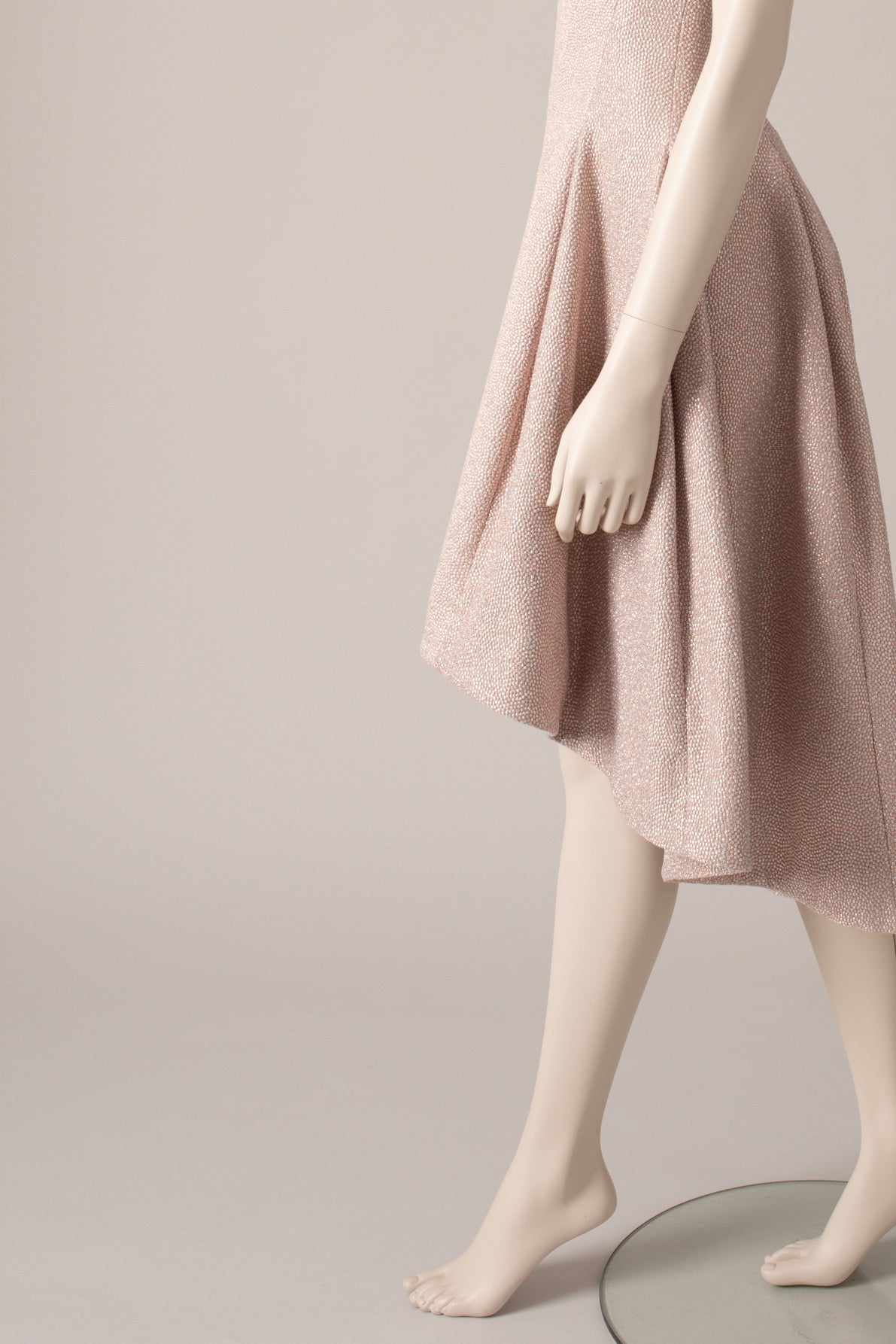 Strapless dress with asymmetrical flared skirt. Knee length.
