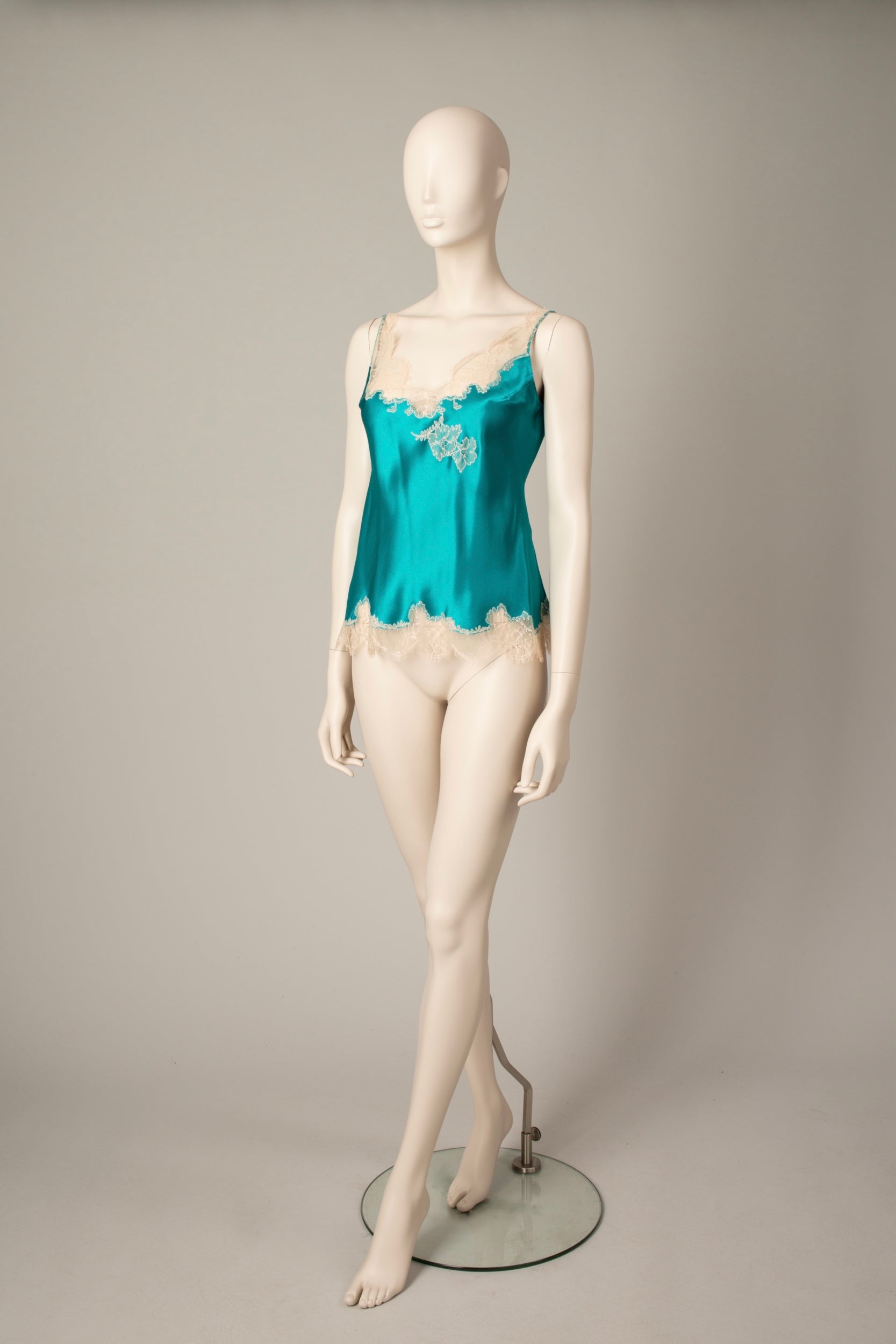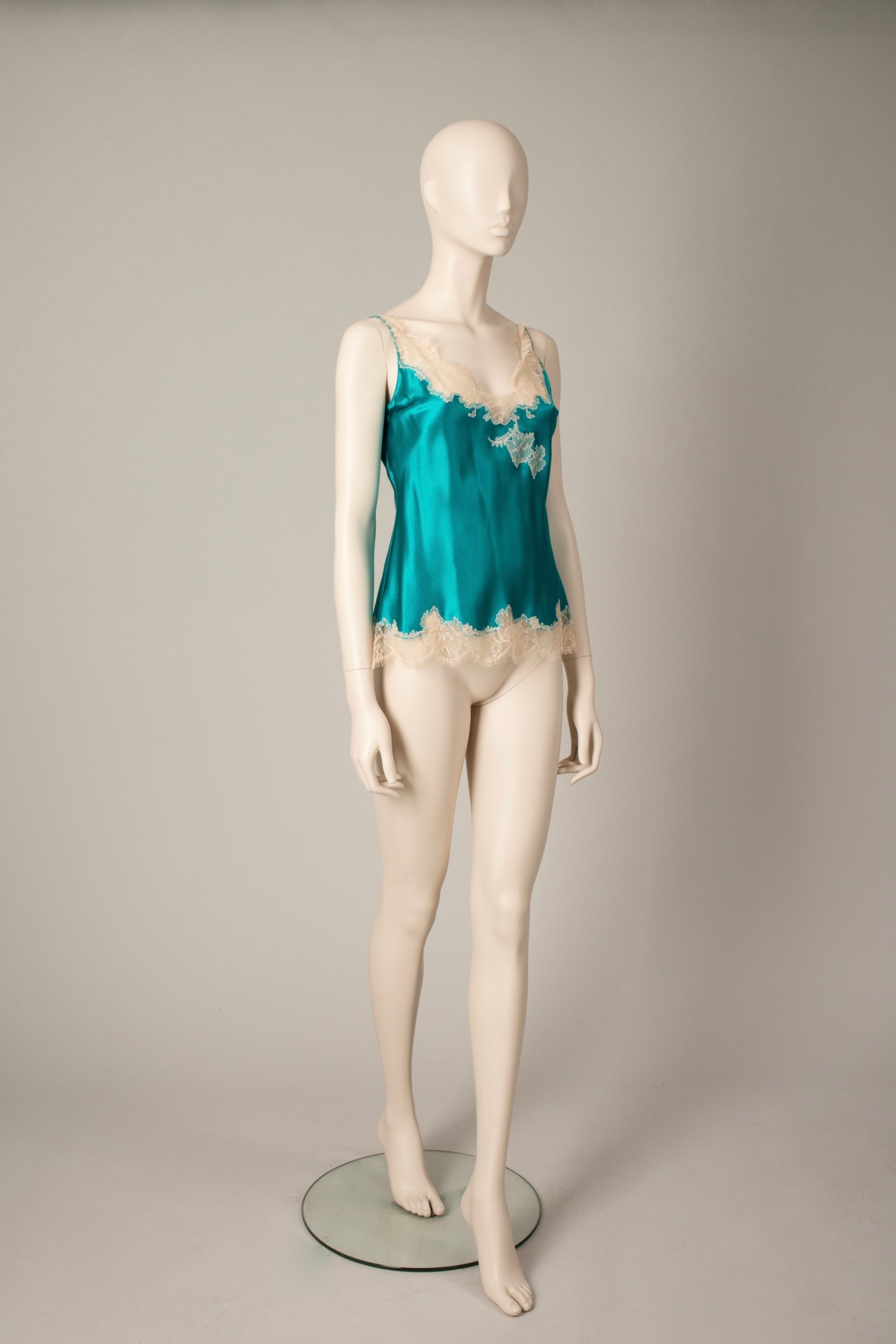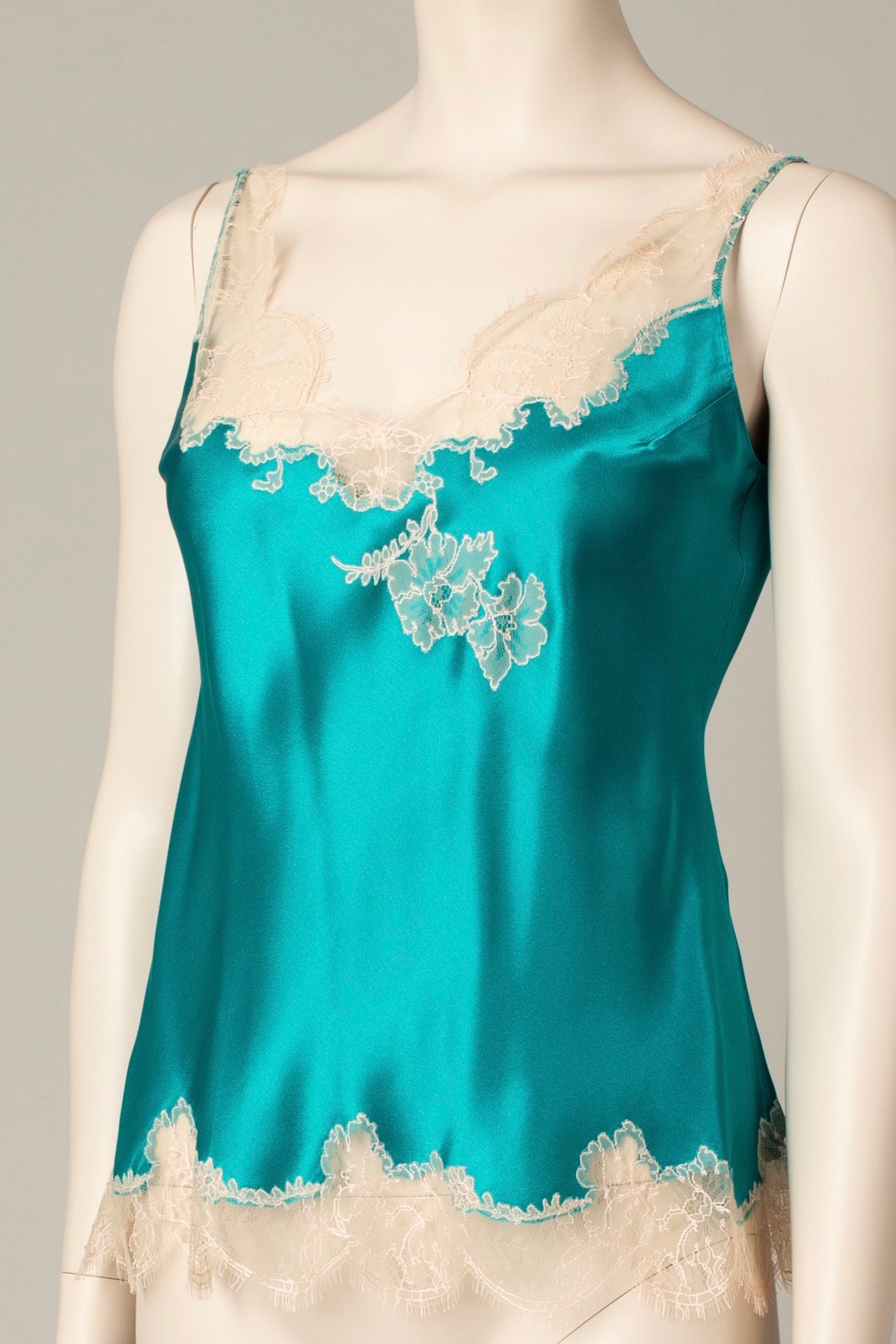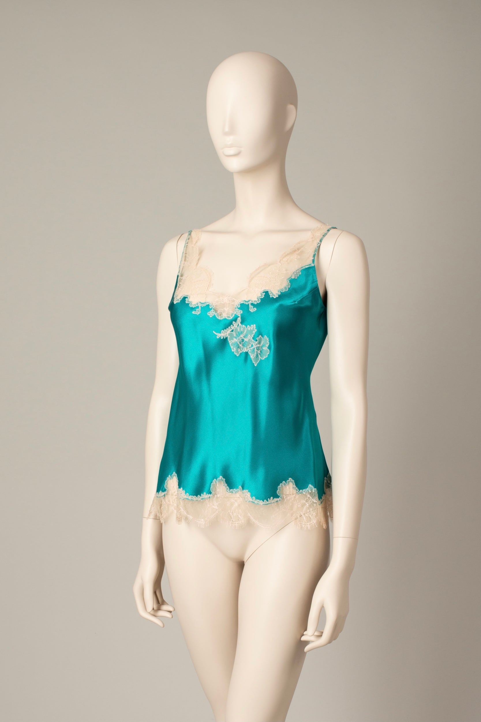 Silk camisole inlaid with lace on the V neck and the hem. Cut in bias, allowing the fabric to stretch slightly to offer a more flattering drape and an optimal fit. Fine straps. Length : 64cm. Emerald green silk satin and pink Caudry Lace