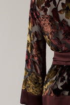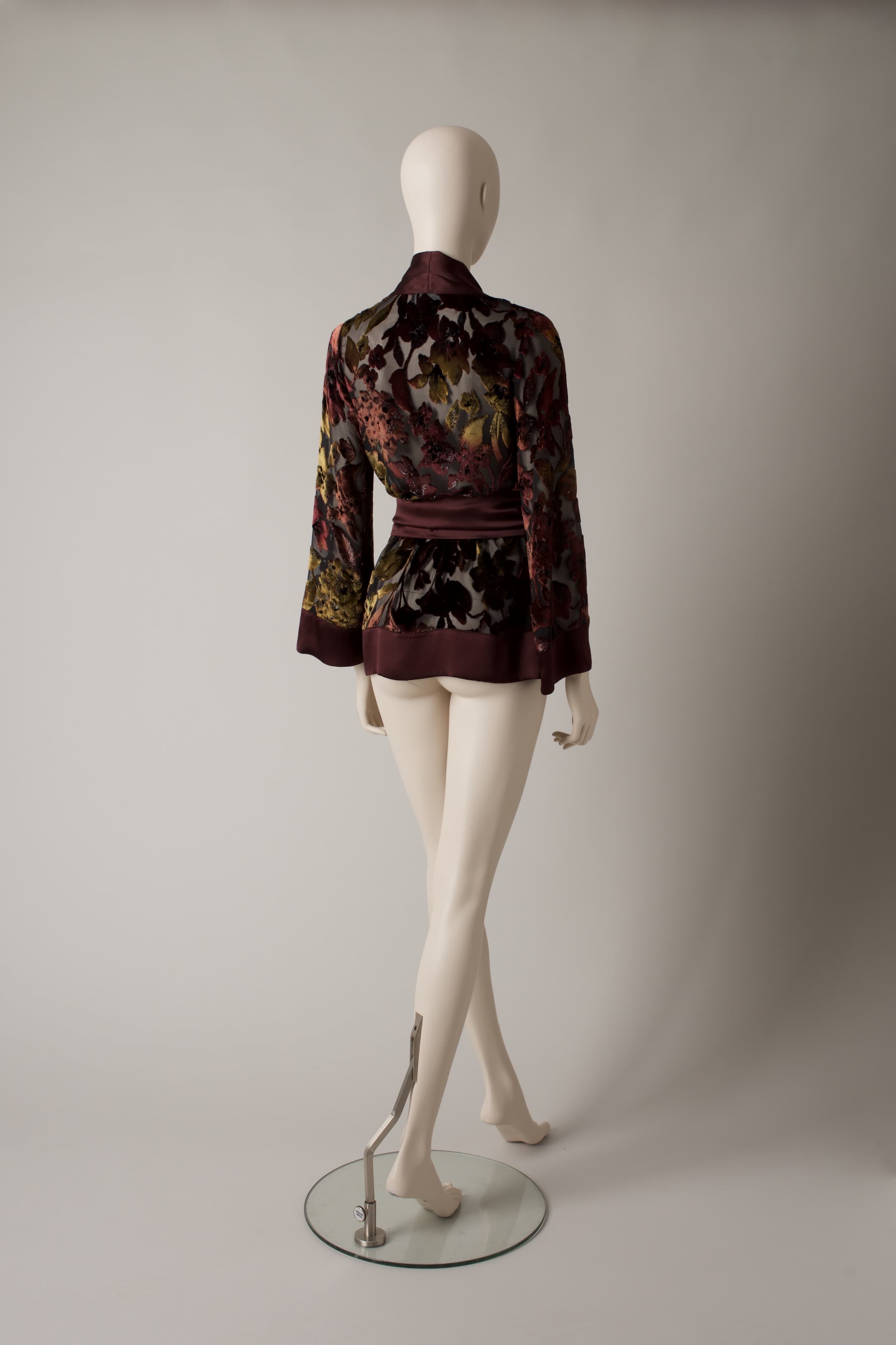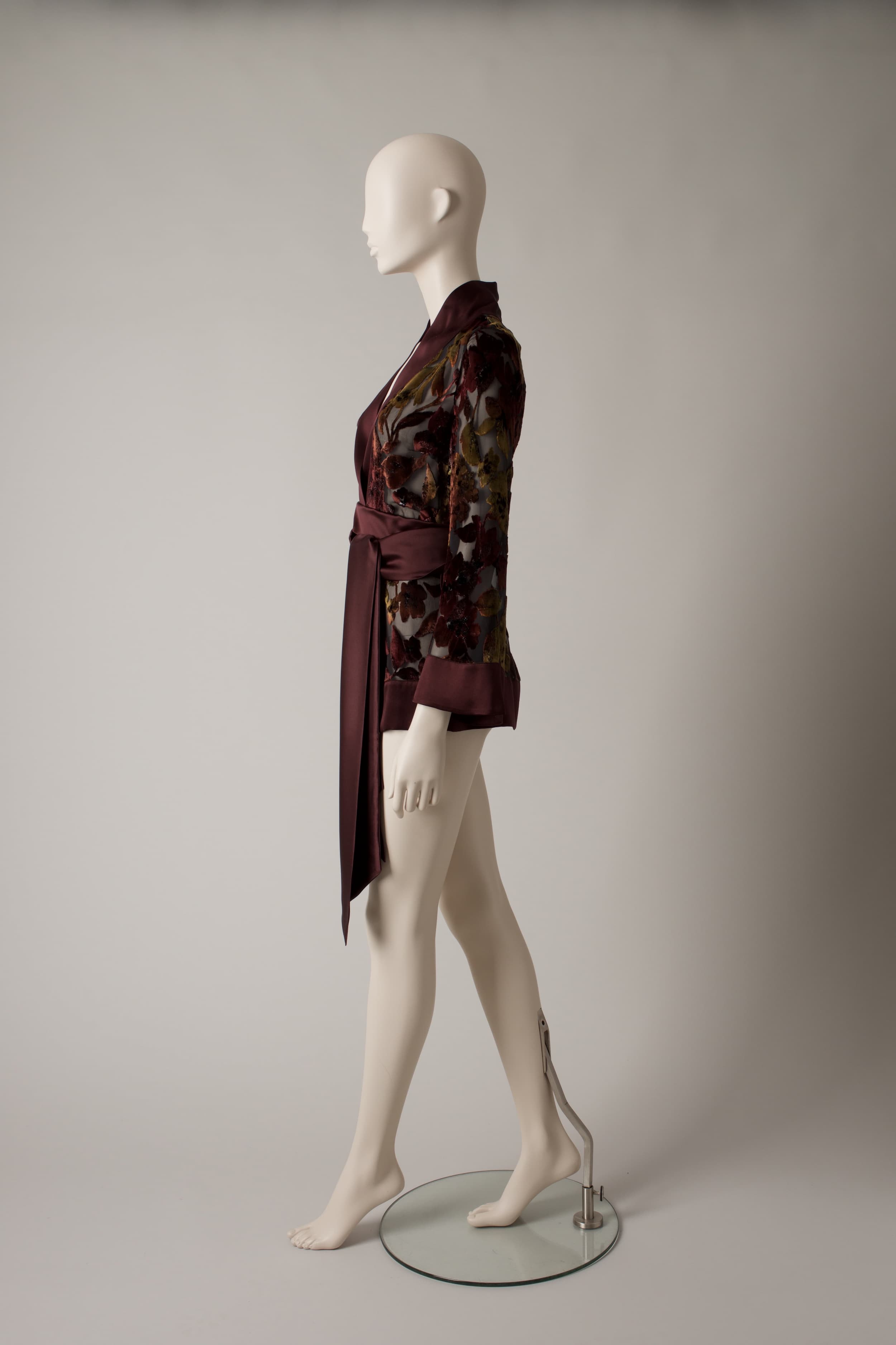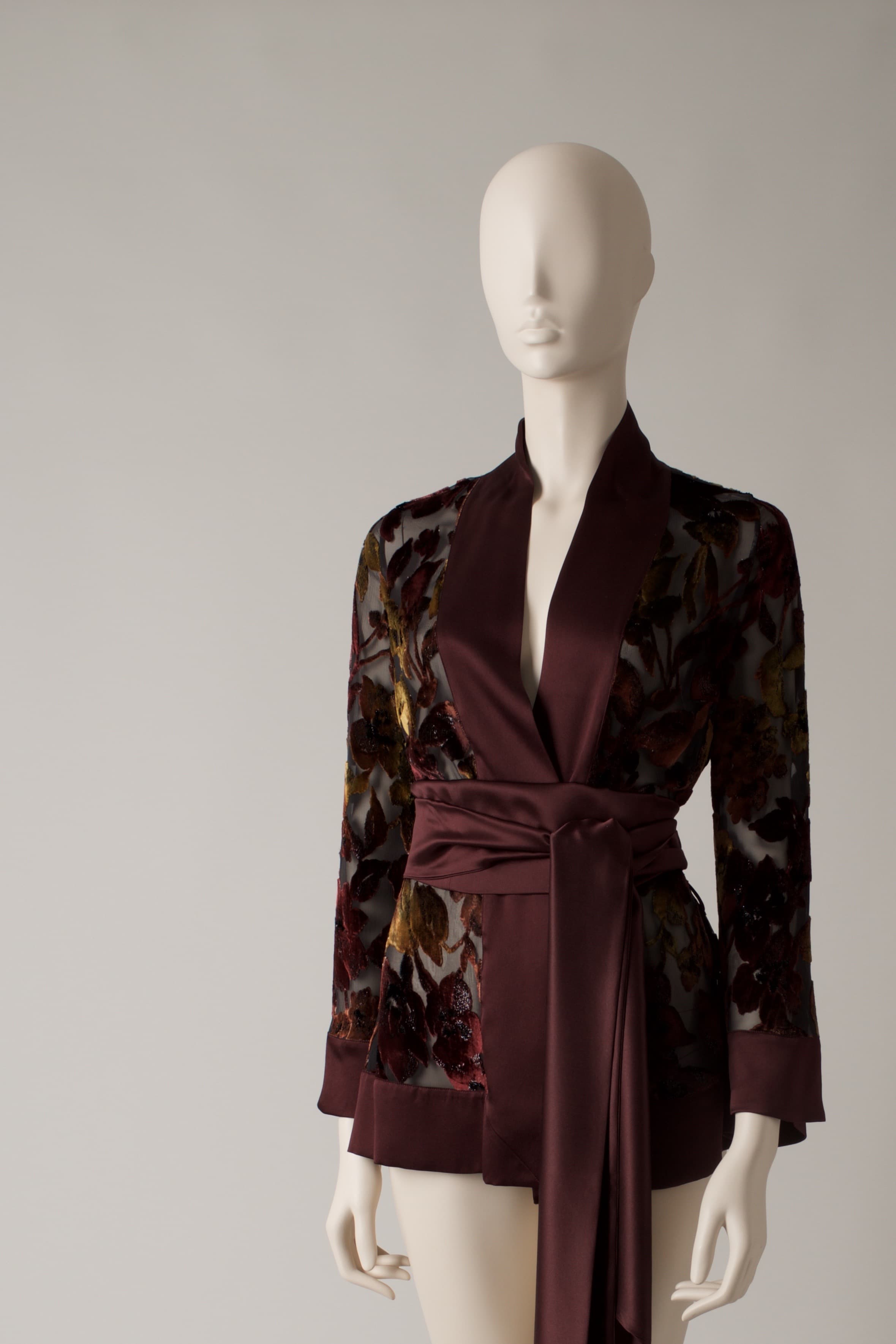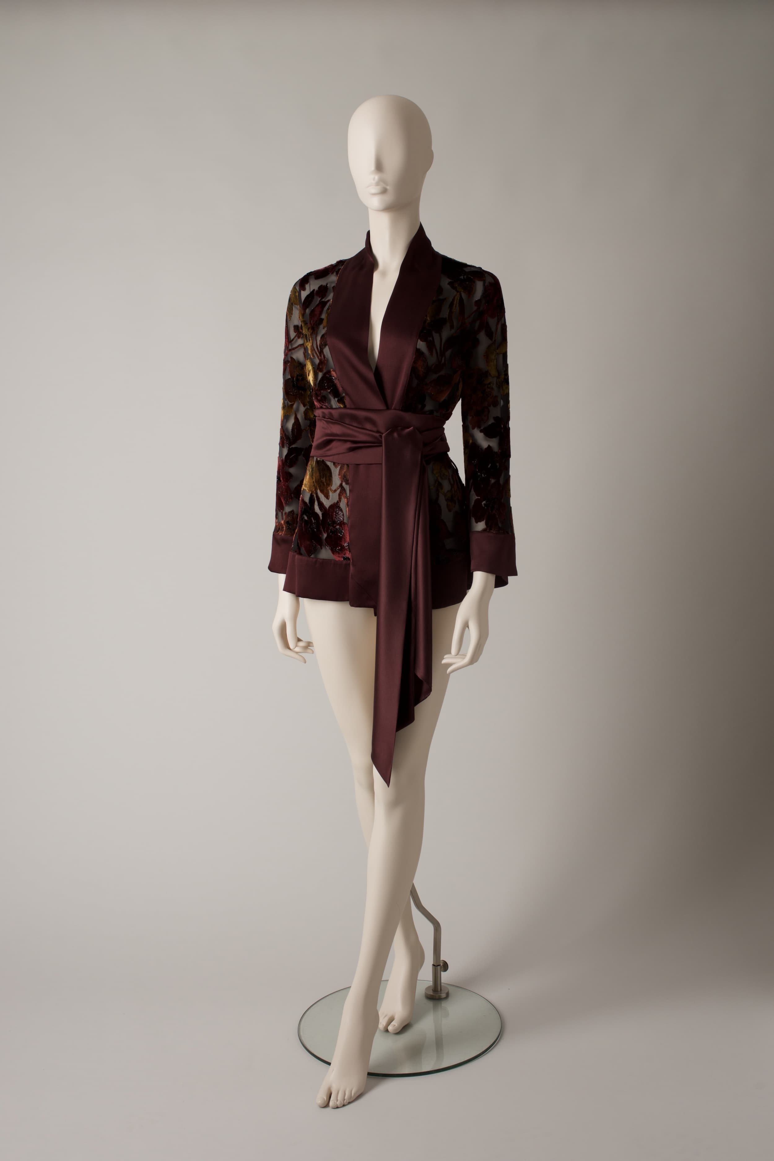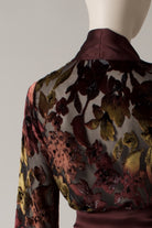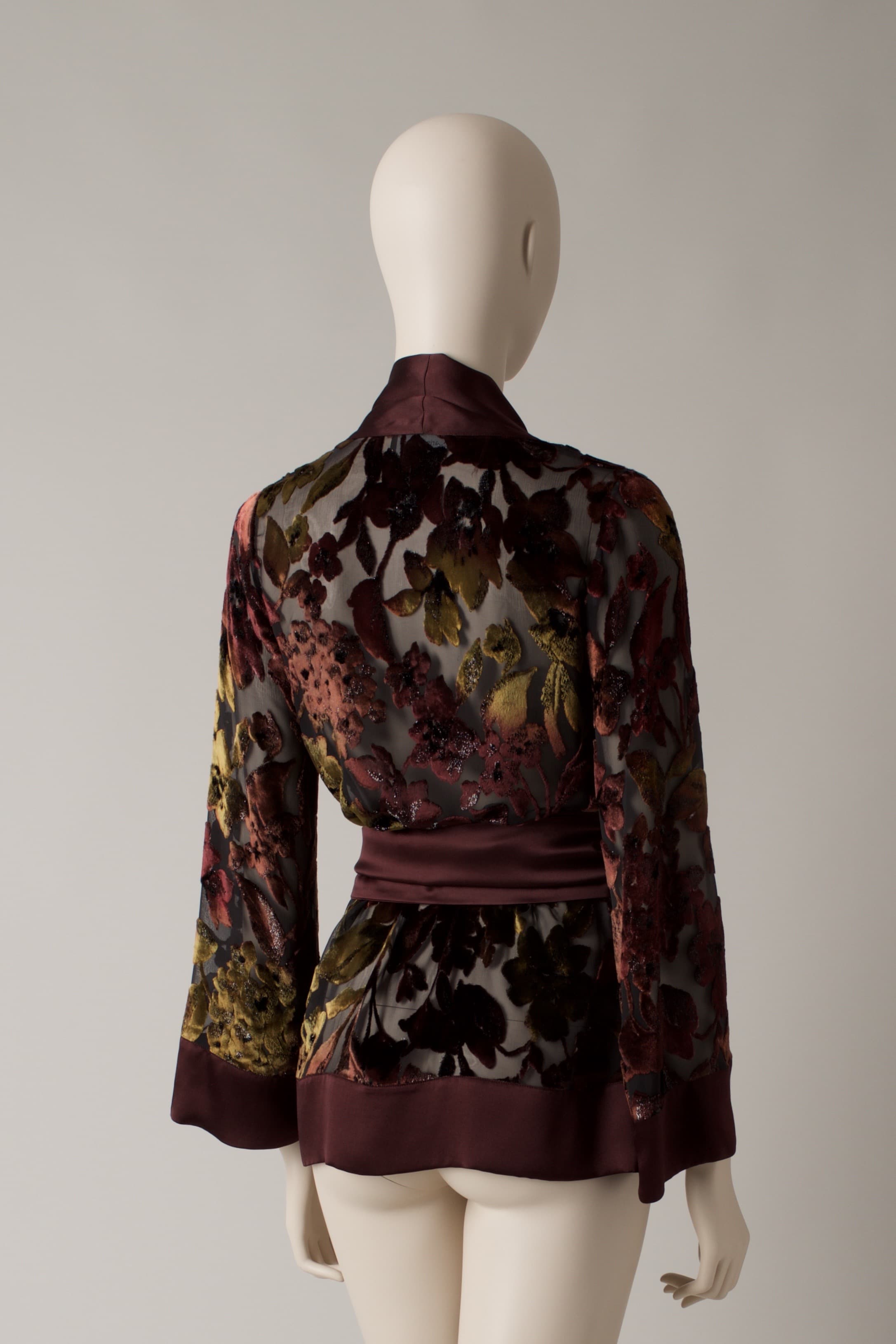Smoking jacket in devoured silk velvet. Hand-colored flowers and leaves are sprinkled with shiny thread, illuminating the delicate motif.