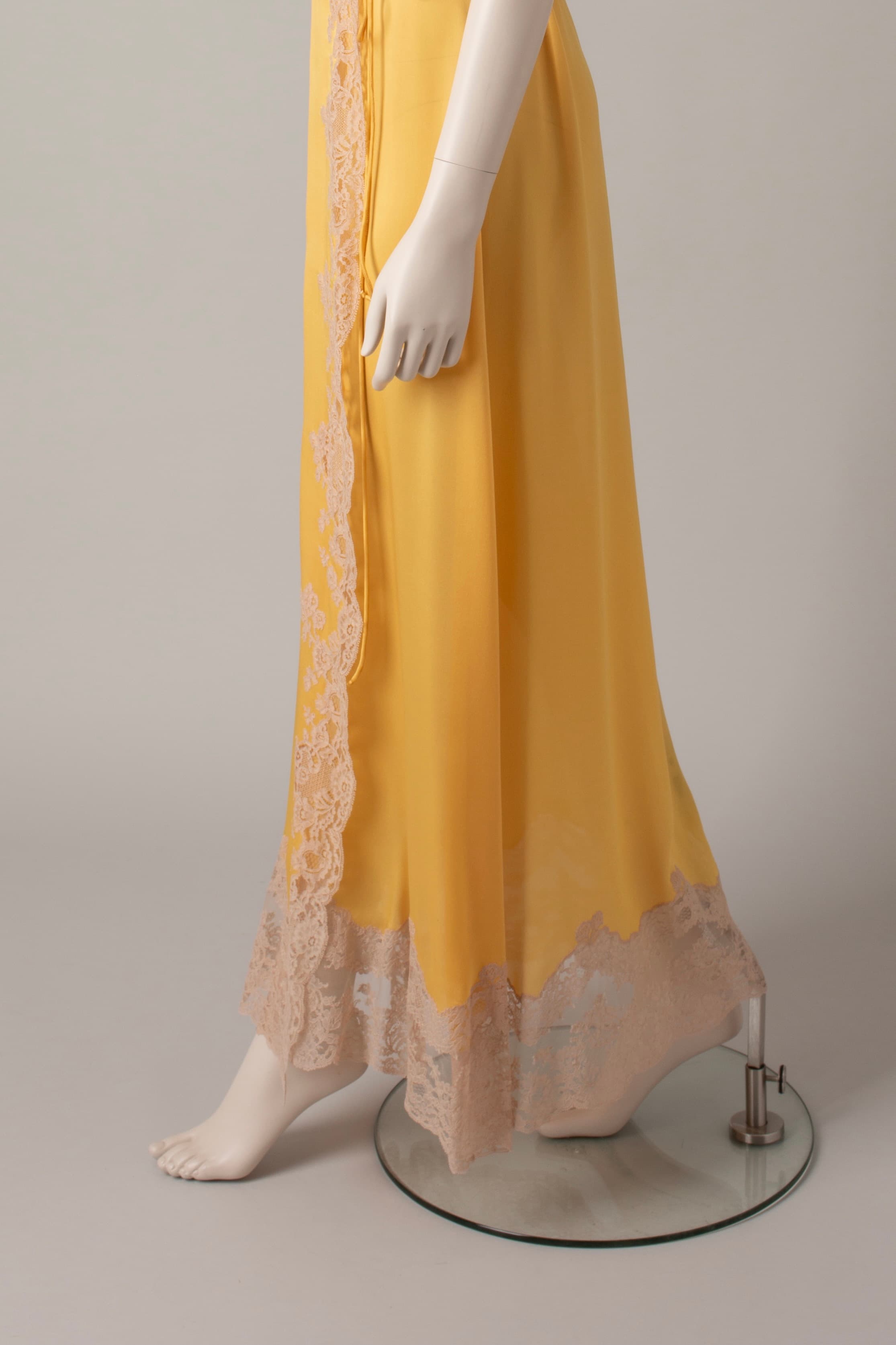 Light silk negligee inspired by Hollywood glamour. Agatha lace is inlaid along the neckline, the hem and bottom. A small ruffled sleeve delicately covers the shoulder.