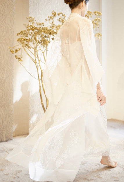 Long silk kimono - Natural and Natural Sakura lace