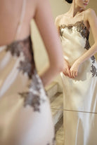 With thin straps and an impeccable cut, this long silk satin slip slit dress adorned with de Caudry lace incrustation reveals its full power of seduction. With exquisite fabric and a uniquely crafted lace incrustation, it enhances the silhouette, embraced with the Alba flowers.