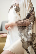 This silk kimono, with its butterfly sleeves inlaid with Alba lace at the edges is the short version of the iconic kimono of the house. The contrast of the lace on silk highlights the finesse of the pattern and the work of our skilled artisans.