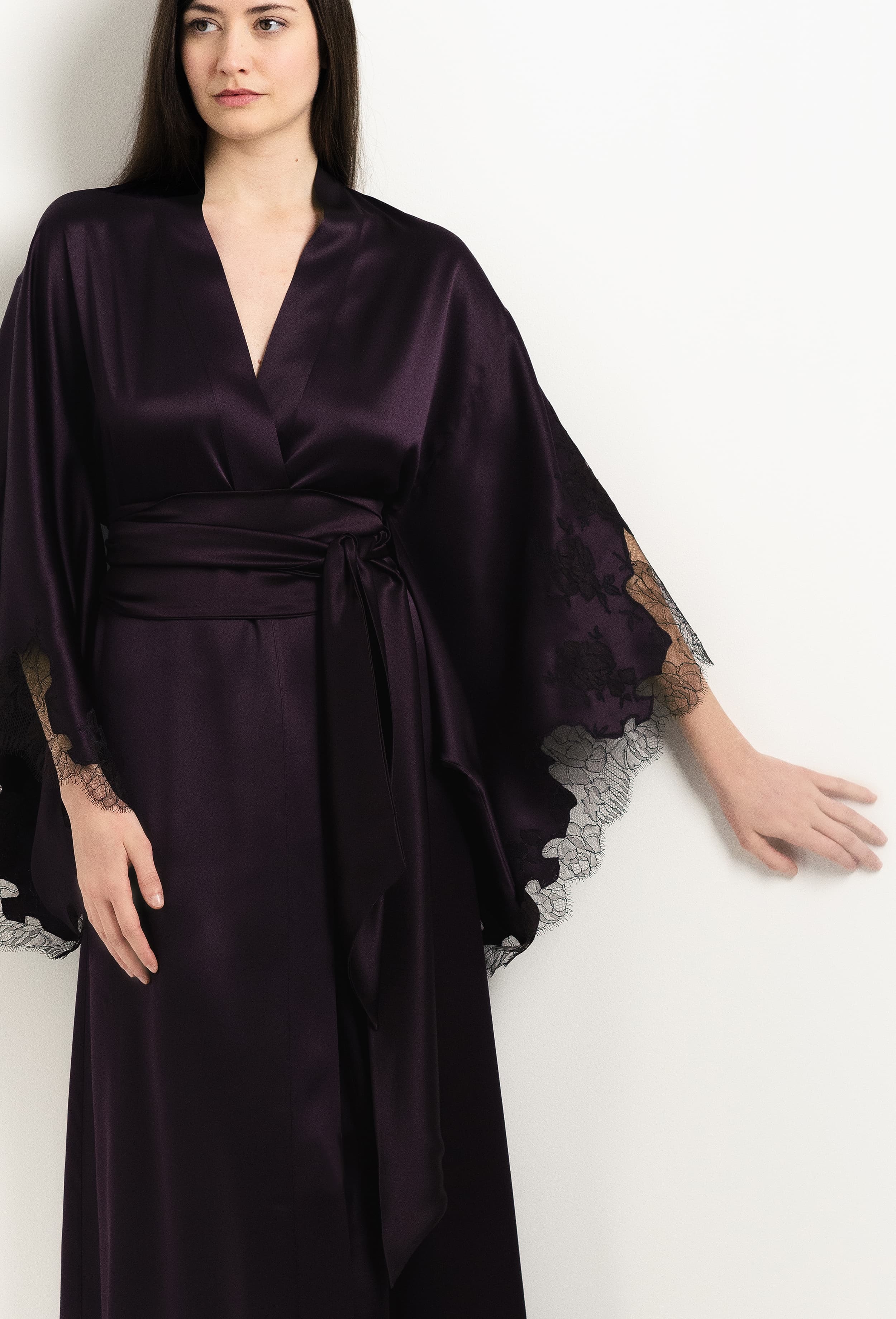 This sublime silk kimono, iconic piece of the house Carine Gilson, is inlaid with lace Alba on the edge of its majestic butterfly sleeves. With a loose fit, the wide belt elegantly highlights the waist. The silhouette is sublimated and impeccable.