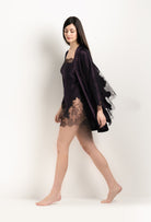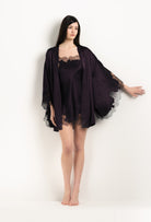 A short version of Carine Gilson's iconic piece, this kimono is crafted in silk satin. Its simple lines are contrasted by the subtlety of the Alba lace inlaid on the edge of majestically full sleeves.