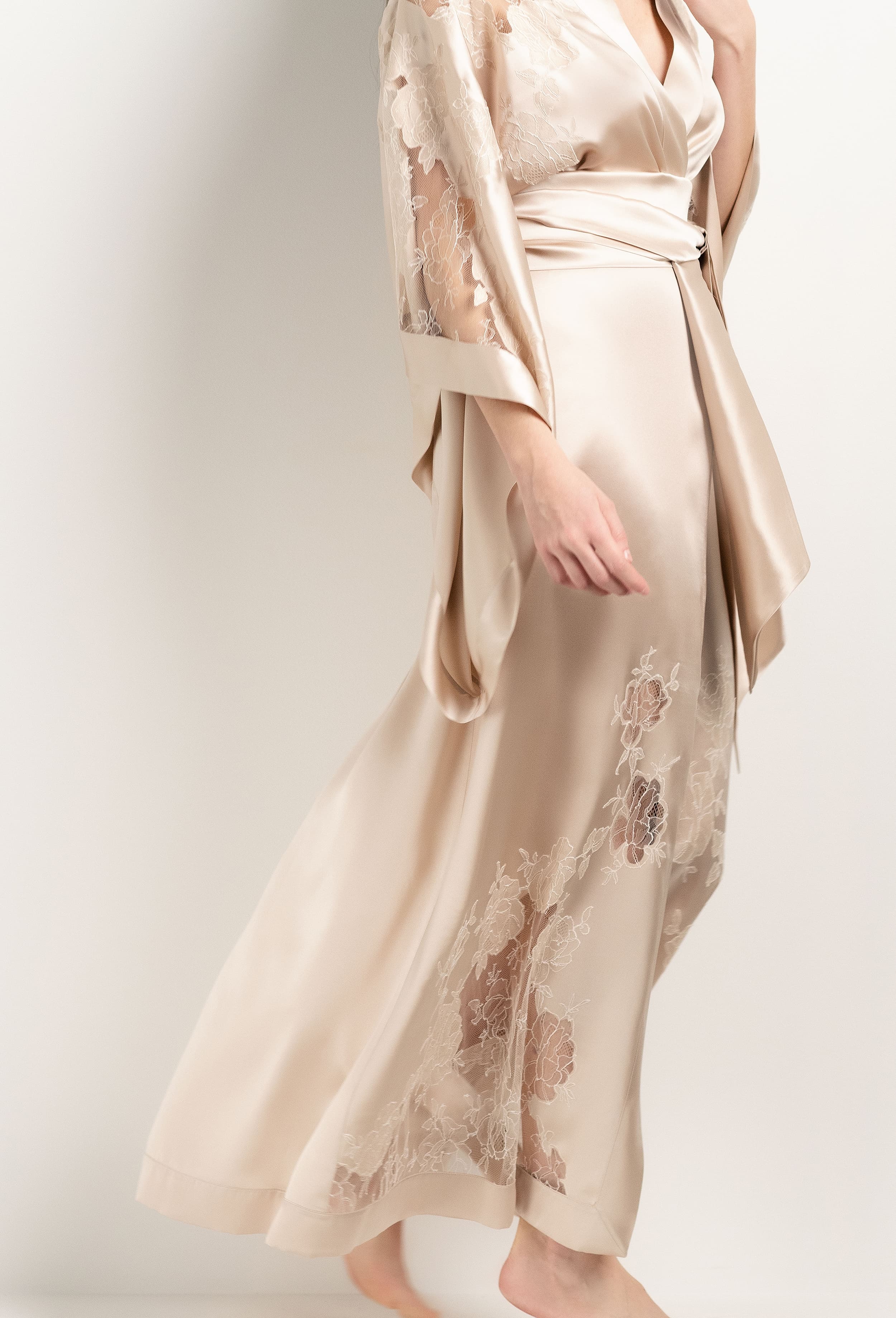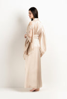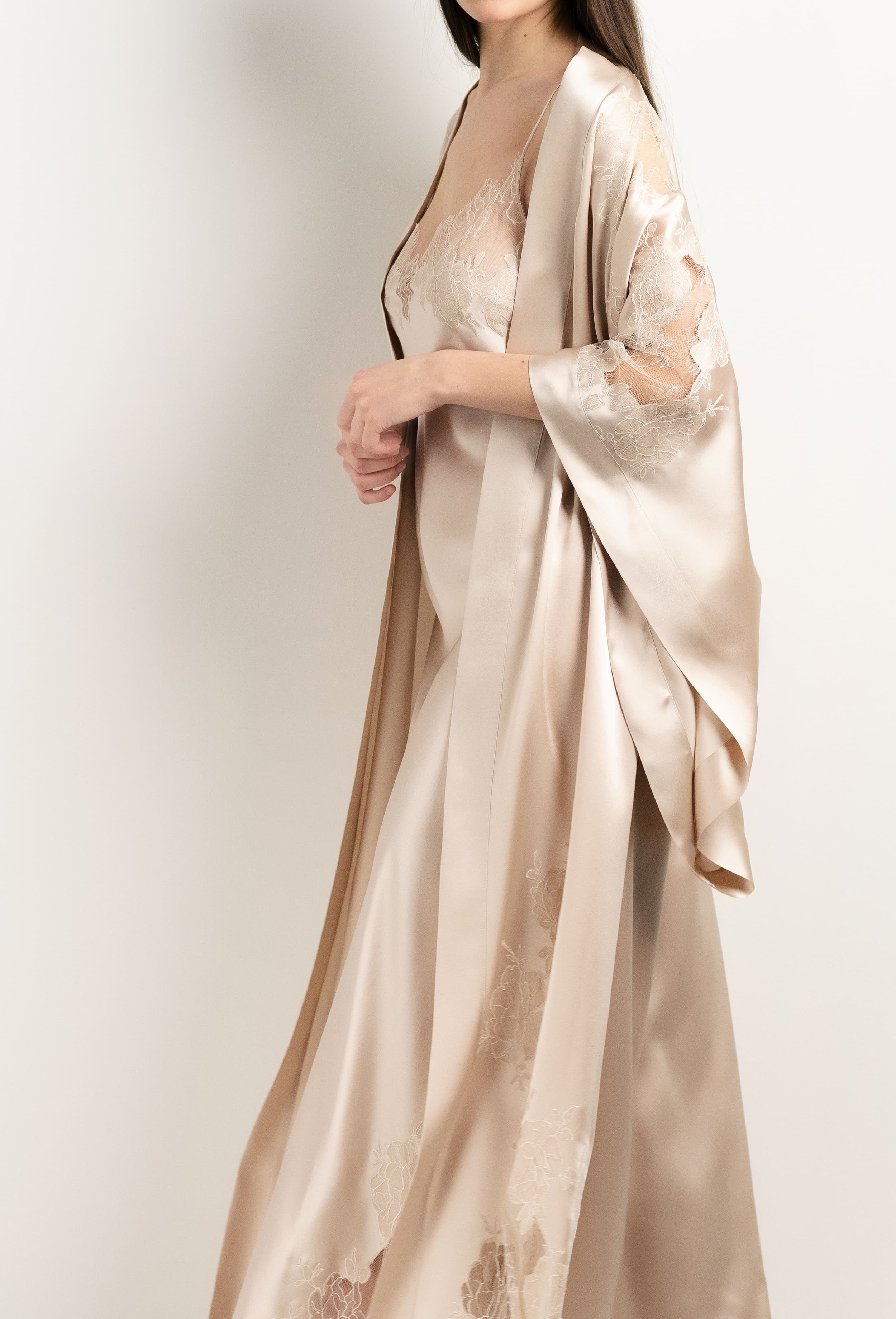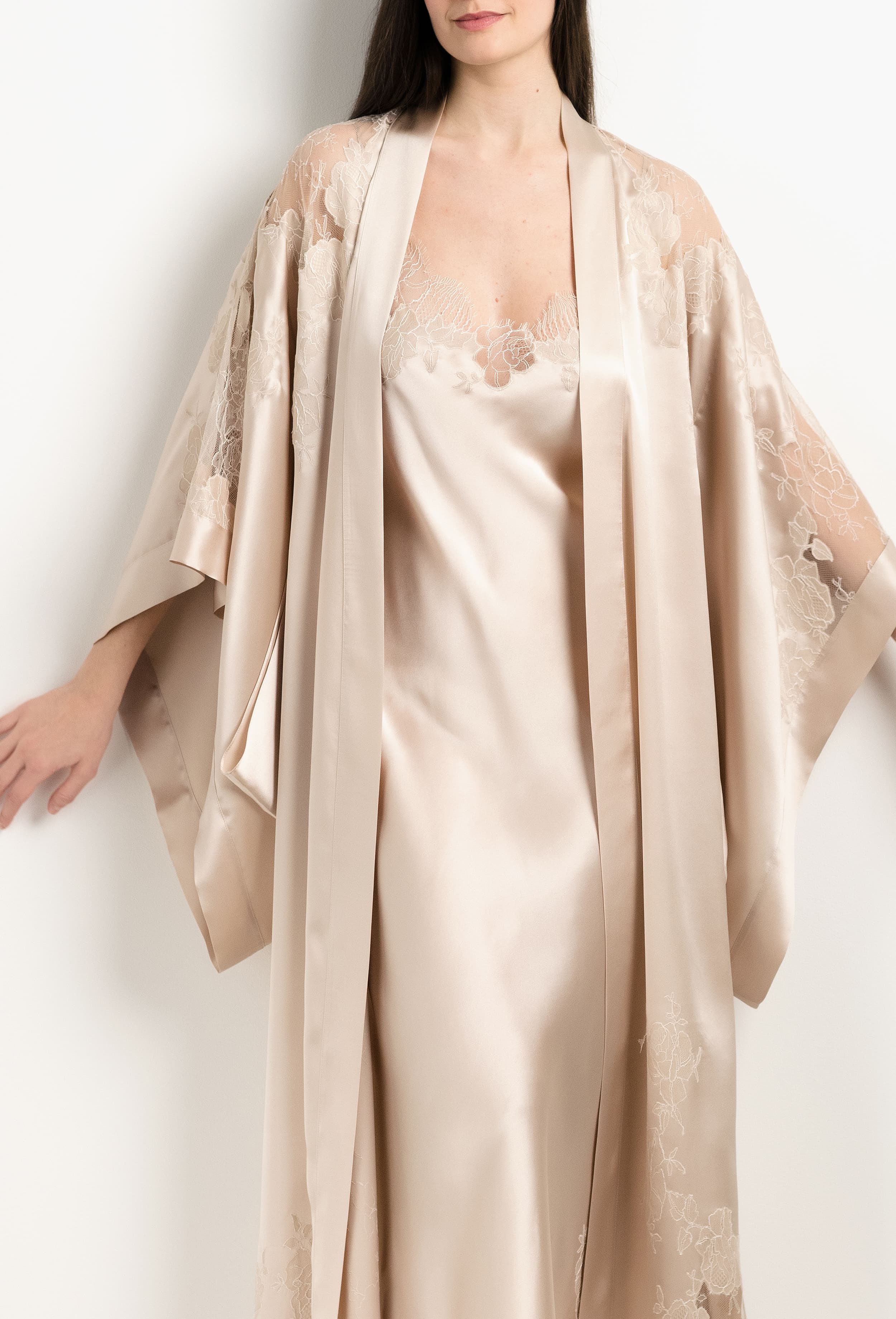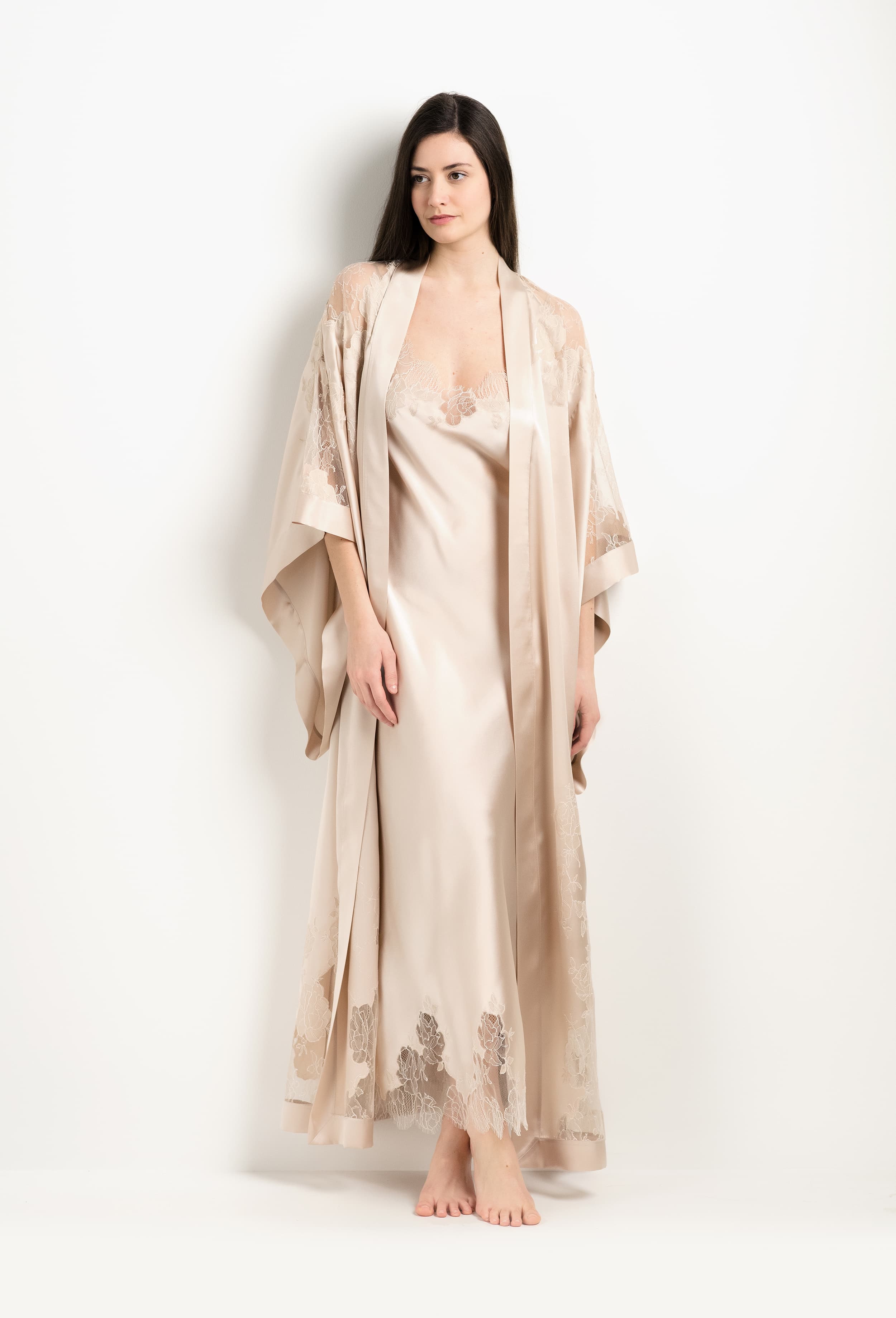 Long silk kimono - sand beige and ivory Alba lace