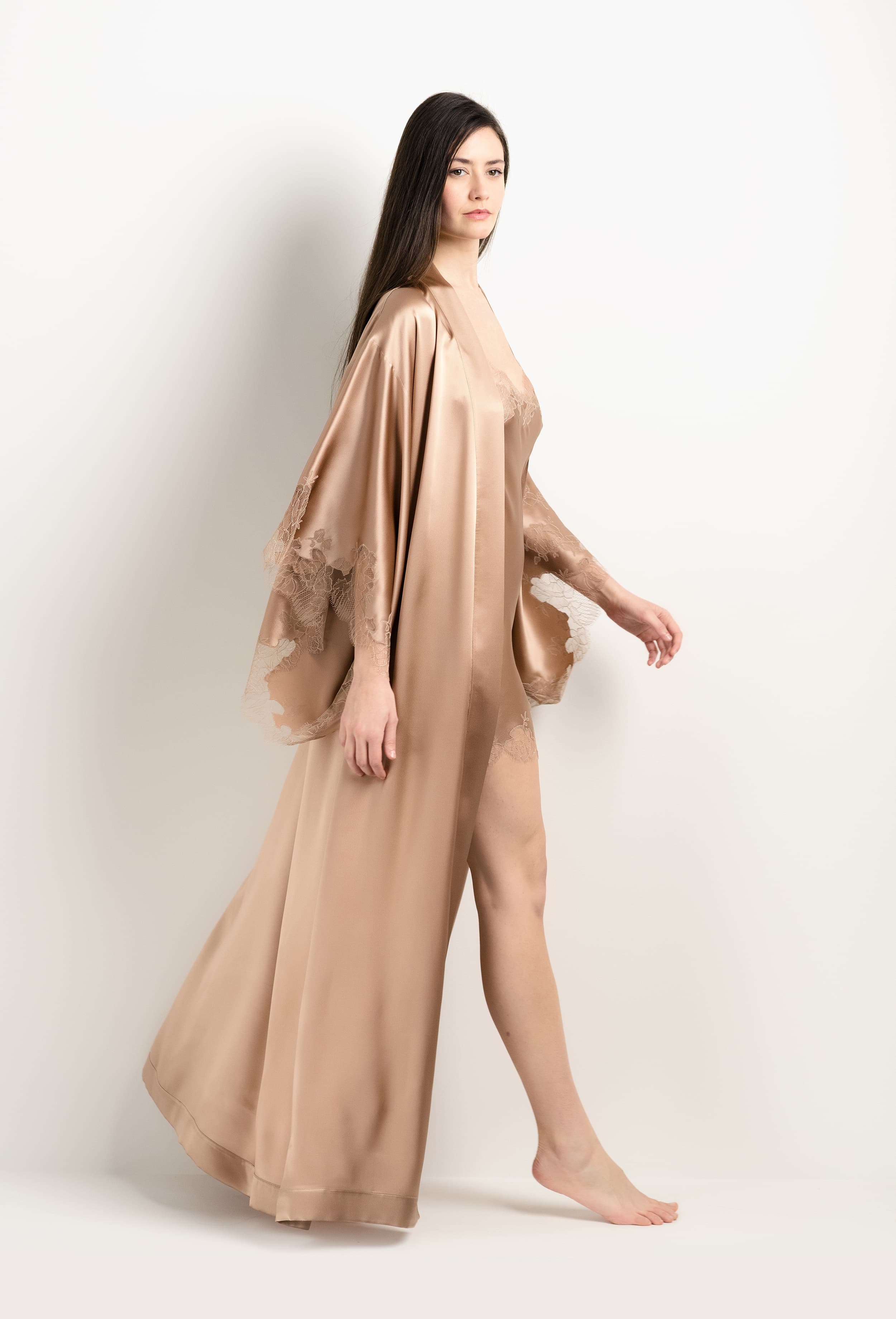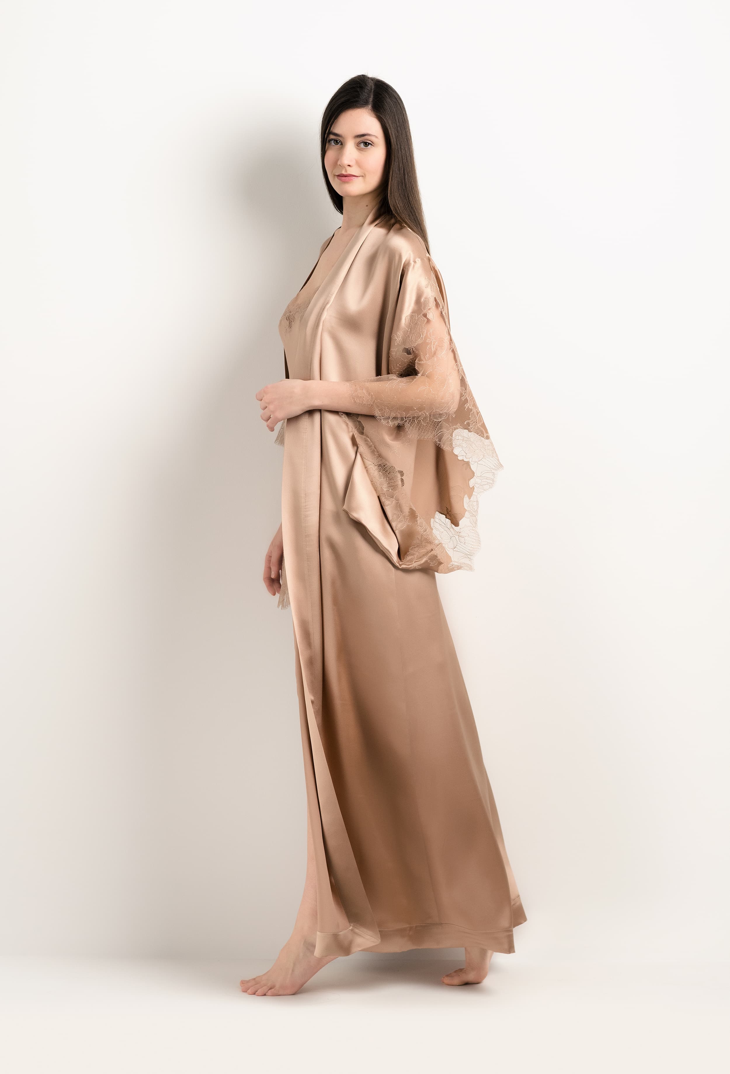 Inspired by traditional Japanese clothing, the kimono is an iconic piece from the house of Carine Gilson. In a warm and subtle tone, the lace Alba sits generously on the edge of the butterfly sleeves. It ties at the waist for a more fitted silhouette.