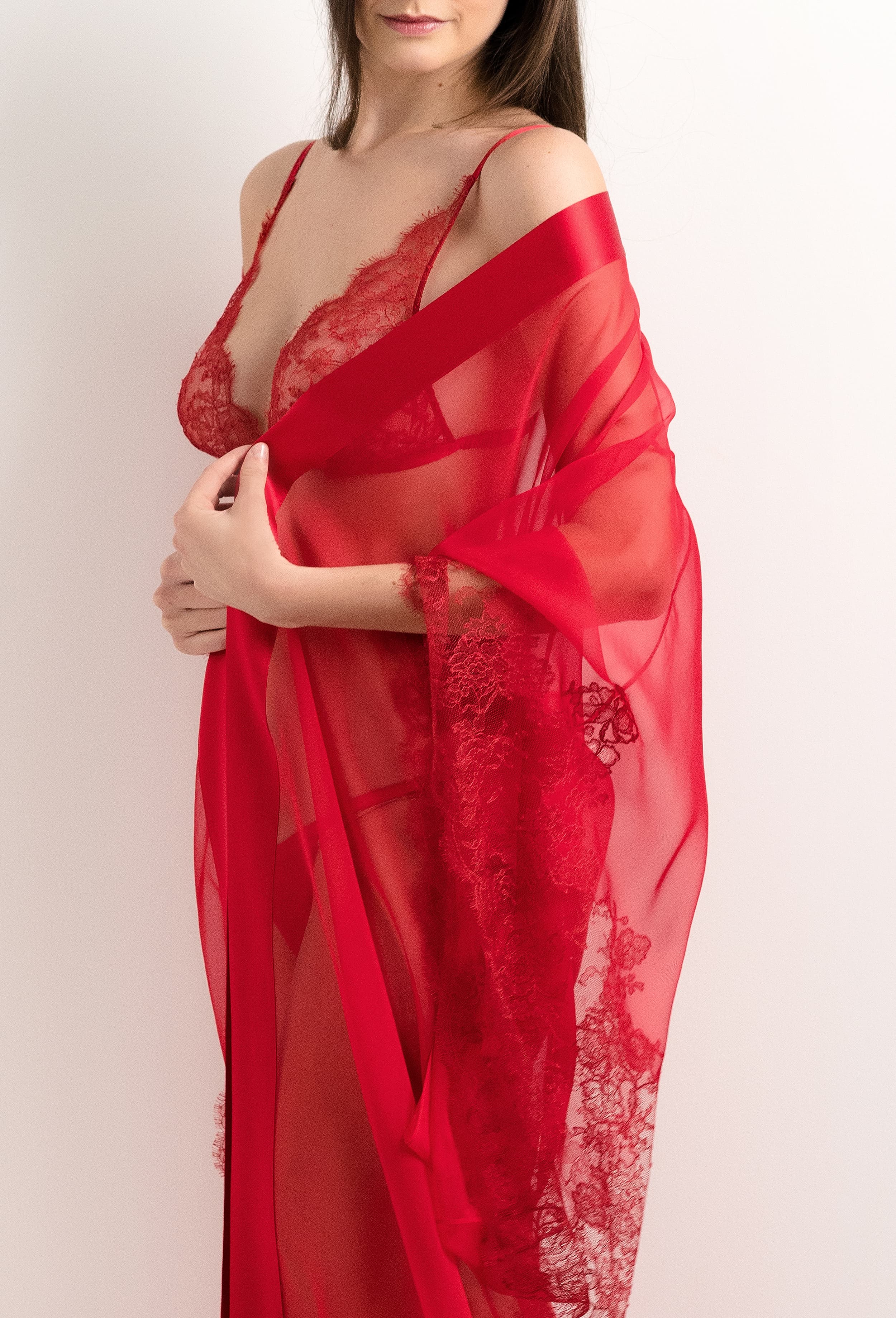 With its majestic butterfly sleeves, this long silk chiffon kimono is an iconic piece of the house Carine Gilson. The loose cut and transparency of silk give it lightness, amplified by lace inlays on the edge of s sleeves. Its long belt emphasizes the waist elegantly.