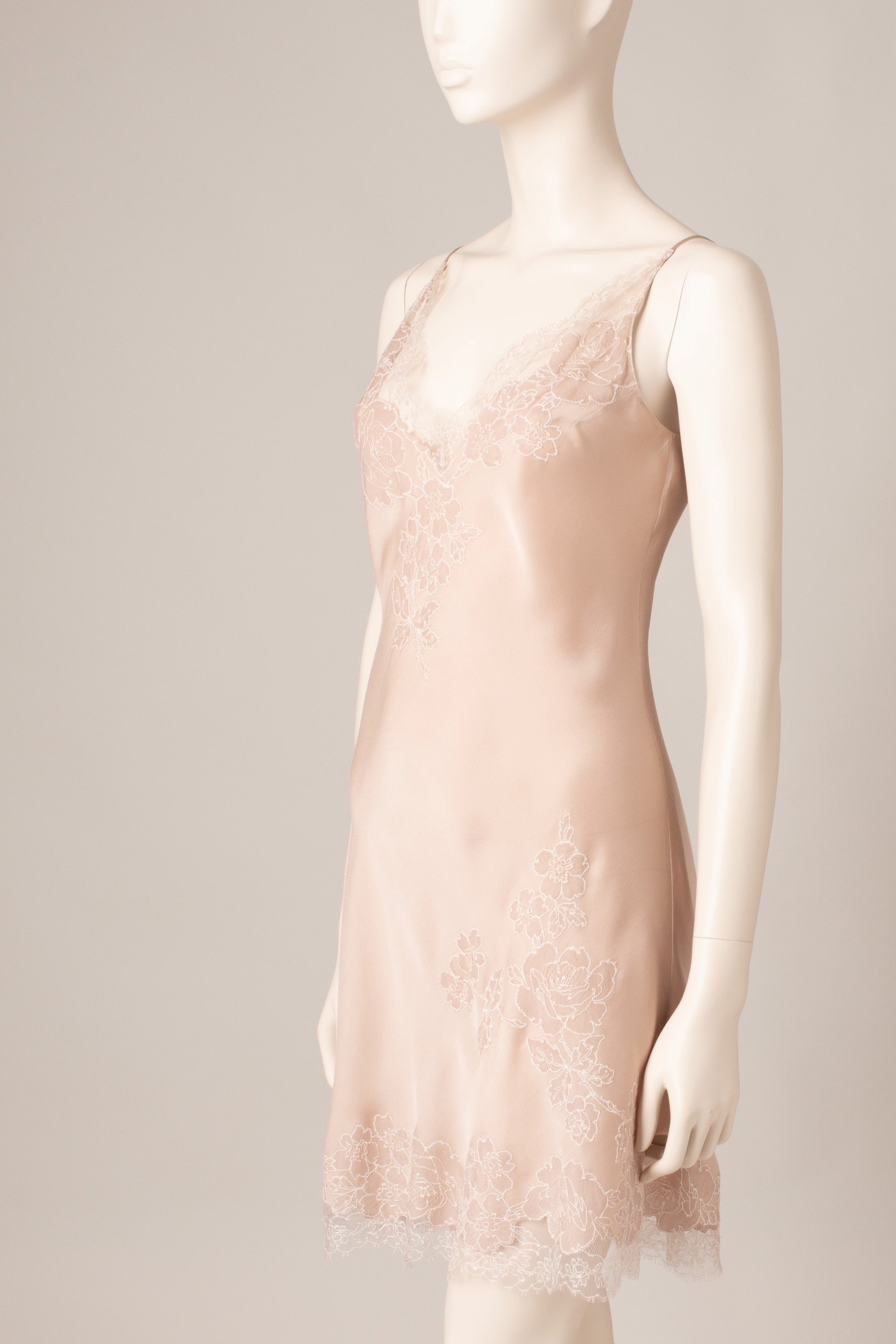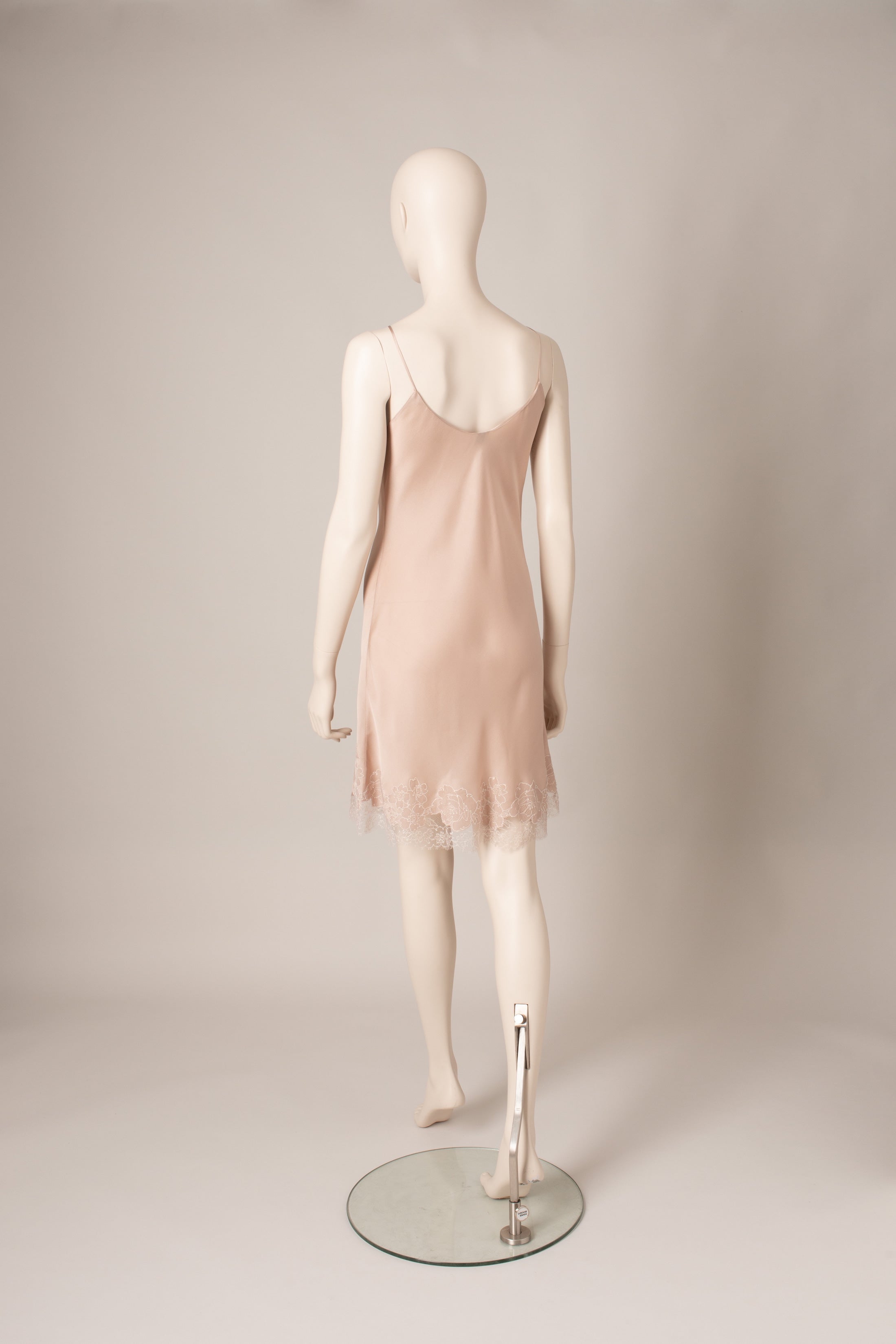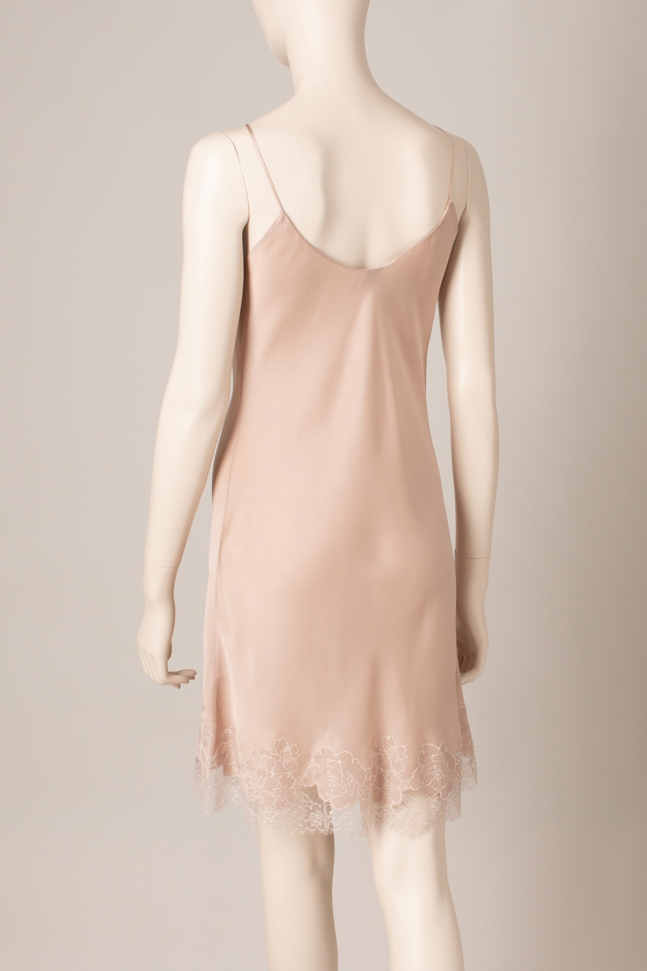 Silk nightgown with deep V neck. Cut in bias, allowing the fabric to stretch slightly to offer a more flattering drape and an optimal fit. Fine straps. Above the knee length.