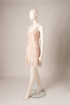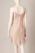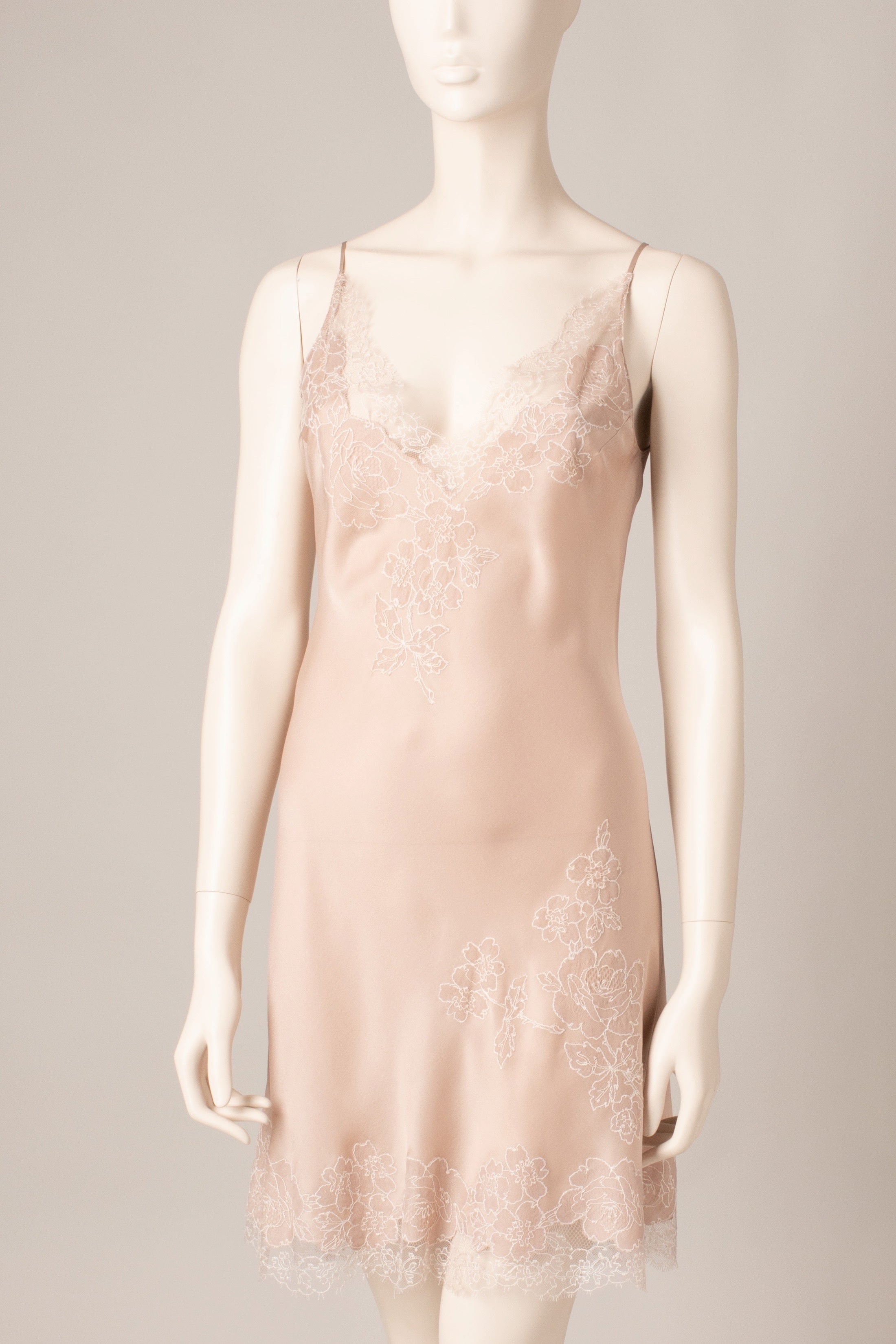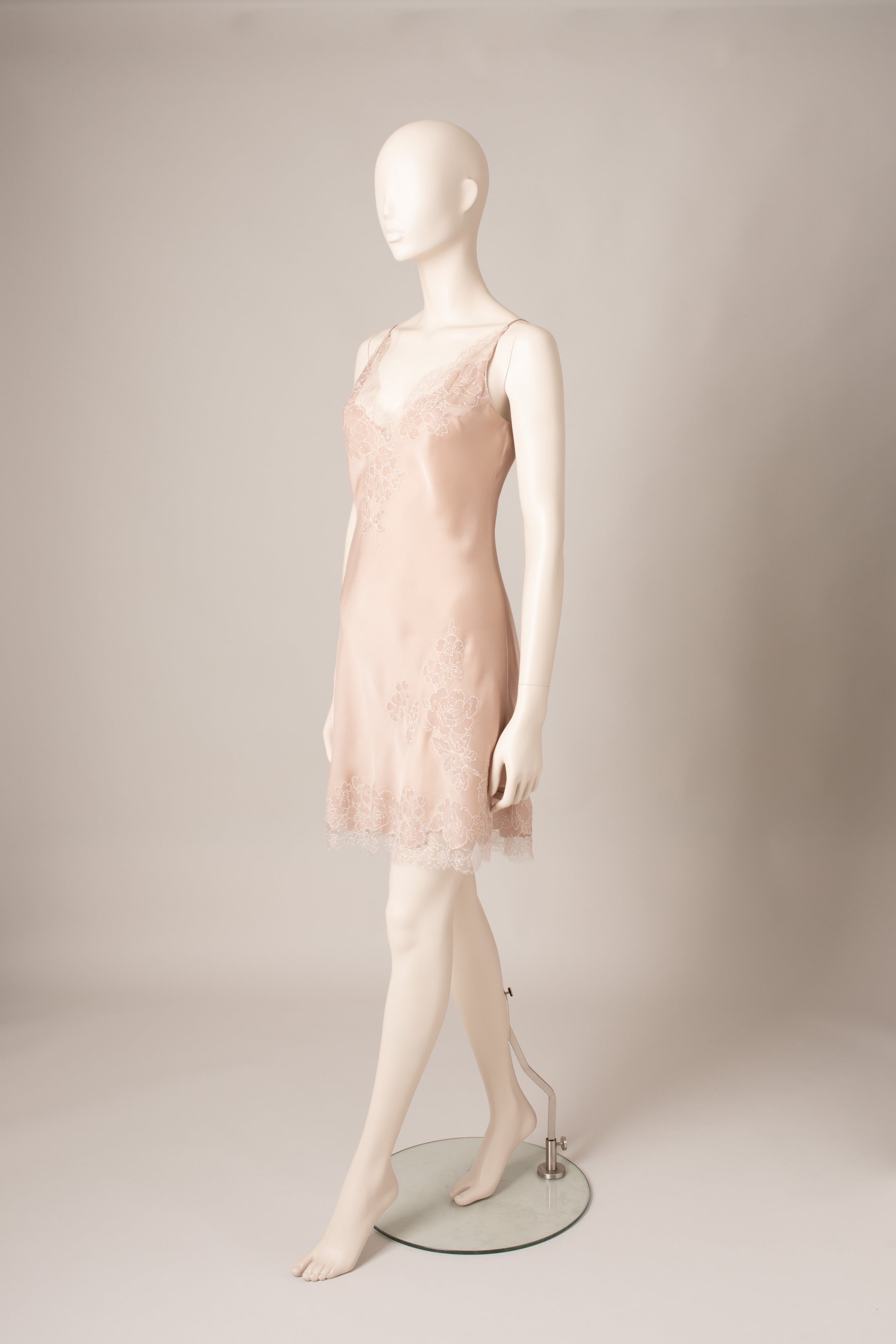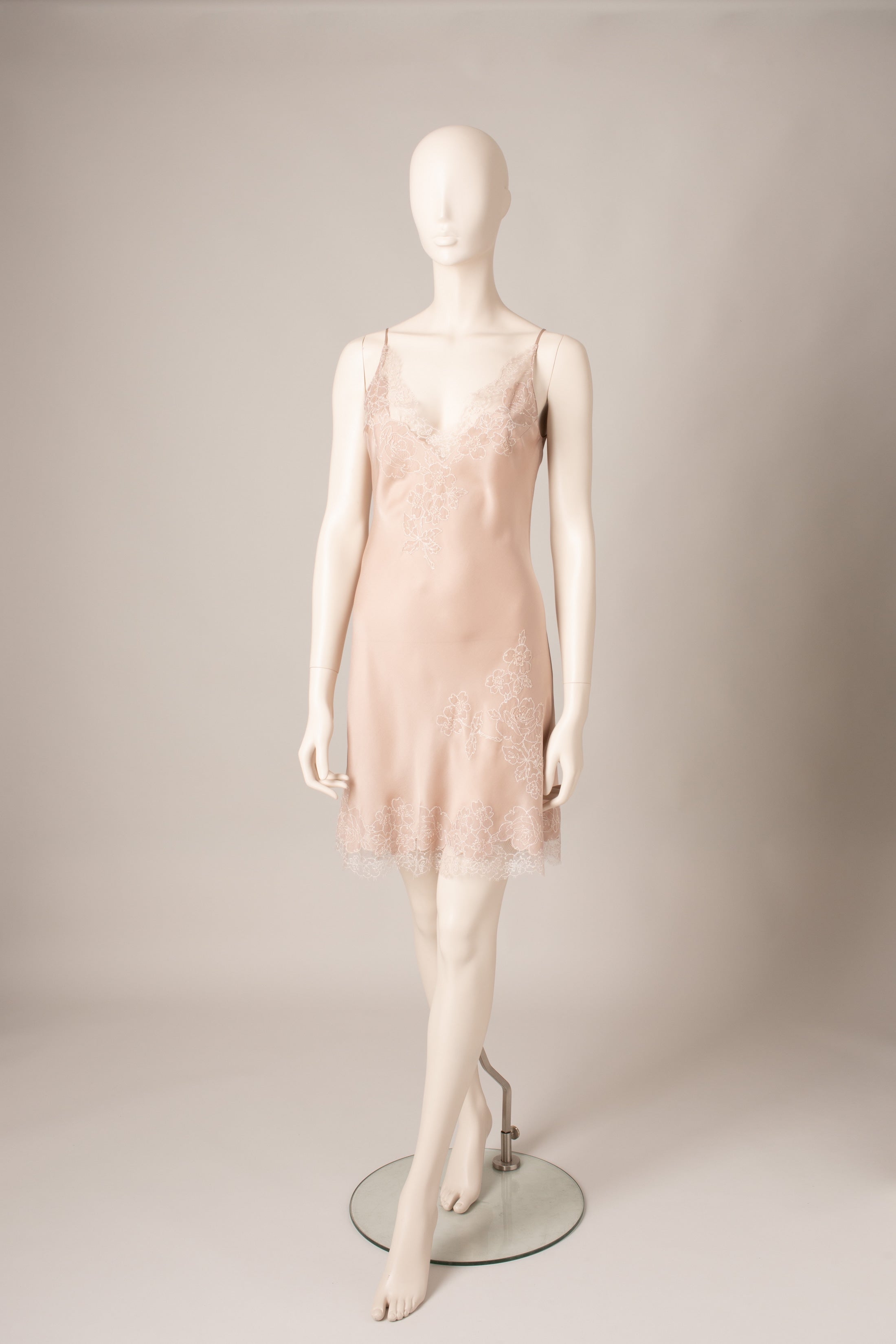 Silk nightgown with deep V neck. Cut in bias, allowing the fabric to stretch slightly to offer a more flattering drape and an optimal fit. Fine straps. Above the knee length.