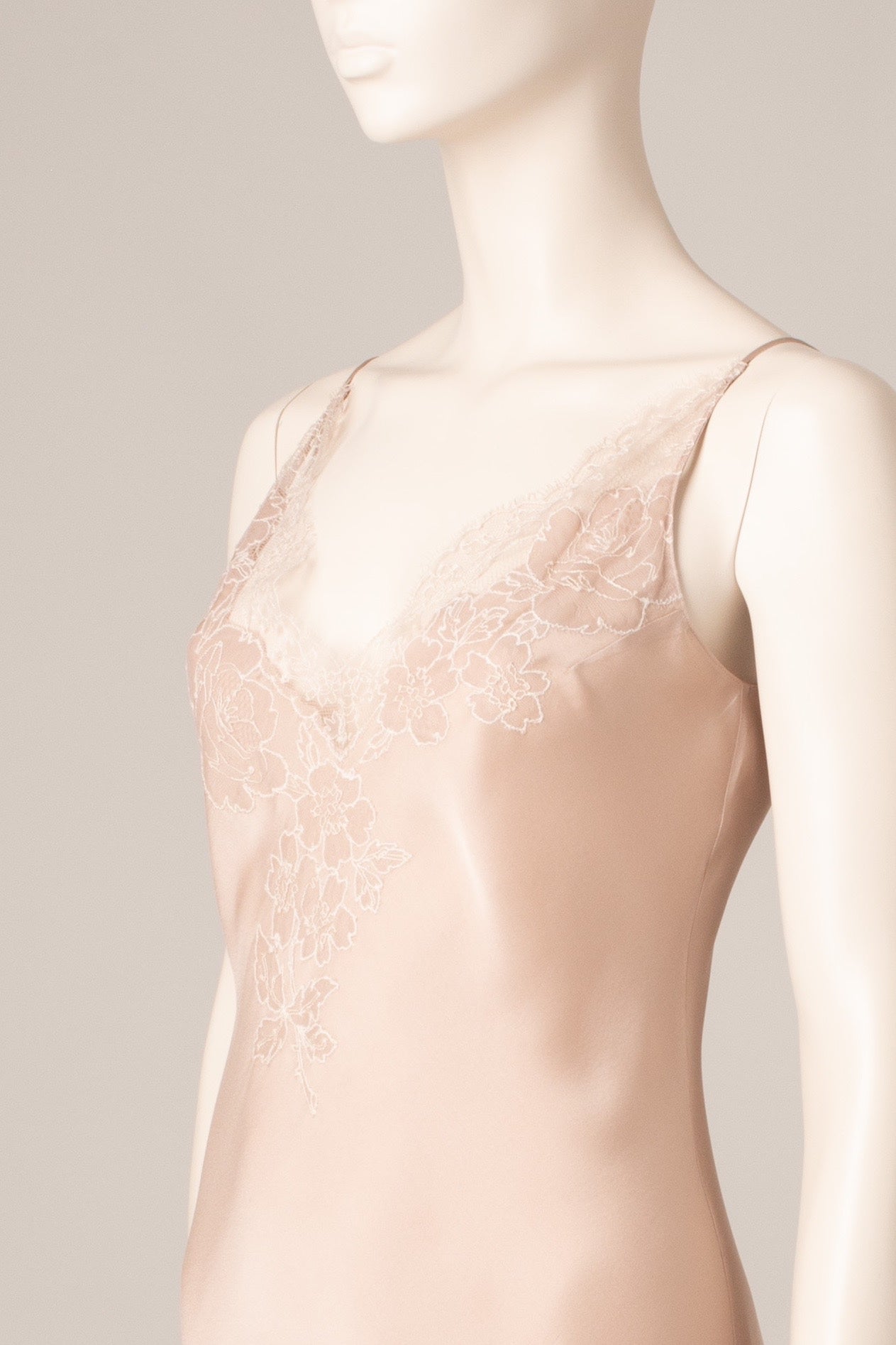 This light silk nightie is adorned with the wide festoon of Rosa lace. The clusters of flowers design a magnificent bouquet.
