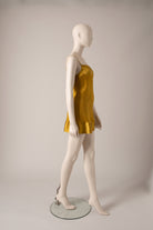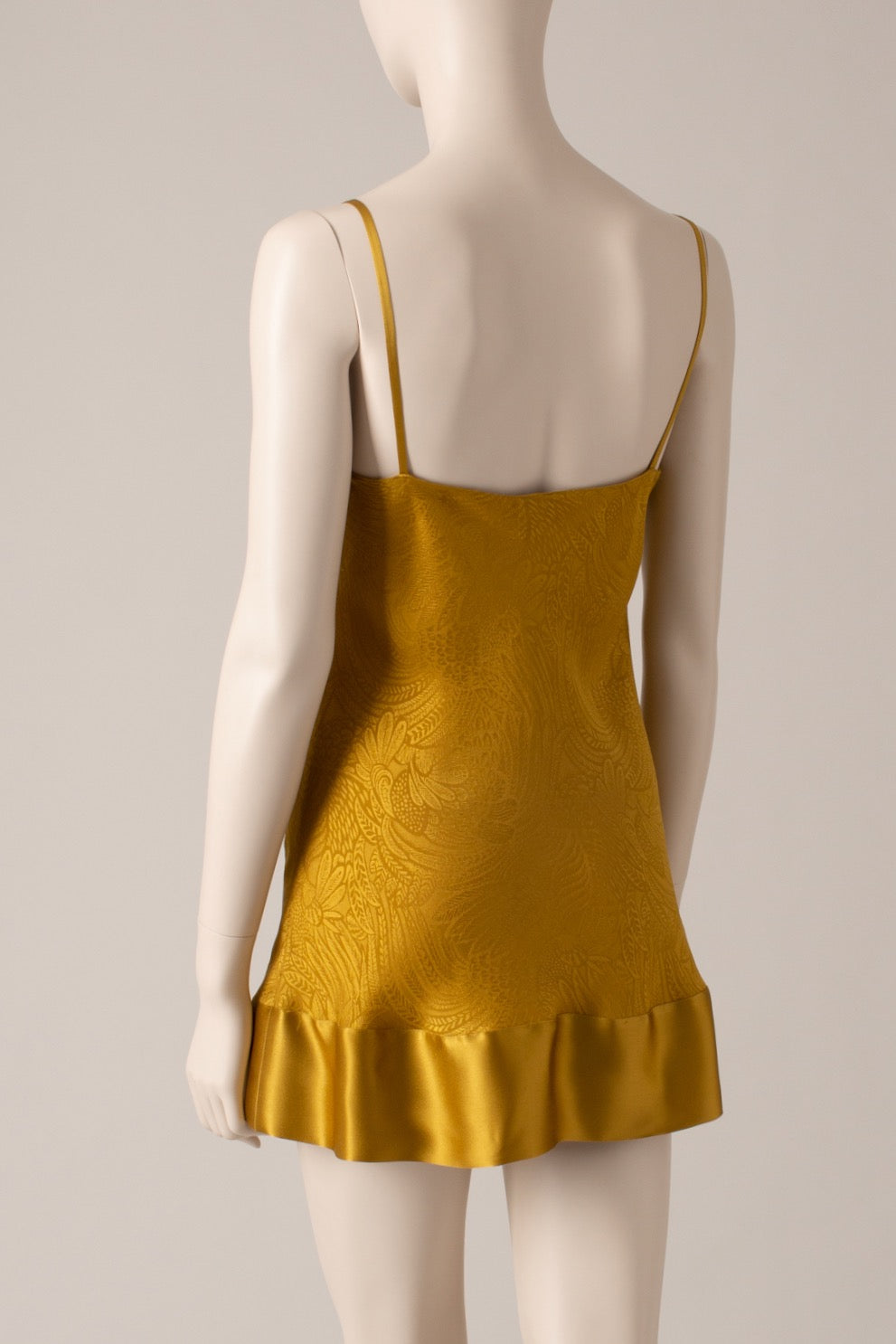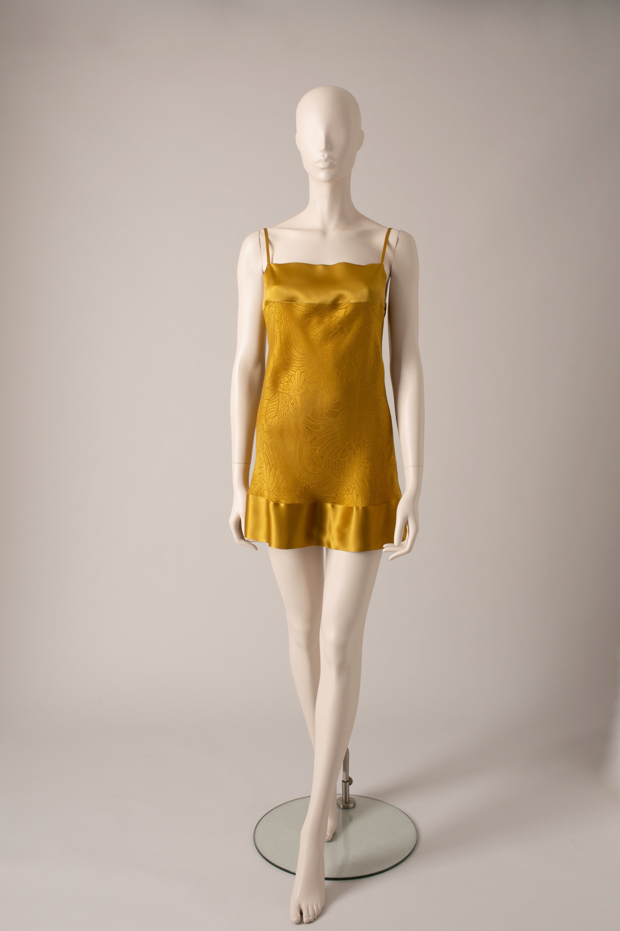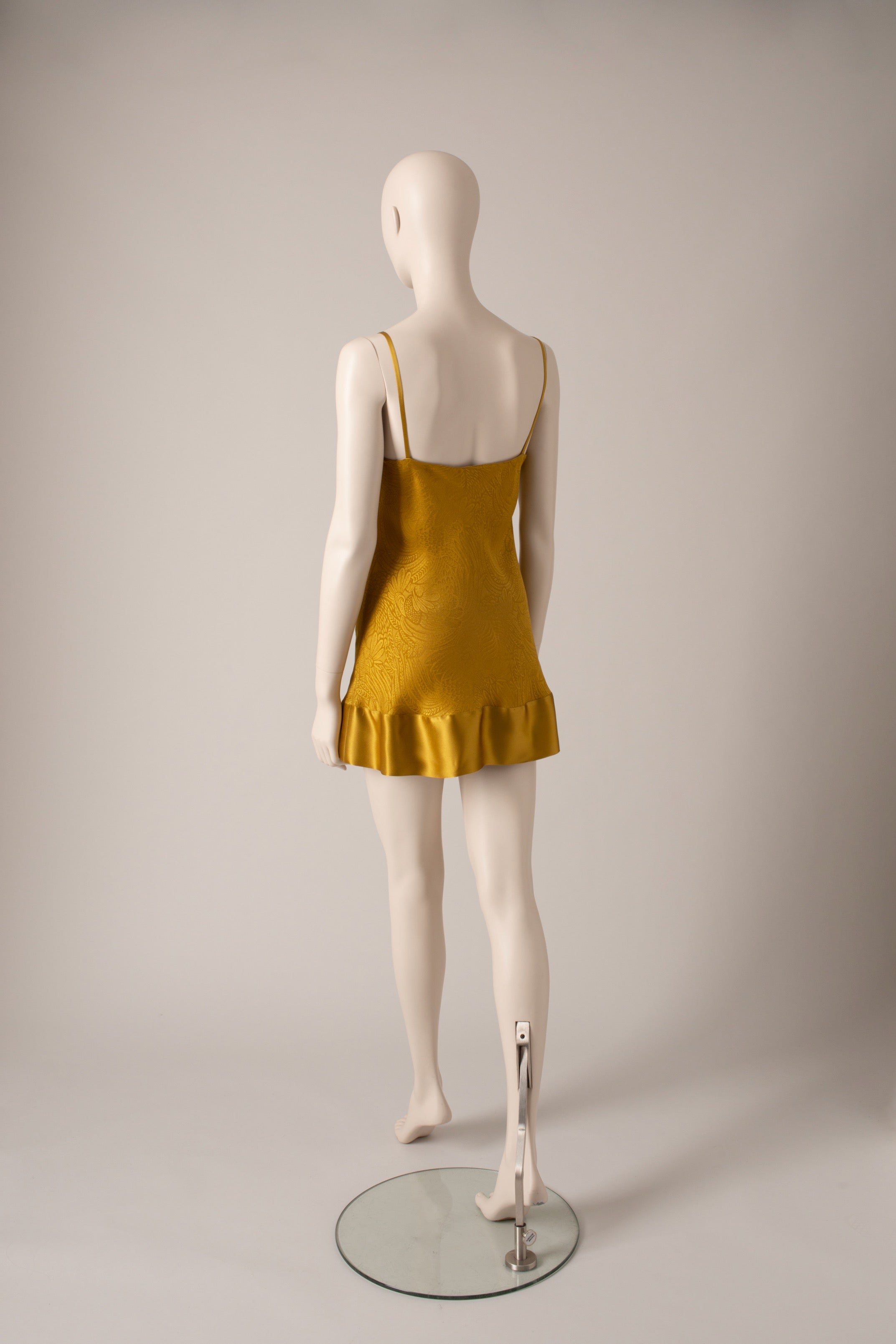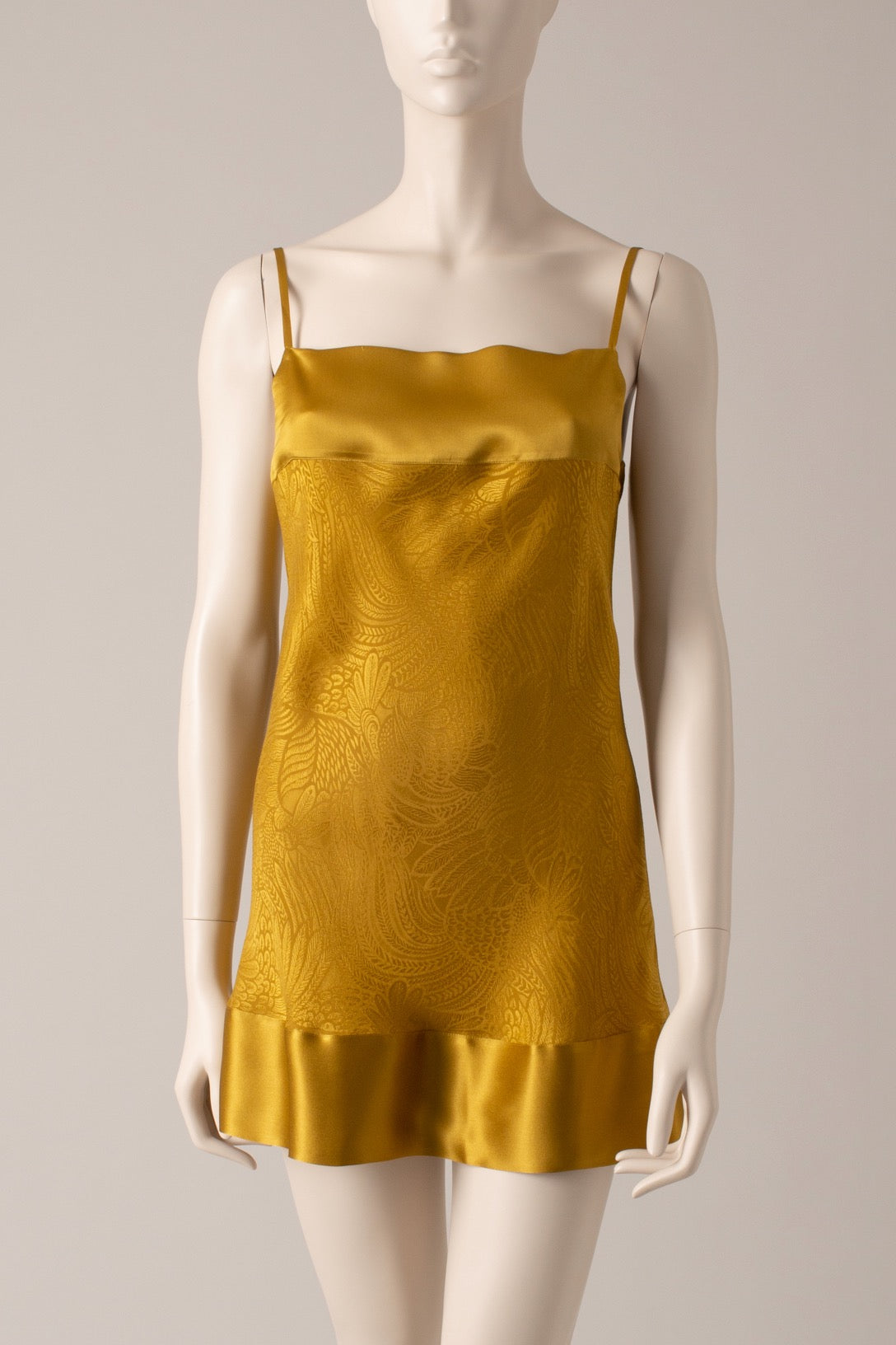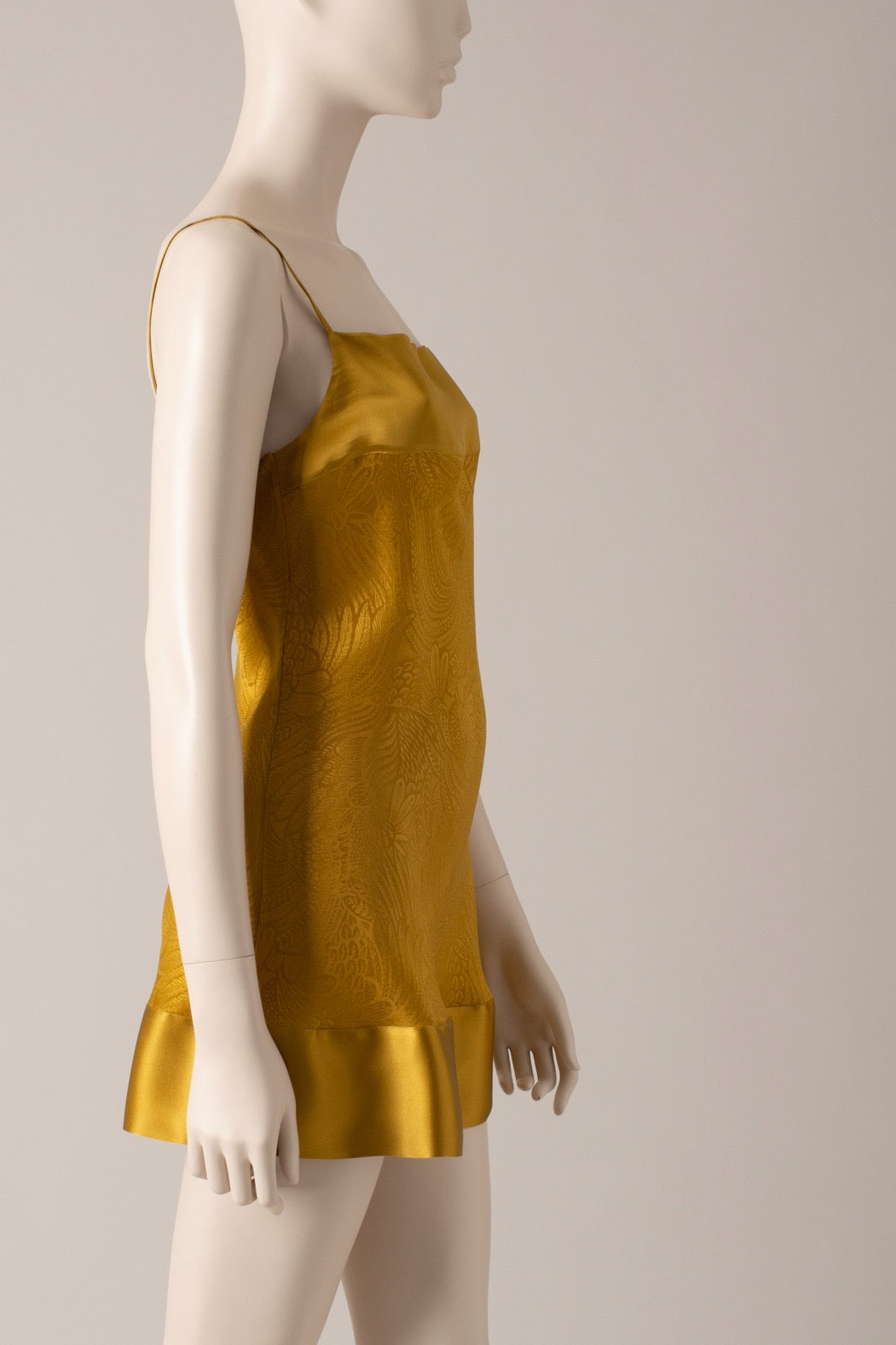 Silk babydoll with straight neckline Cut in bias, allowing the fabric to stretch slightly to offer a more flattering drape and an optimal fit. Fine straps. Length : mini.
