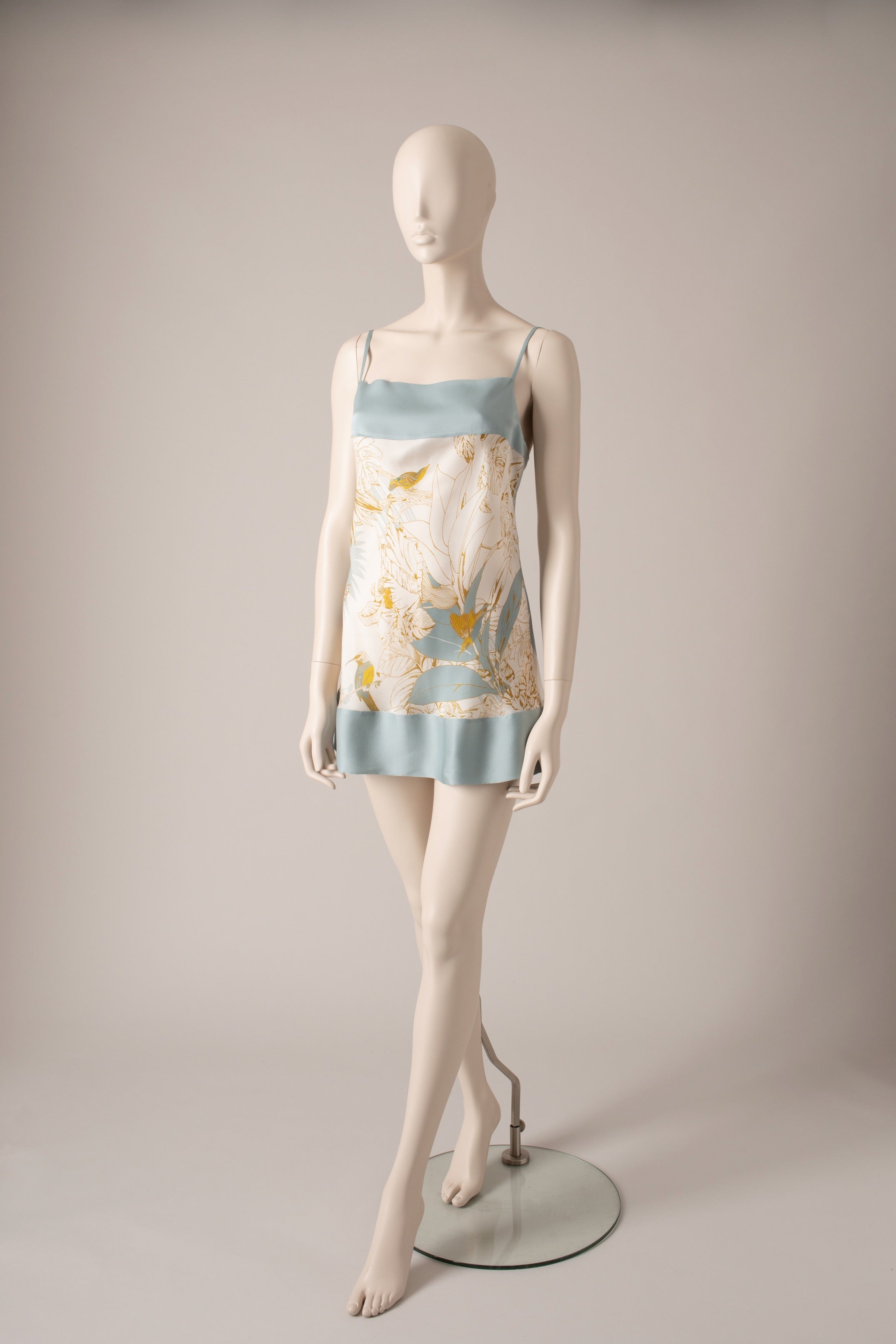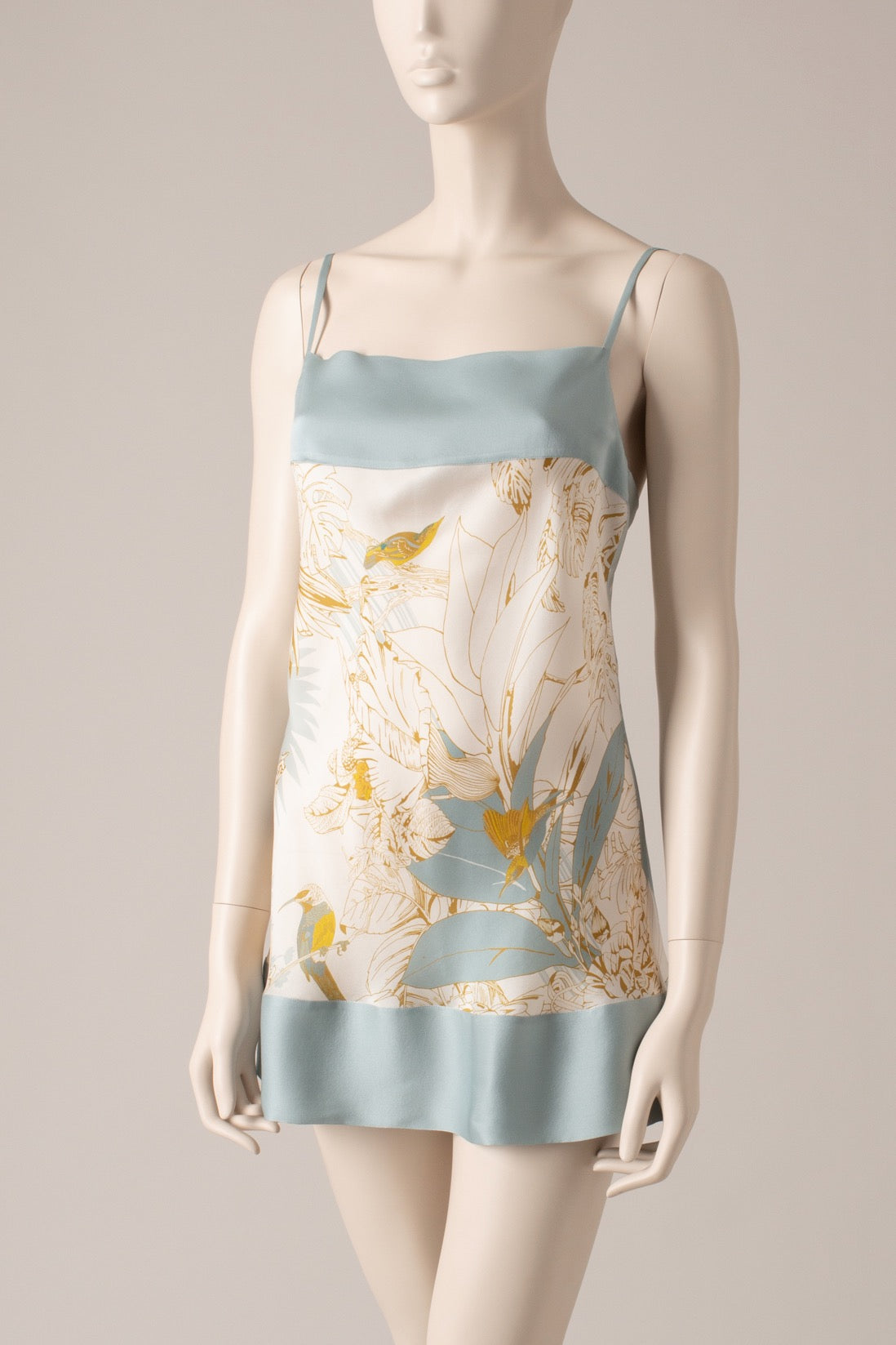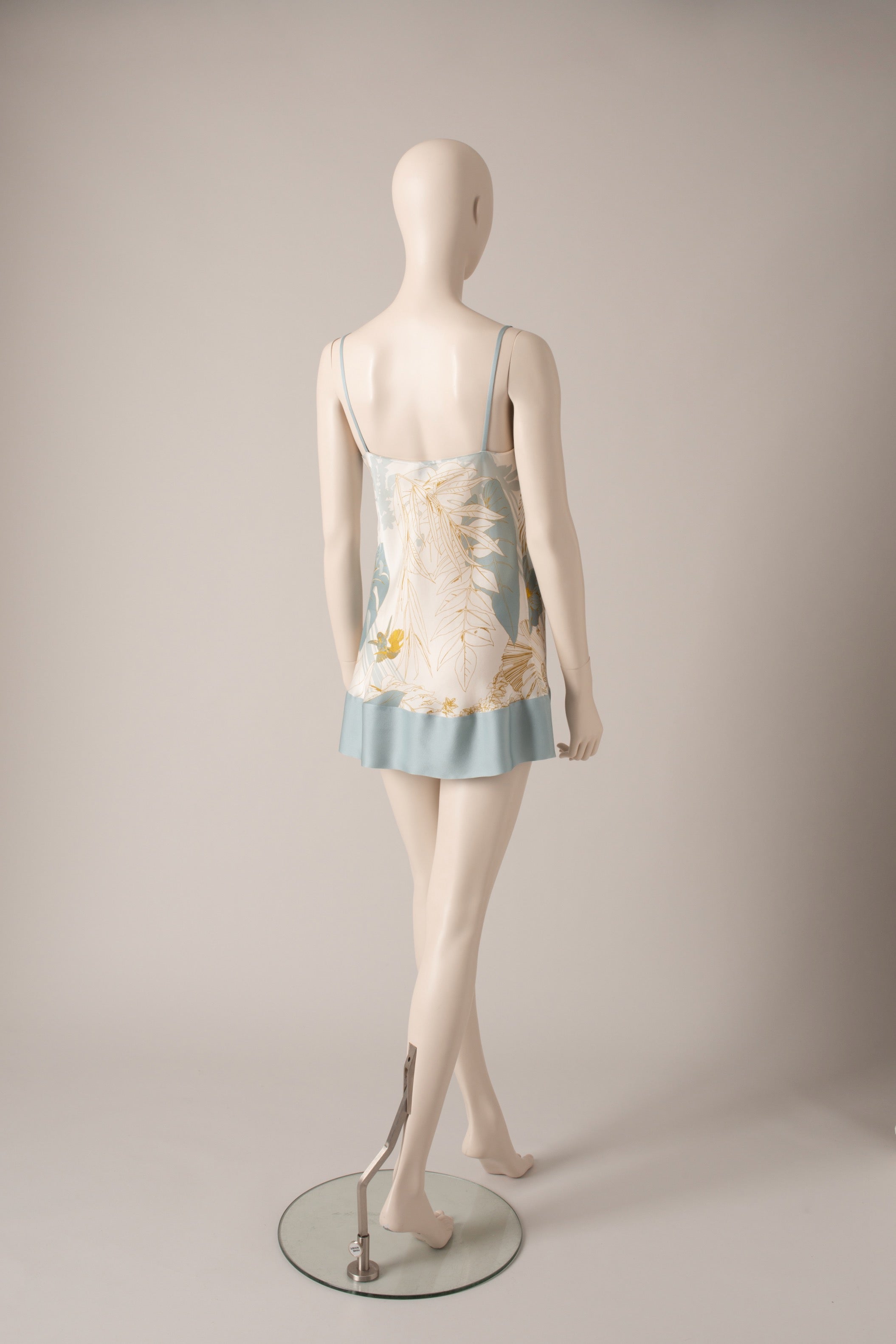 Silk babydoll with straight neckline Cut in bias, allowing the fabric to stretch slightly to offer a more flattering drape and an optimal fit. Fine straps. Length : mini.
