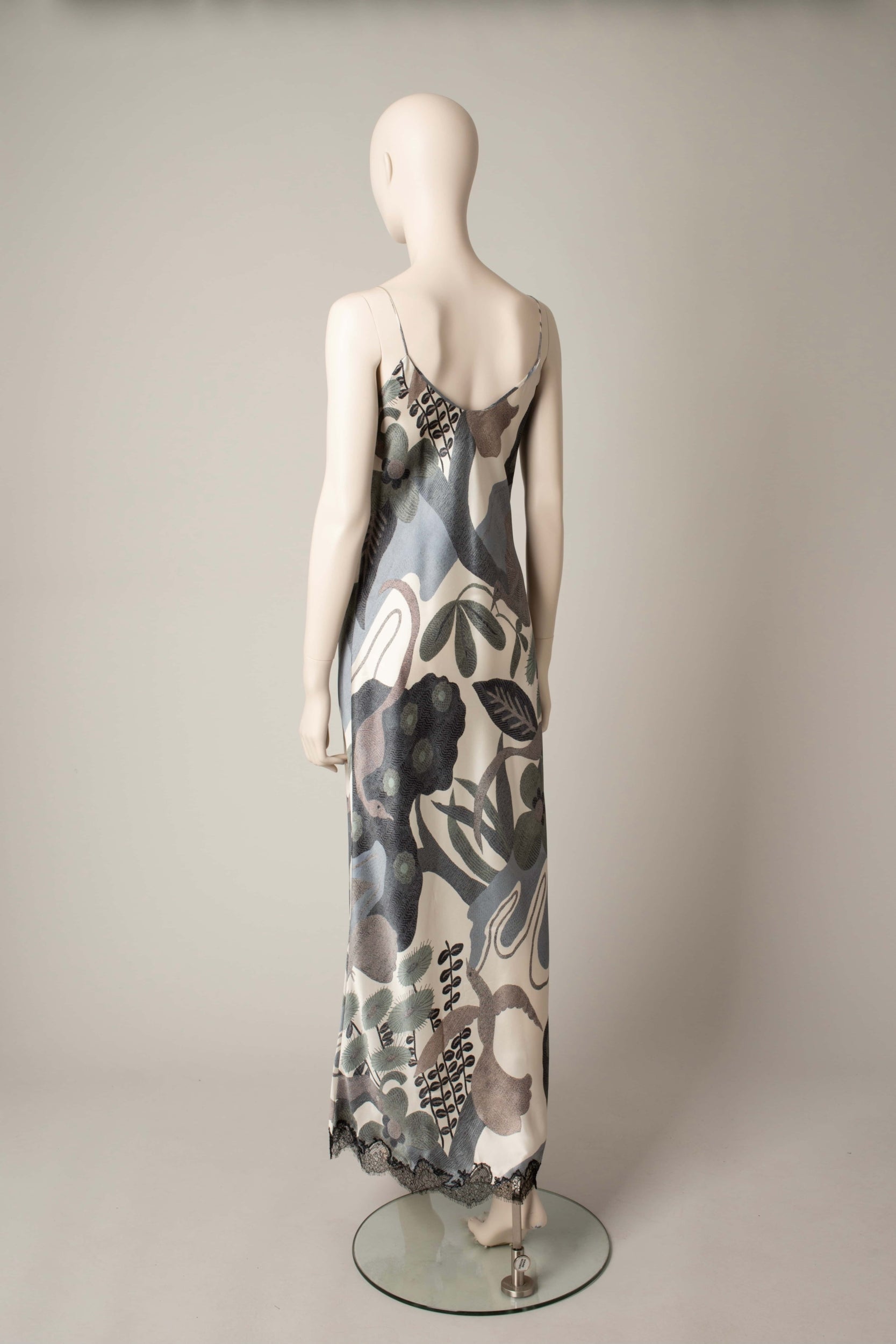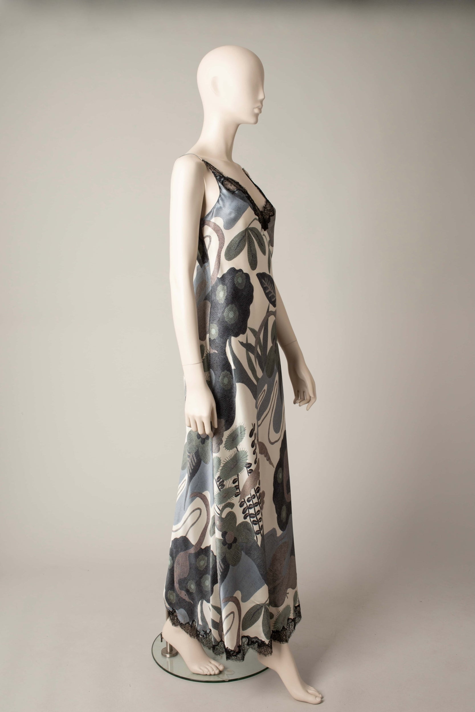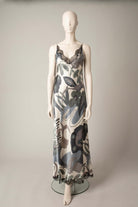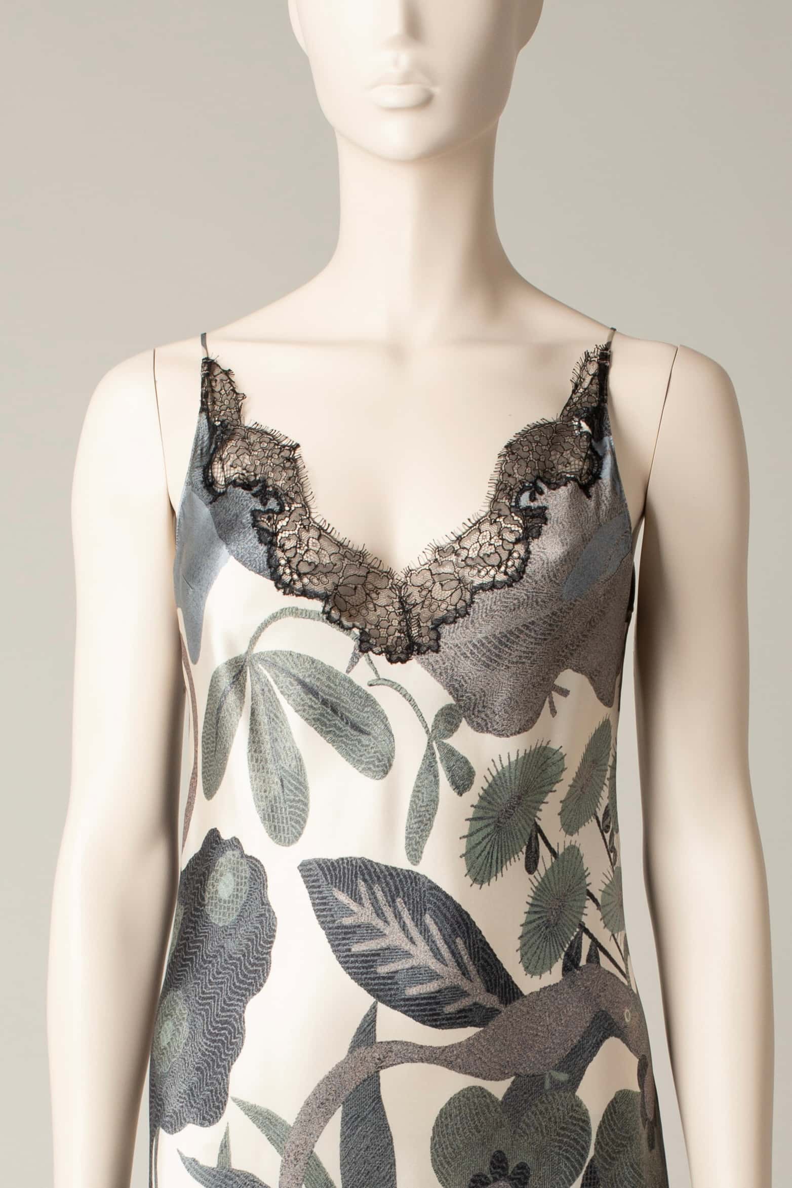 Long silk slip dress - Blue grey ENVOL print and Black Egerie lace