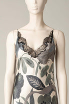 Long nightgown in printed silk inlaid with lace on the V neck and the hem. Cut in bias, allowing the fabric to stretch slightly to offer a more flattering drape and an optimal fit. Fine straps. Length : Ankle length - approx 144cm. Printed silk - "Envol" design with black Caudry lace.