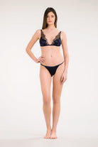 Beautifully crafted in satin silk and embellished with Caudry lace incrustation, this flattering triangle bra is a woman’s wardrobe must-have. Its delicate cups seem to melt and become one with the skin beneath.