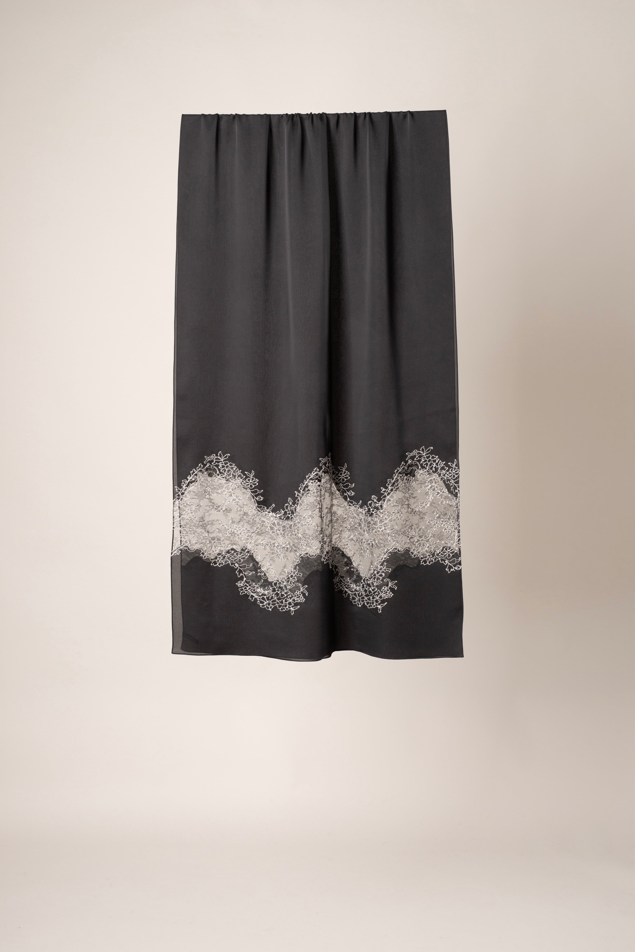 Transparency and lightness. The two-tone lace is delicately placed across light silk.