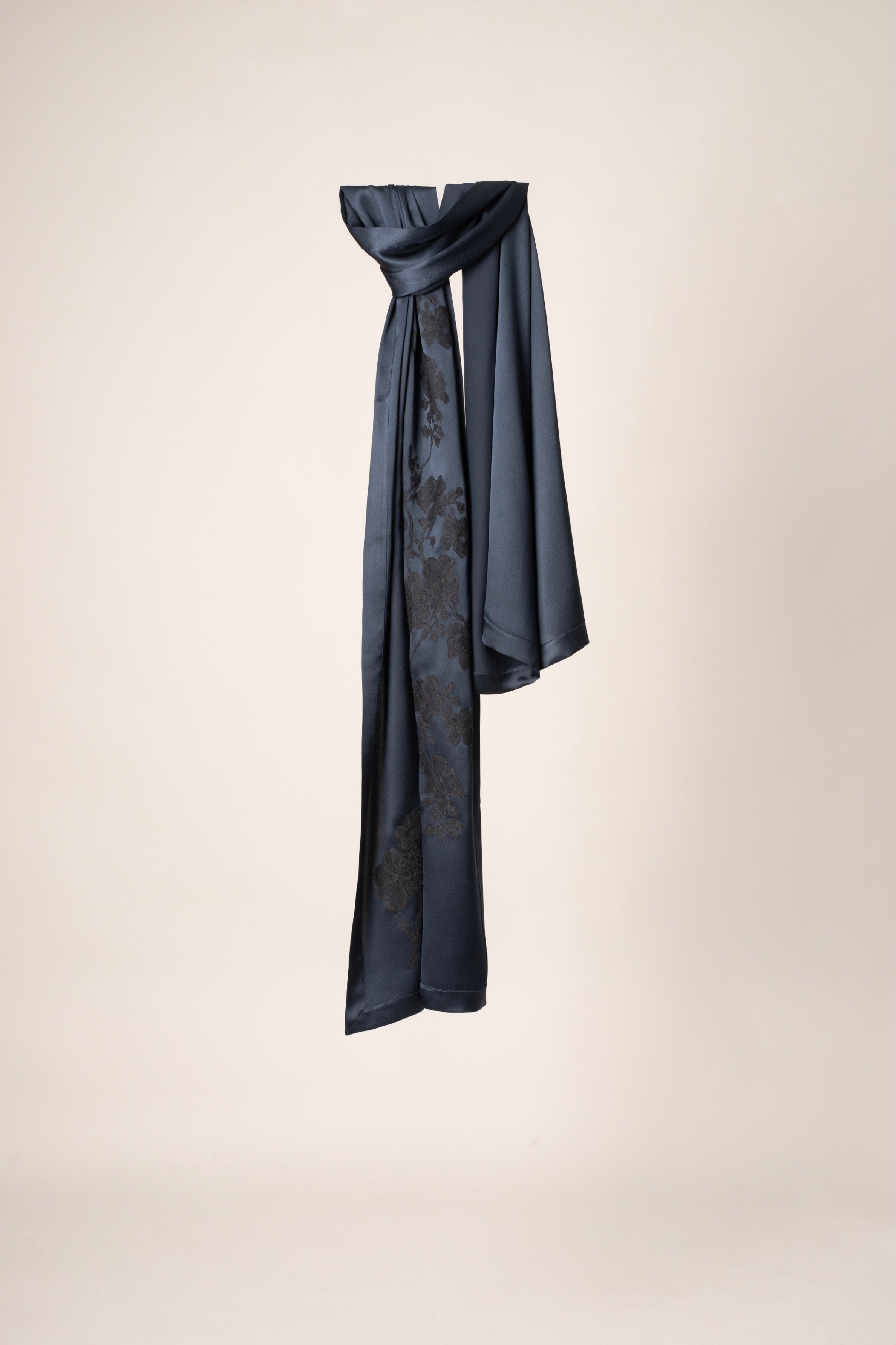 Etole en soie Bleu foncé et dentelle Sakura noire