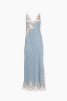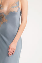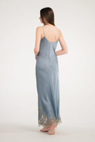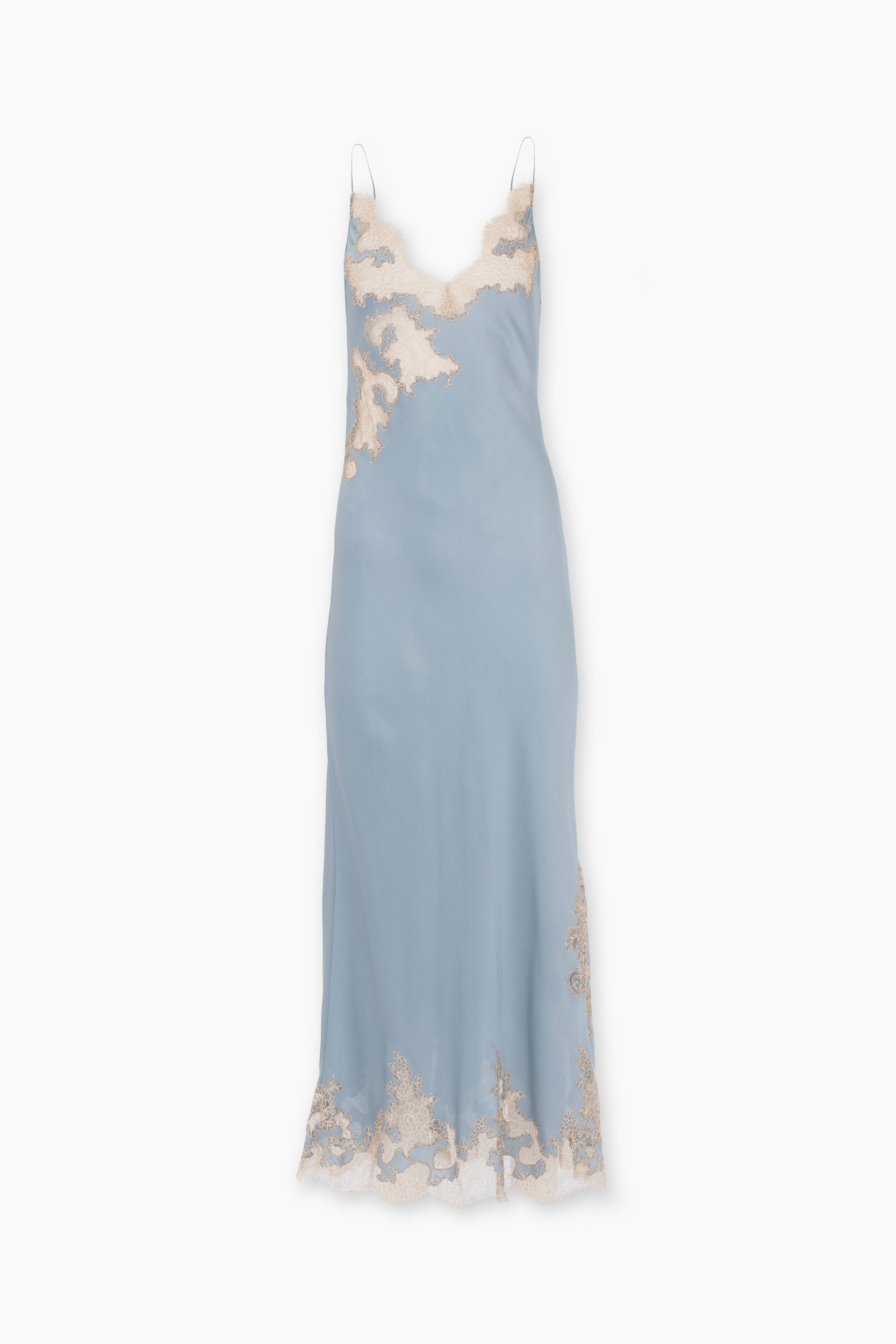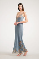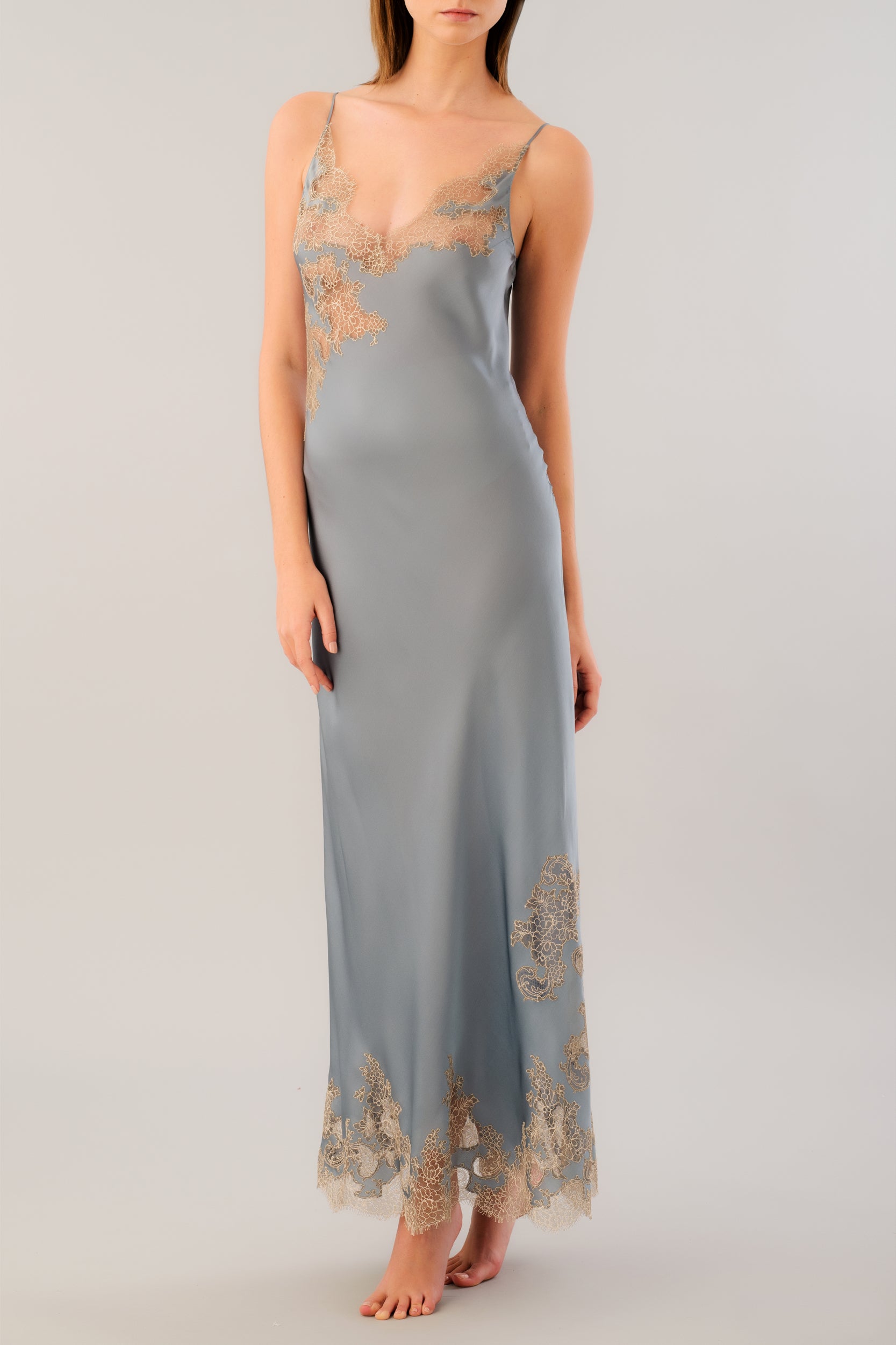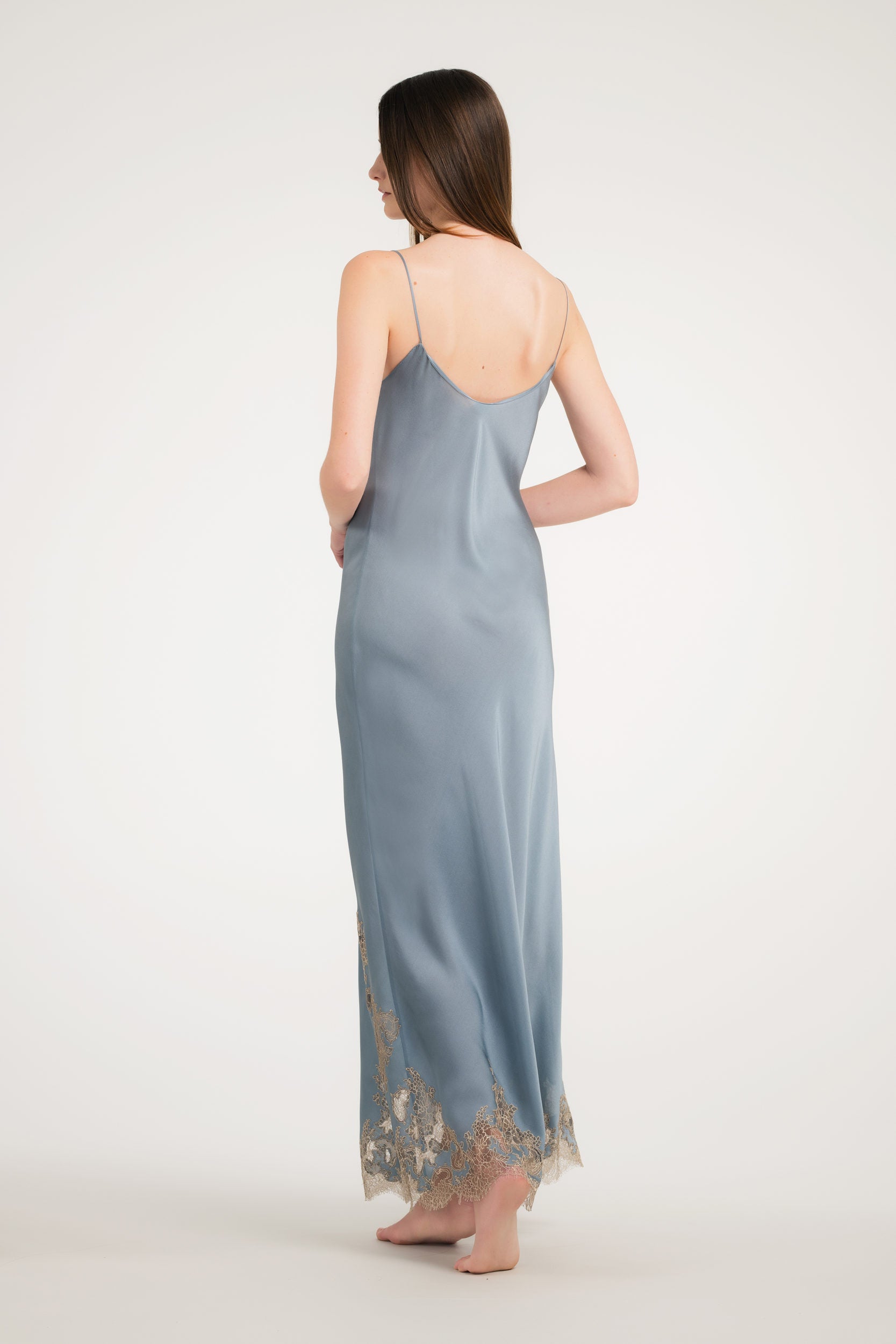 Longue robe de nuit en soie, décolleté V profond. Coupe en biais, permettant au tissu de s’étirer légèrement pour offrir un drapé plus flatteur et un ajustement optimal. Fines bretelles. Longueur cheville- environ 140 cm.