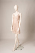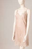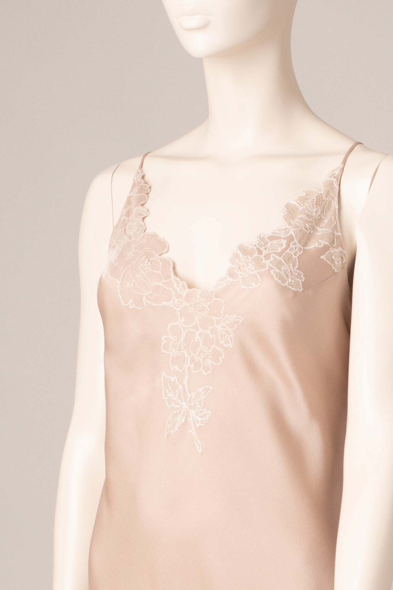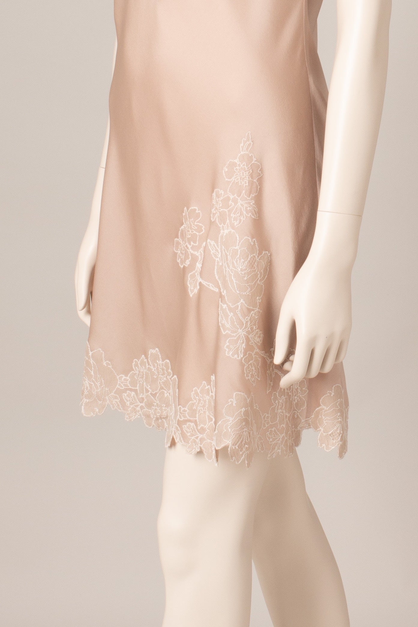 La dentelle Rosa se pose d'abord délicatement sur le decolleté et le bas de cette nuisette en soie légère. Puis d'autres roses, parfois ajourées, parfois decoupées, enrichissent ce jardin de soie.