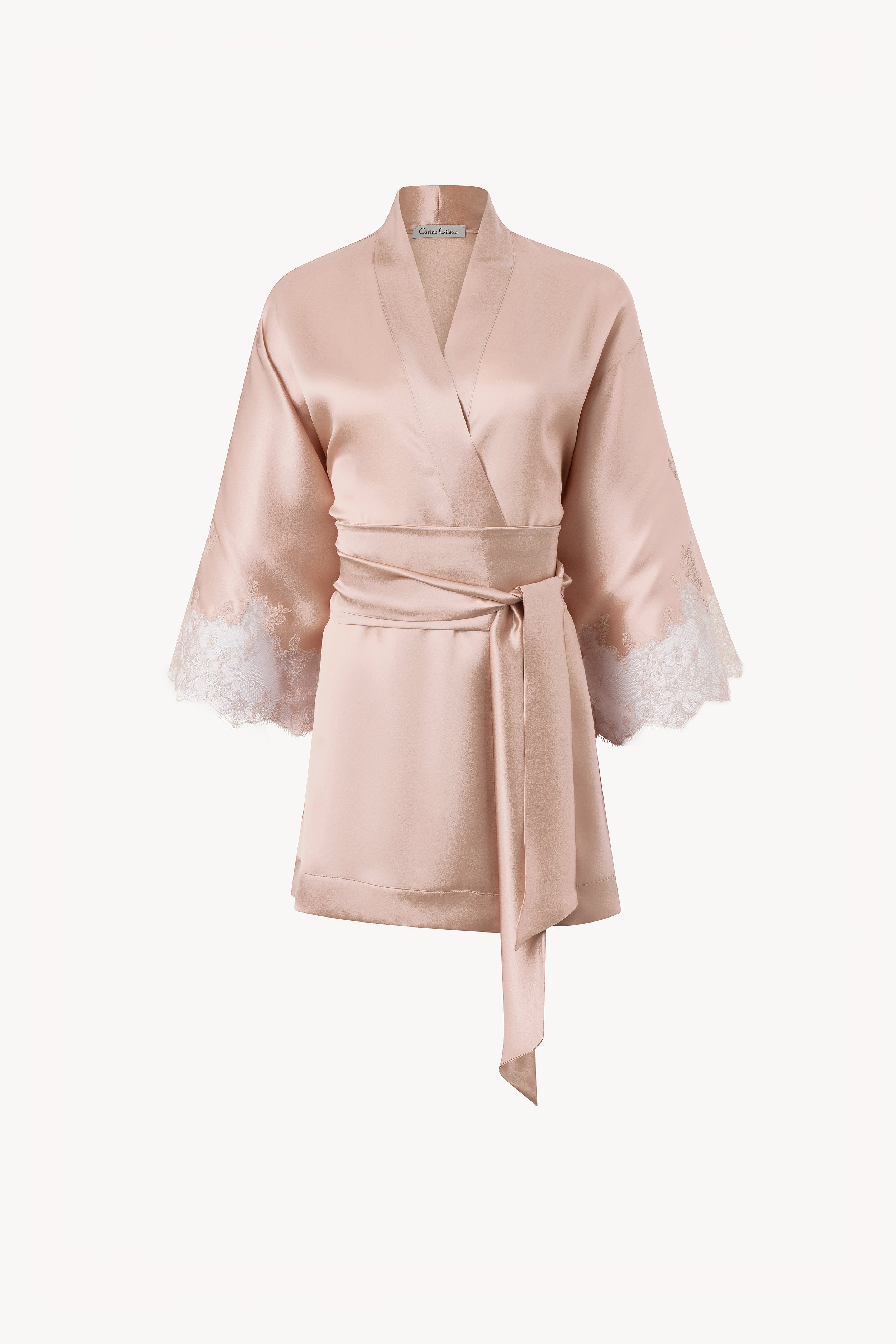 Kimono court en soie rose clair et dentelle Louise rosa