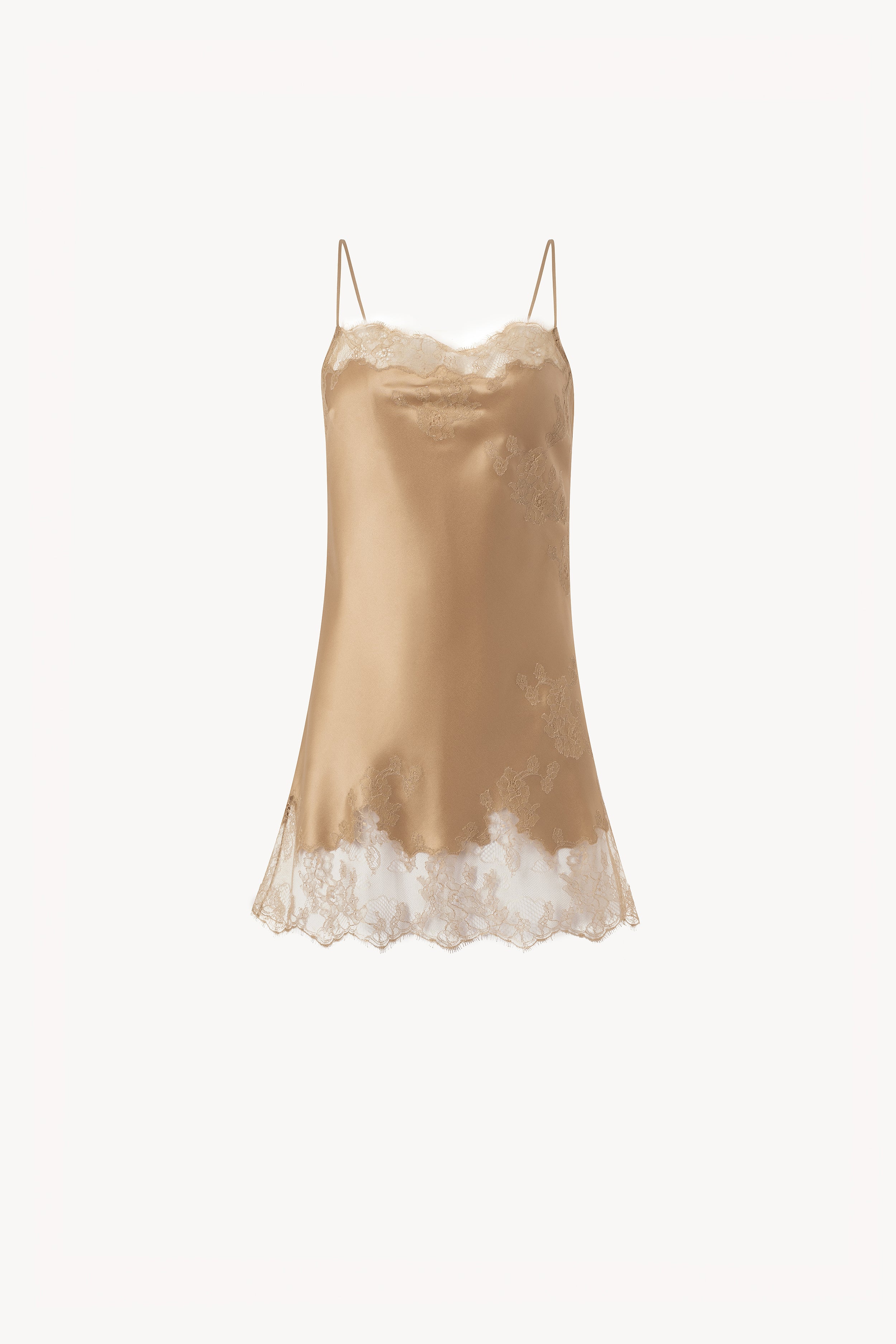 Les silhouettes créés par Carine Gilson subliment le corps et celles qui les portent et cette nuisette courte aux airs faussement sage ne fait pas exception. Réalisée en soie, la dentelle Louise crée un motif fleuri transparent et raffiné qui recouvre son encolure droite et son ourlet.