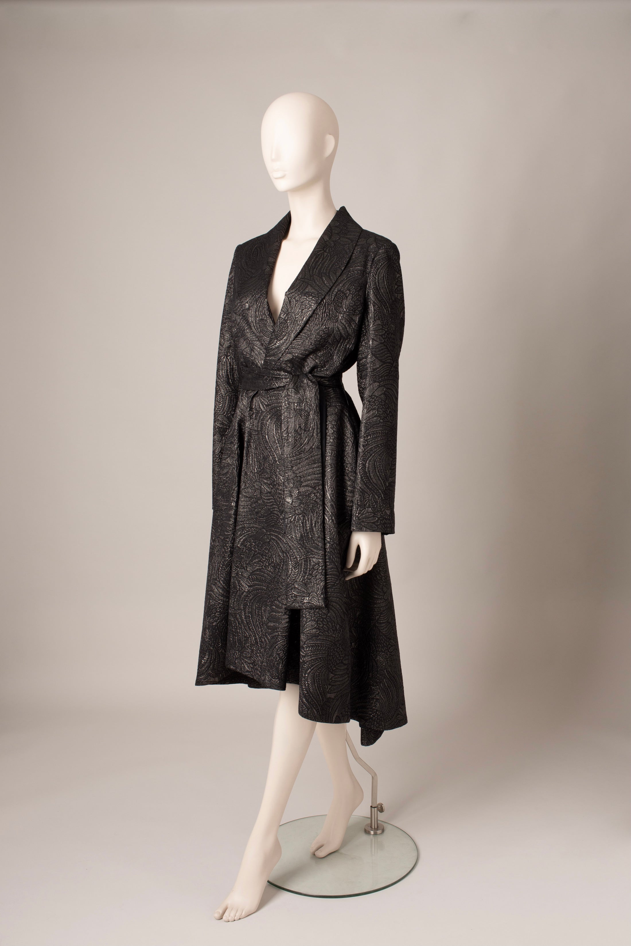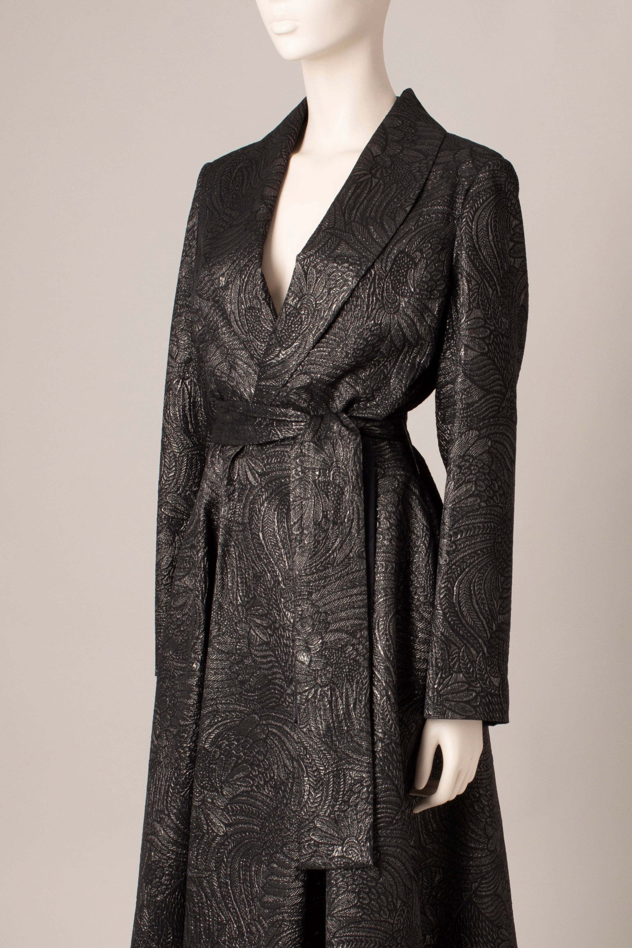 Le jacquard Passerin, avec ses motifs de grands feuillages aux reflets argentés, illumine cette robe manteau. Le col chale en soie noire reprend les codes du smoking pour élégance absolue.