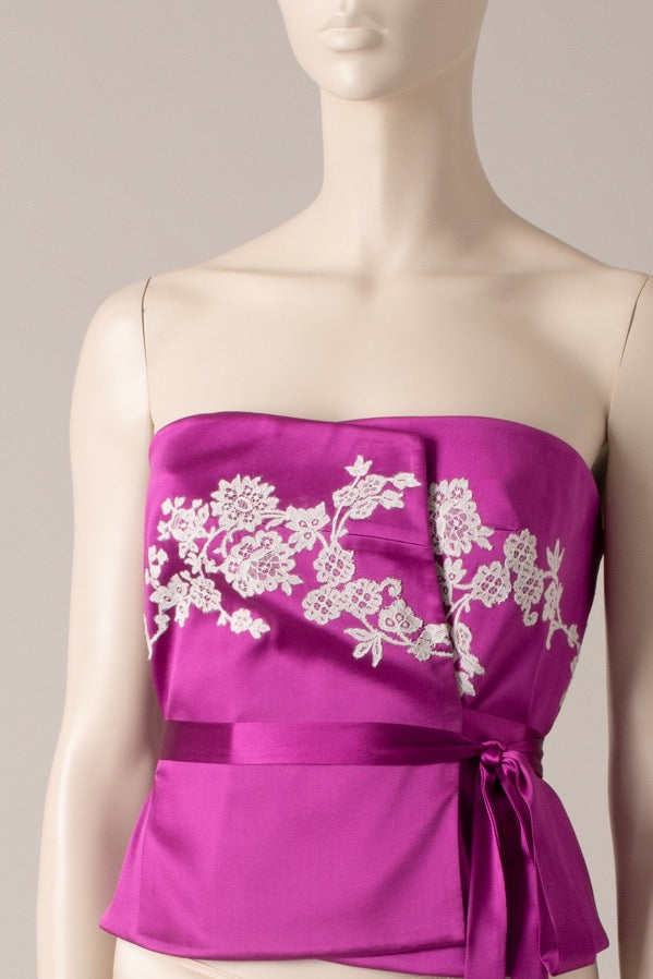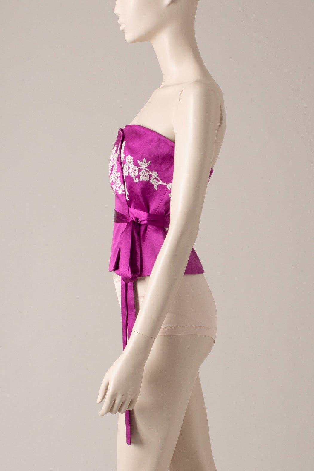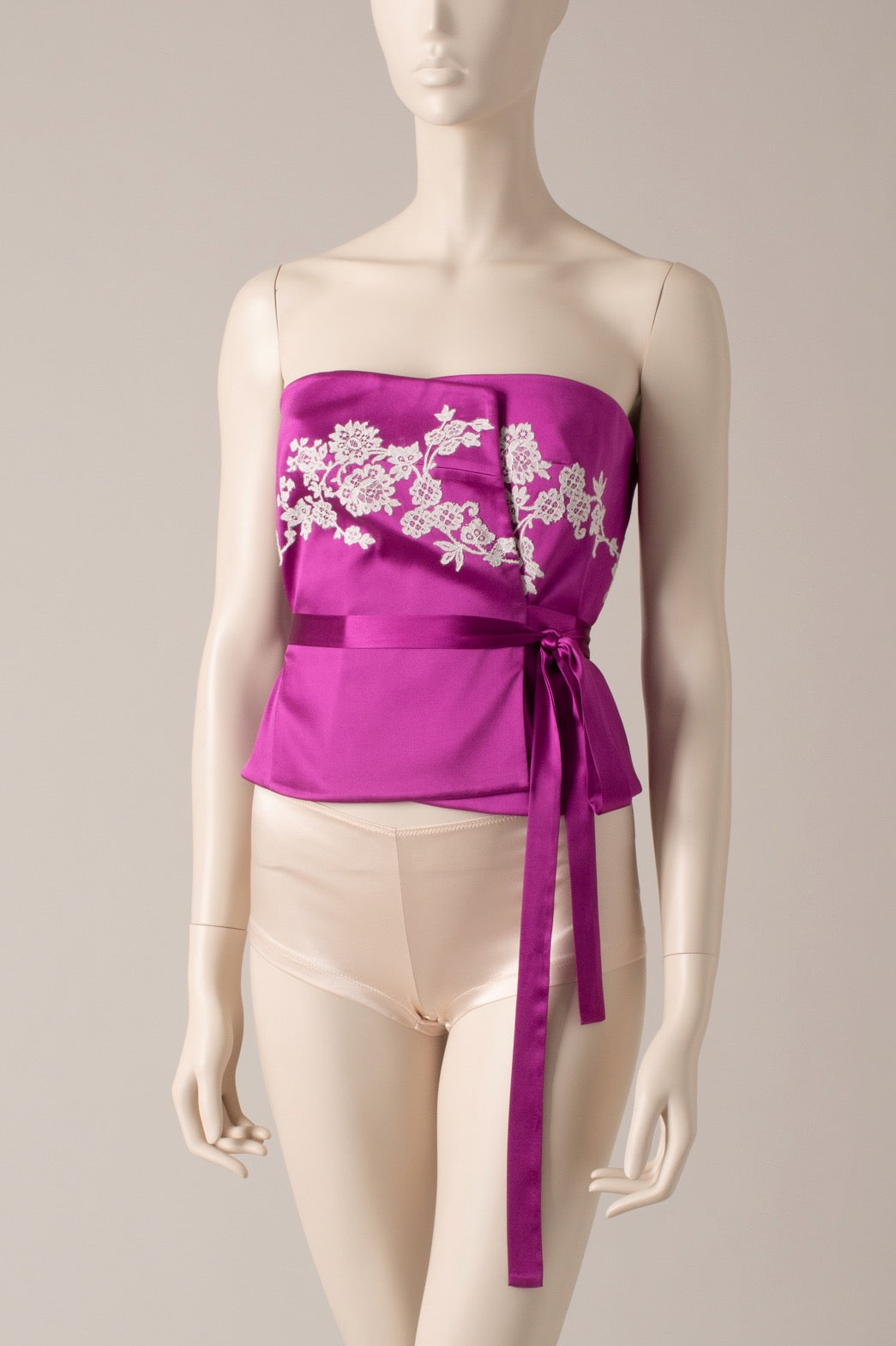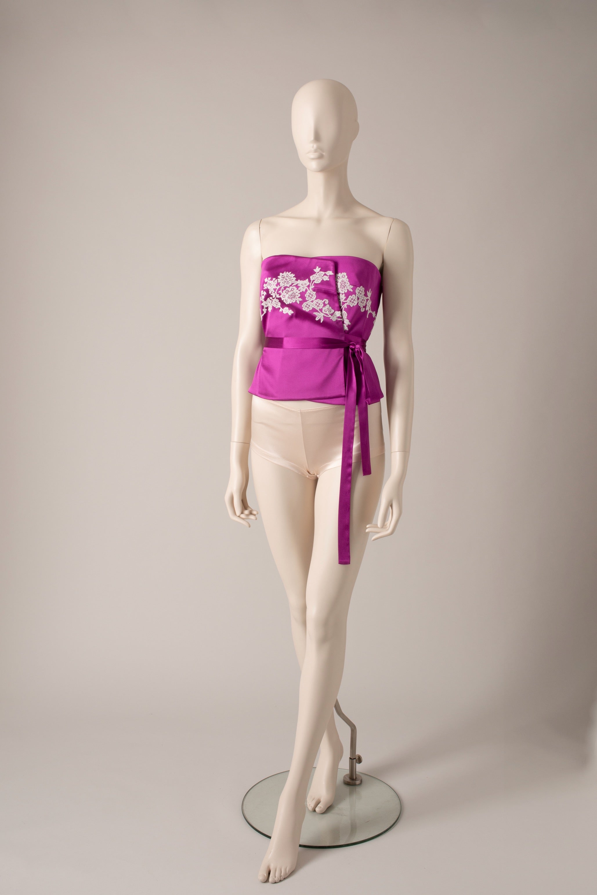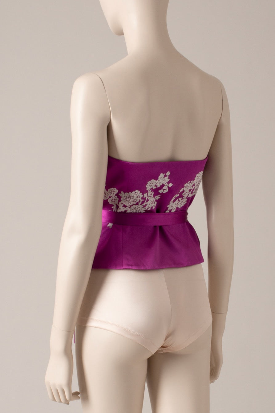 Bustier inspiré des ceintures Obi. Se noue grâce aux longs liens.