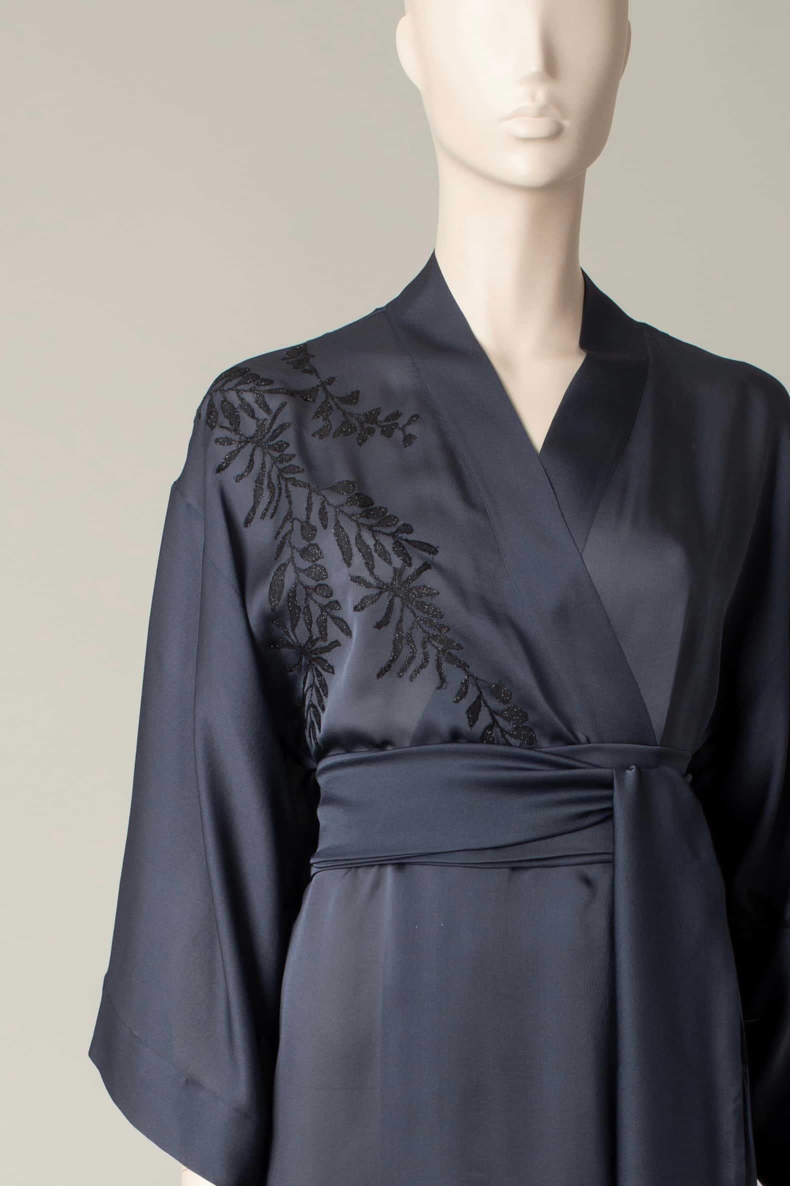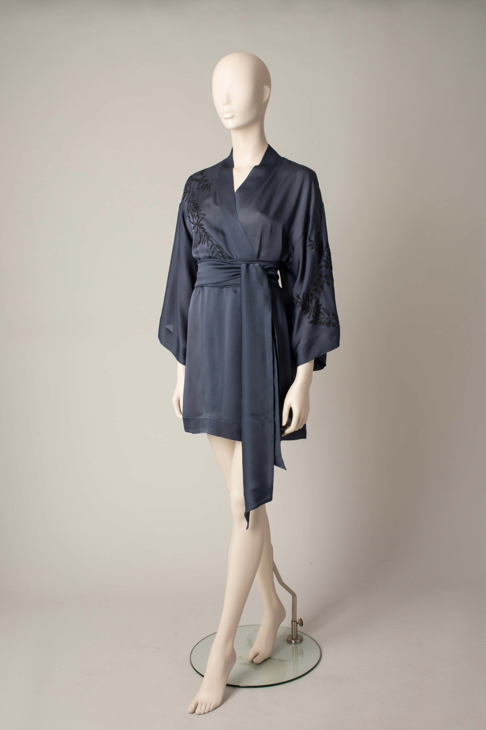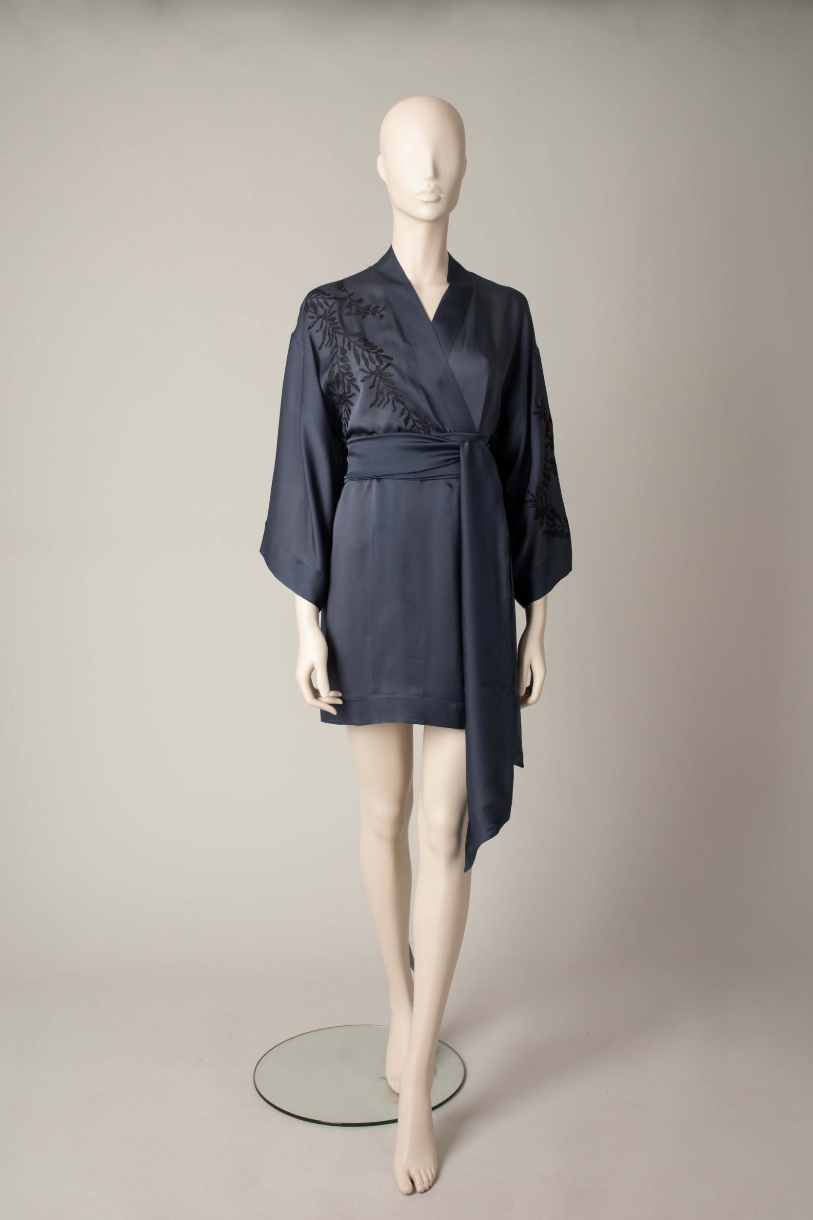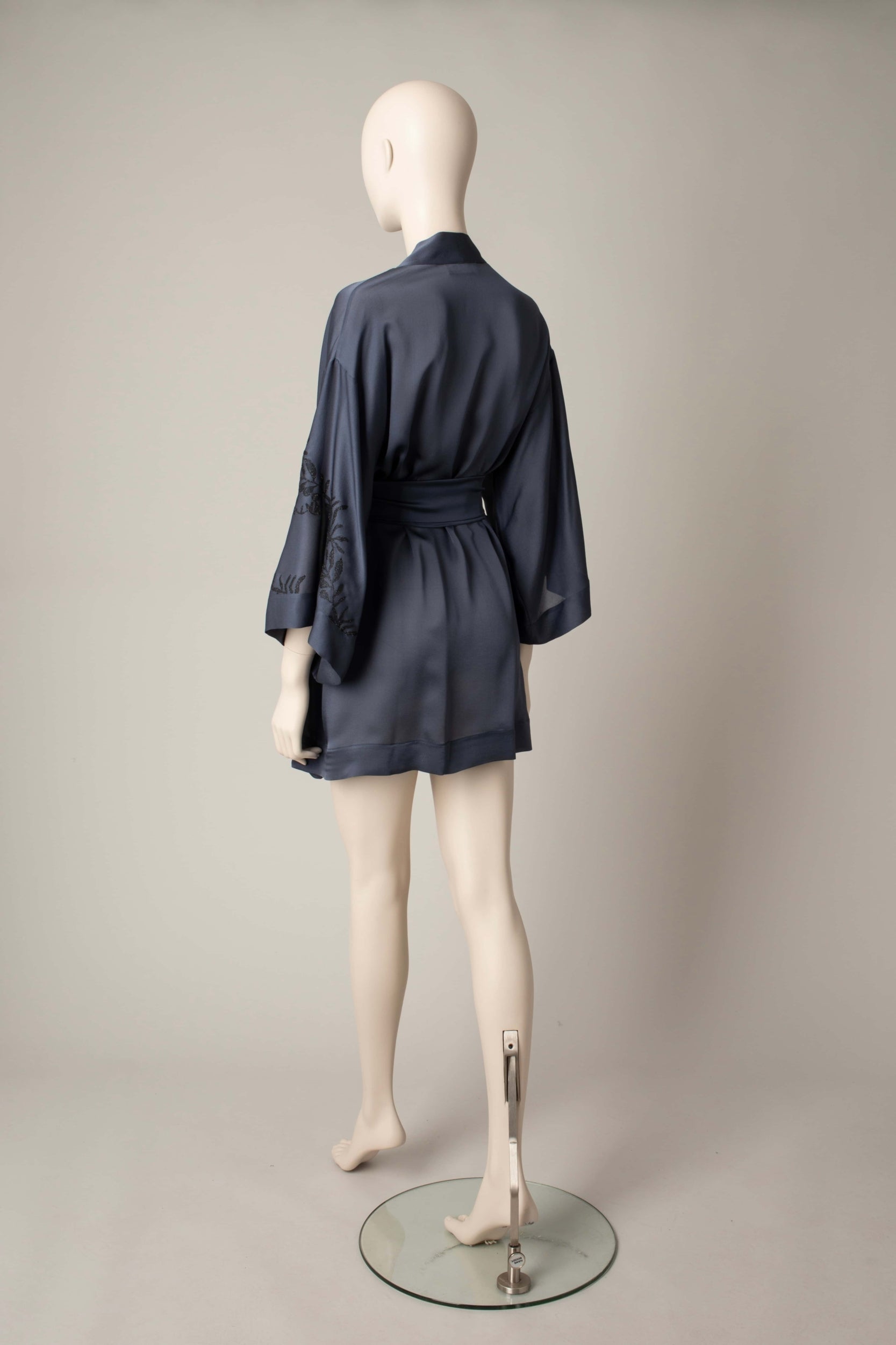 Short kimono in light silk with classic sleeves for a casual look. Sparkling Ephemere lace inlaid on the shoulder and the sleeve. Dropped shoulders - Wide 3/4 sleeves. Length : 83cm. Dark grey light silk with black sparkling lace. Belt : 15cm x 250cm approx